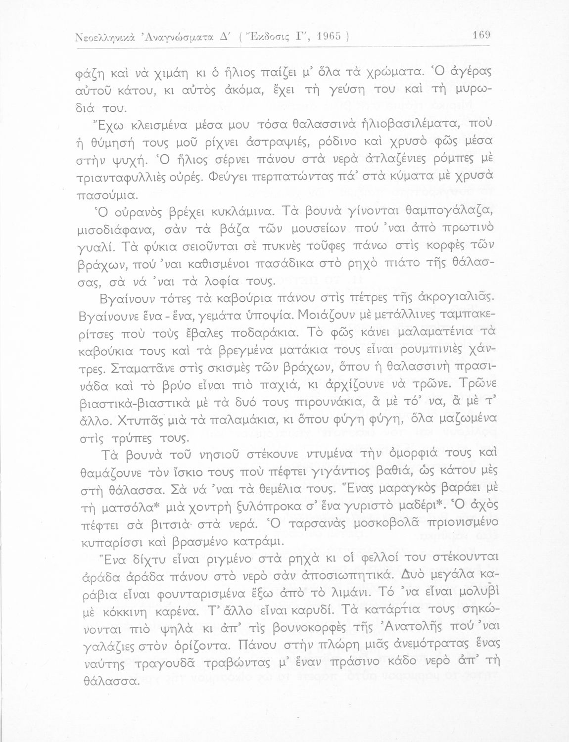 Σχολικό εγχειρίδιο Νέων Ελληνικών Δ' Γυμνασίου που περιλαμβάνει πεζά, ποιήματα και παροιμίες Ελλήνων συγγραφέων εμπνευσμένα από την θρησκευτική και κοινωνική ζωή, τη βυζαντινή ιστορία, την αρχαία και σύγχρονη ελληνική ιστορία, και την ελληνική φύση. Περιέχει παράρτημα με βιογραφίες των συγγραφέων και λεξιλόγιο.