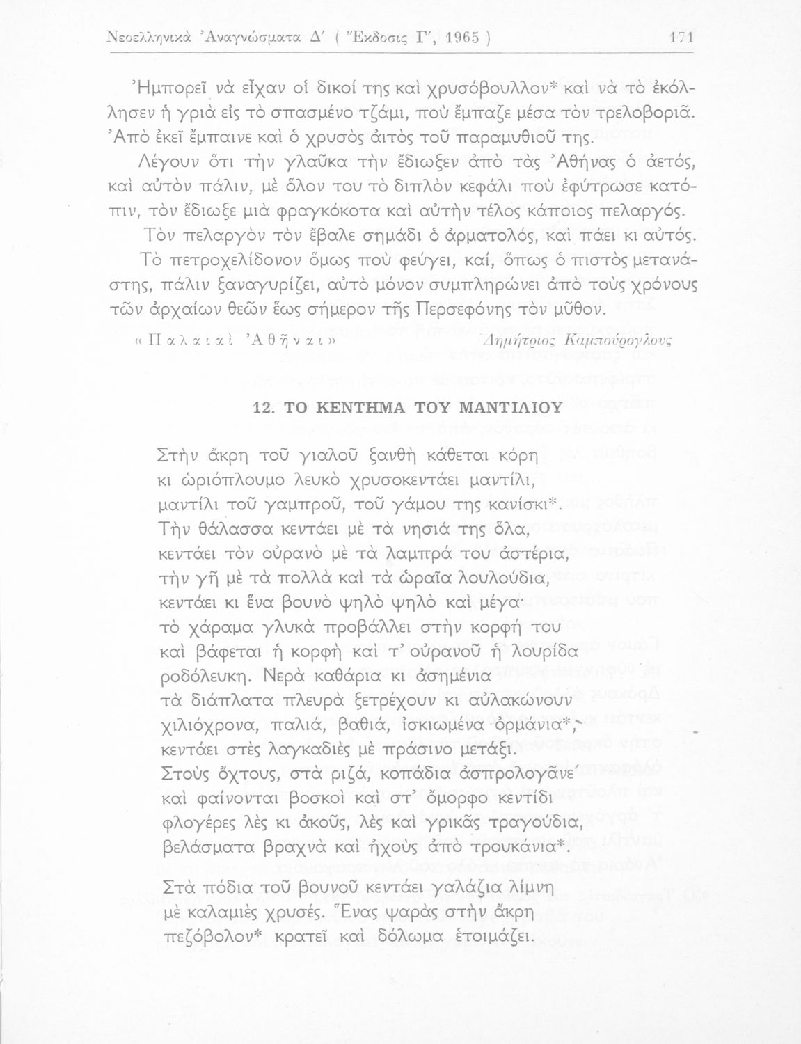 Σχολικό εγχειρίδιο Νέων Ελληνικών Δ΄ Γυμνασίου και Β΄ Αστικού Σχολείου που περιέχει πεζά και ποιήματα Ελλήνων συγγραφέων εμπνευσμένα από τη θρησκευτική και κοινωνική ζωή, την ελληνική μυθολογία, την αρχαία και