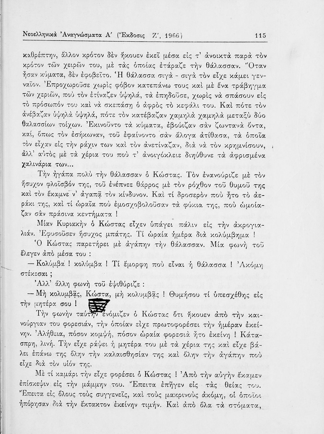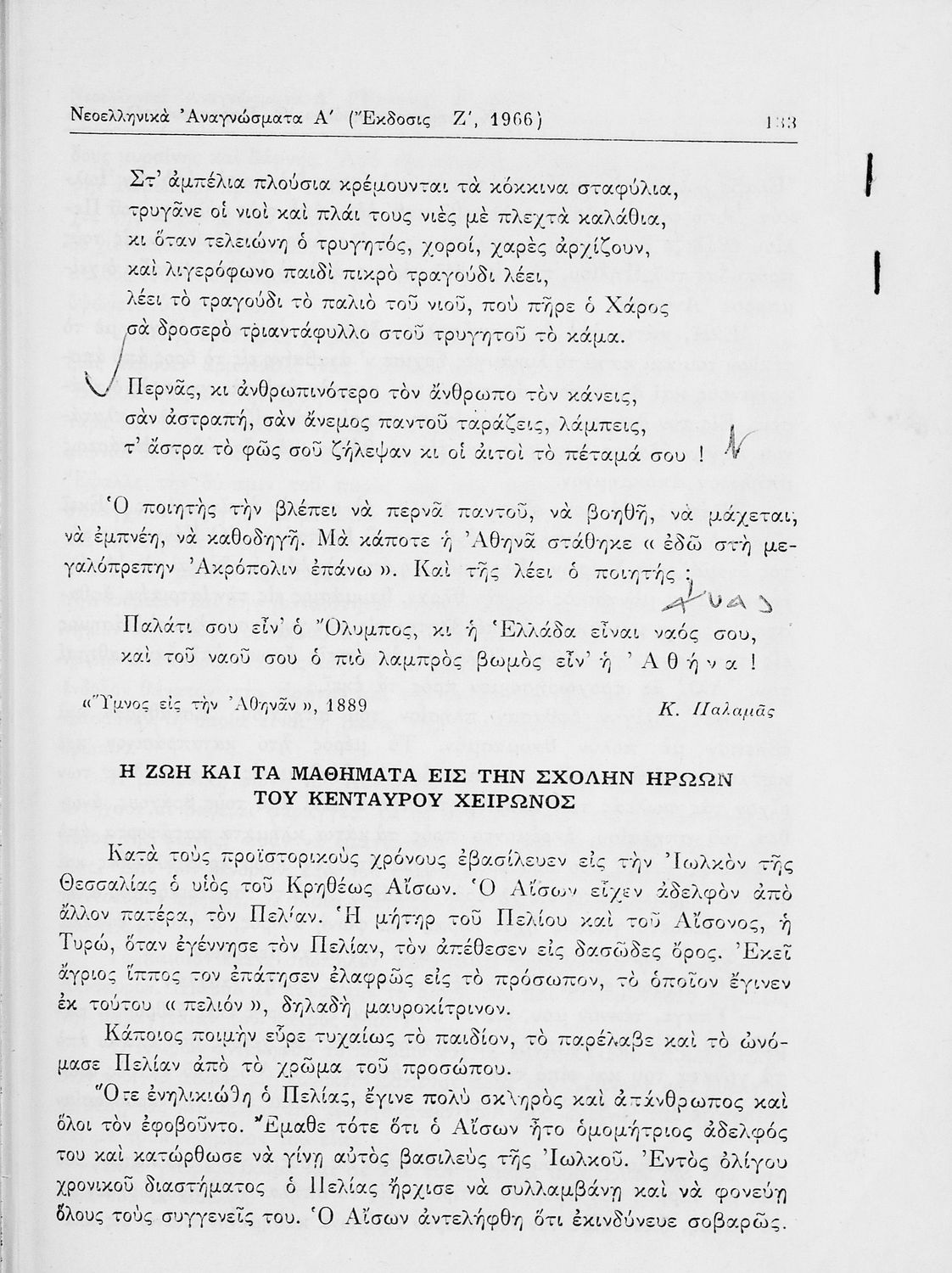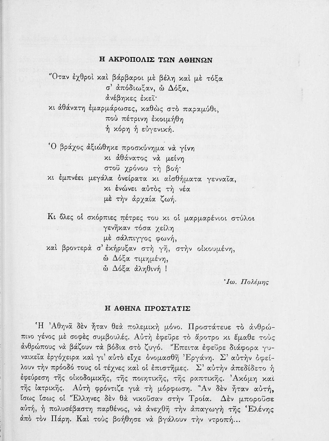 Σχολικό εγχειρίδιο Νέων Ελληνικών Γ΄ Γυμνασίου και Α' Αστικού Σχολείου που περιέχει πεζά και ποιήματα Ελλήνων συγγραφέων εμπνευσμένα από τη θρησκευτική και κοινωνική ζωή, την ελληνική μυθολογία, την αρχαία και