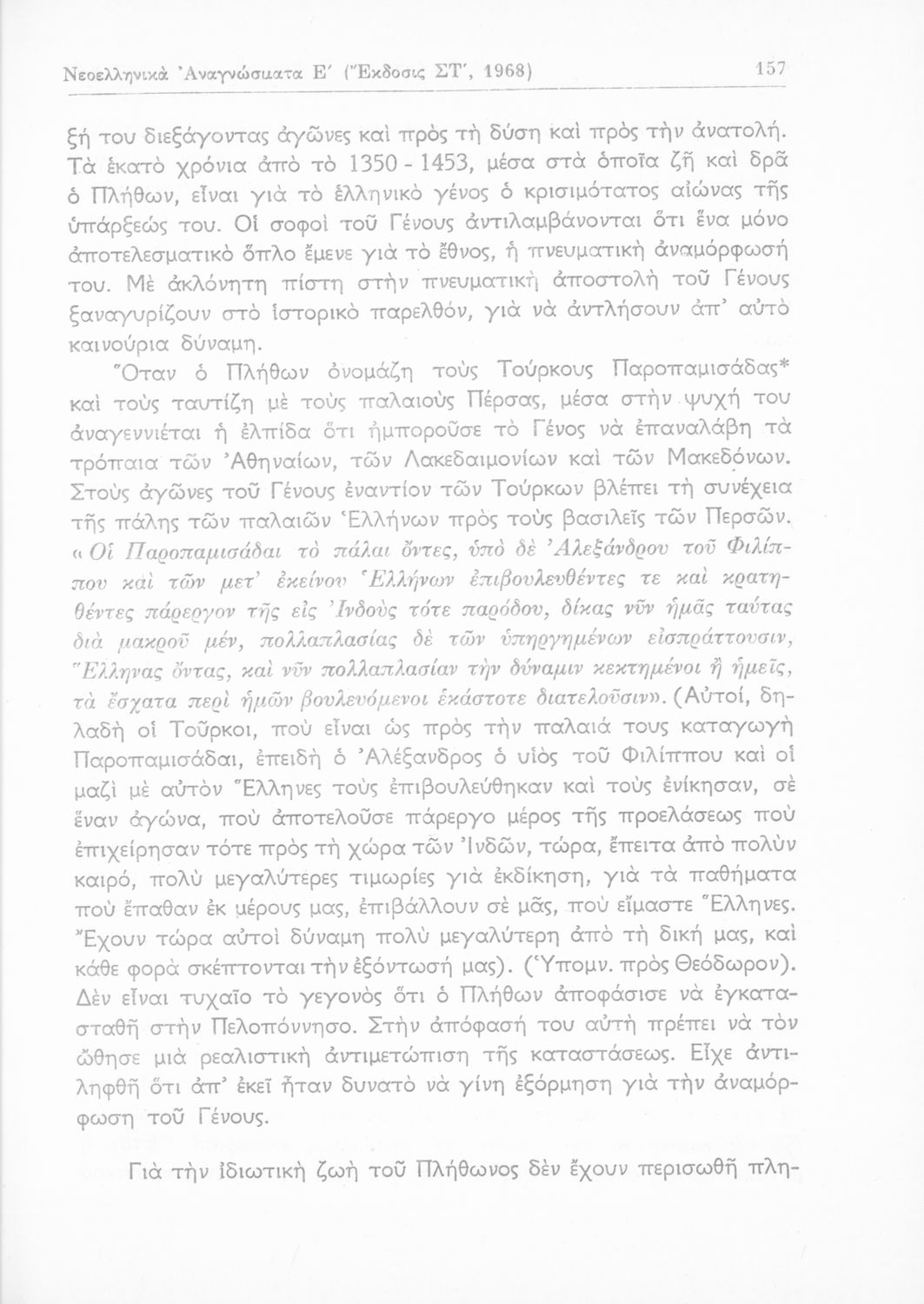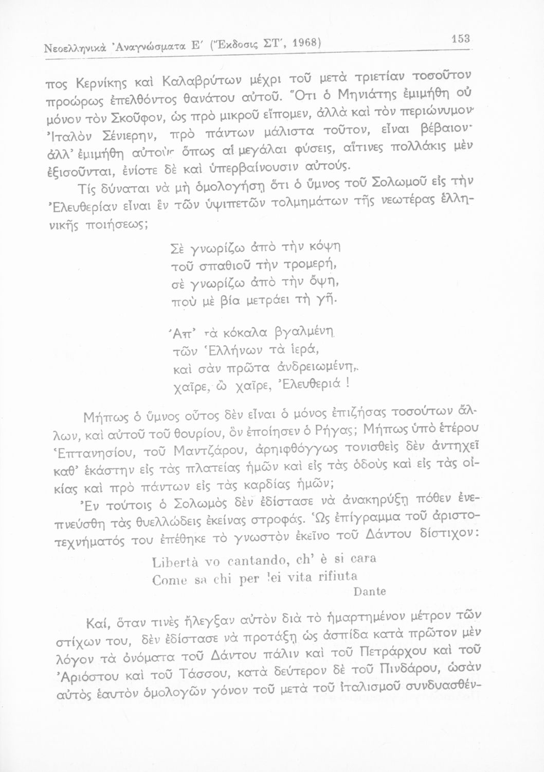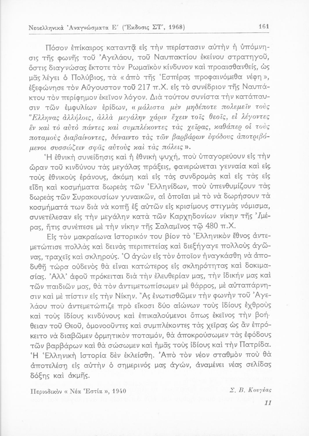 Σχολικό εγχειρίδιο Νέων Ελληνικών Ε΄ Γυμνασίου που περιέχει πεζά και ποιήματα συγγραφέων της βυζαντινής και μεταβυζαντινής περιόδου πατριωτικού και θρησκευτικού περιεχομένου. Περιλαμβάνει και πεζά και ποιήματα Ελλήνων και δημοτικά τραγούδια πατριωτικού περιεχομένου και παράρτημα με βιογραφίες των συγγραφέων και λεξιλόγιο. Φέρει το σύμβολο της δικτατορίας.