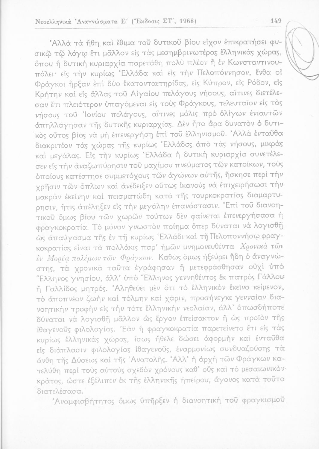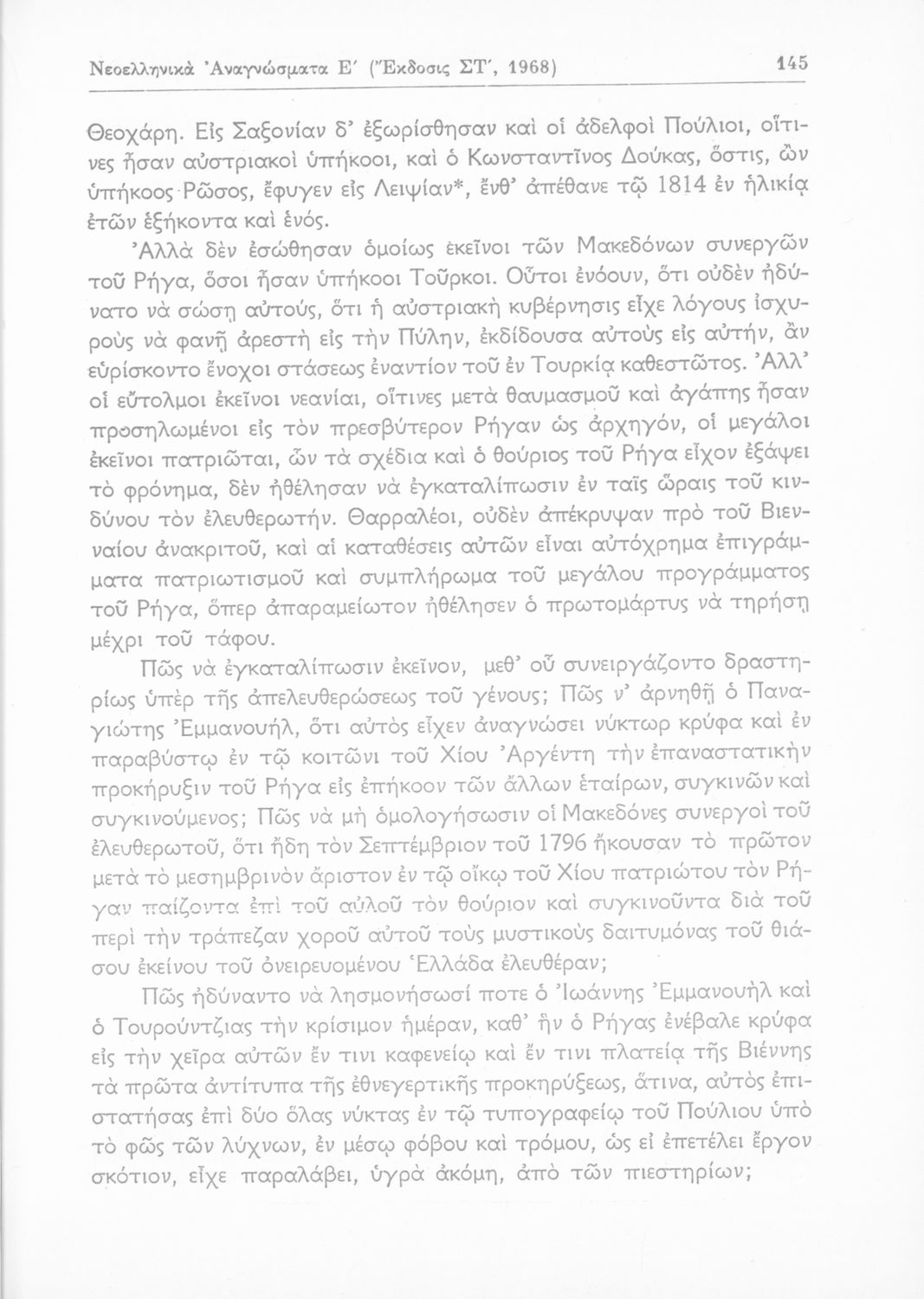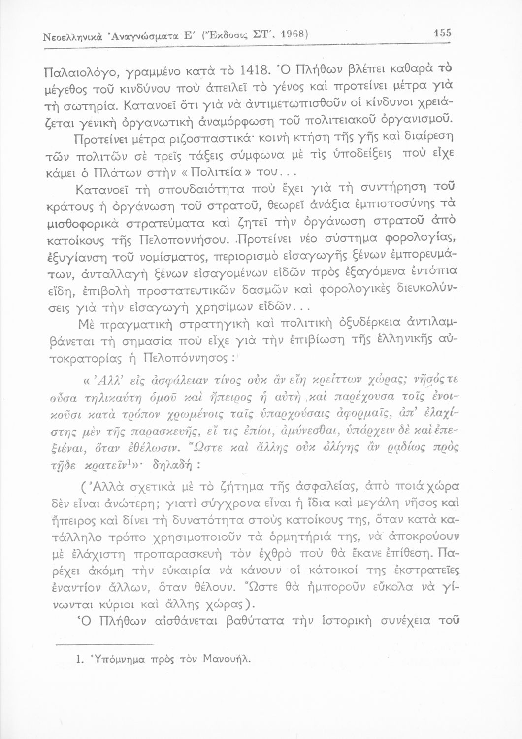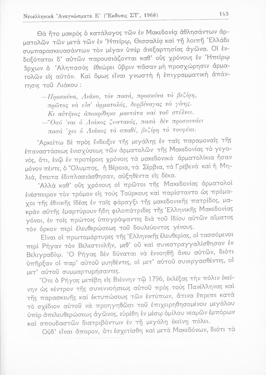 Σχολικό εγχειρίδιο Νέων Ελληνικών Ε΄ Γυμνασίου που περιέχει πεζά και ποιήματα συγγραφέων της βυζαντινής και μεταβυζαντινής περιόδου πατριωτικού και θρησκευτικού περιεχομένου. Περιλαμβάνει και πεζά και ποιήματα Ελλήνων και δημοτικά τραγούδια πατριωτικού περιεχομένου και παράρτημα με βιογραφίες των συγγραφέων και λεξιλόγιο. Φέρει το σύμβολο της δικτατορίας.