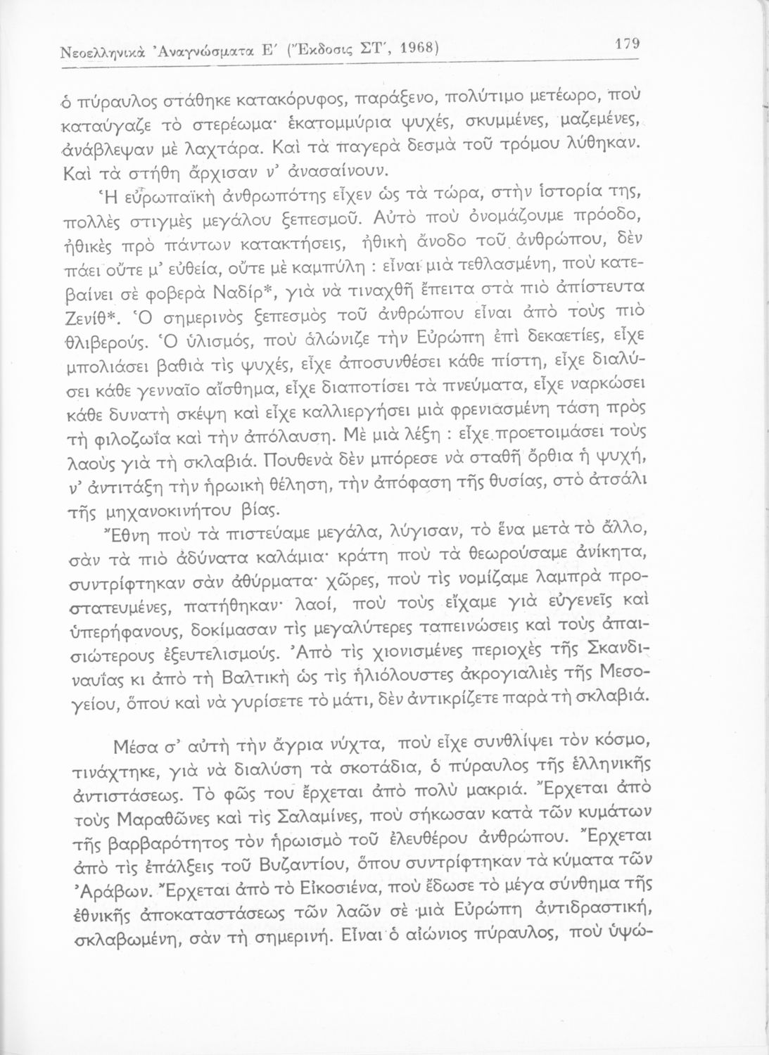 Σχολικό εγχειρίδιο Νέων Ελληνικών Ε΄ Γυμνασίου που περιέχει πεζά και ποιήματα συγγραφέων της βυζαντινής και μεταβυζαντινής περιόδου πατριωτικού και θρησκευτικού περιεχομένου. Περιλαμβάνει και πεζά και ποιήματα Ελλήνων και δημοτικά τραγούδια πατριωτικού περιεχομένου και παράρτημα με βιογραφίες των συγγραφέων και λεξιλόγιο. Φέρει το σύμβολο της δικτατορίας.