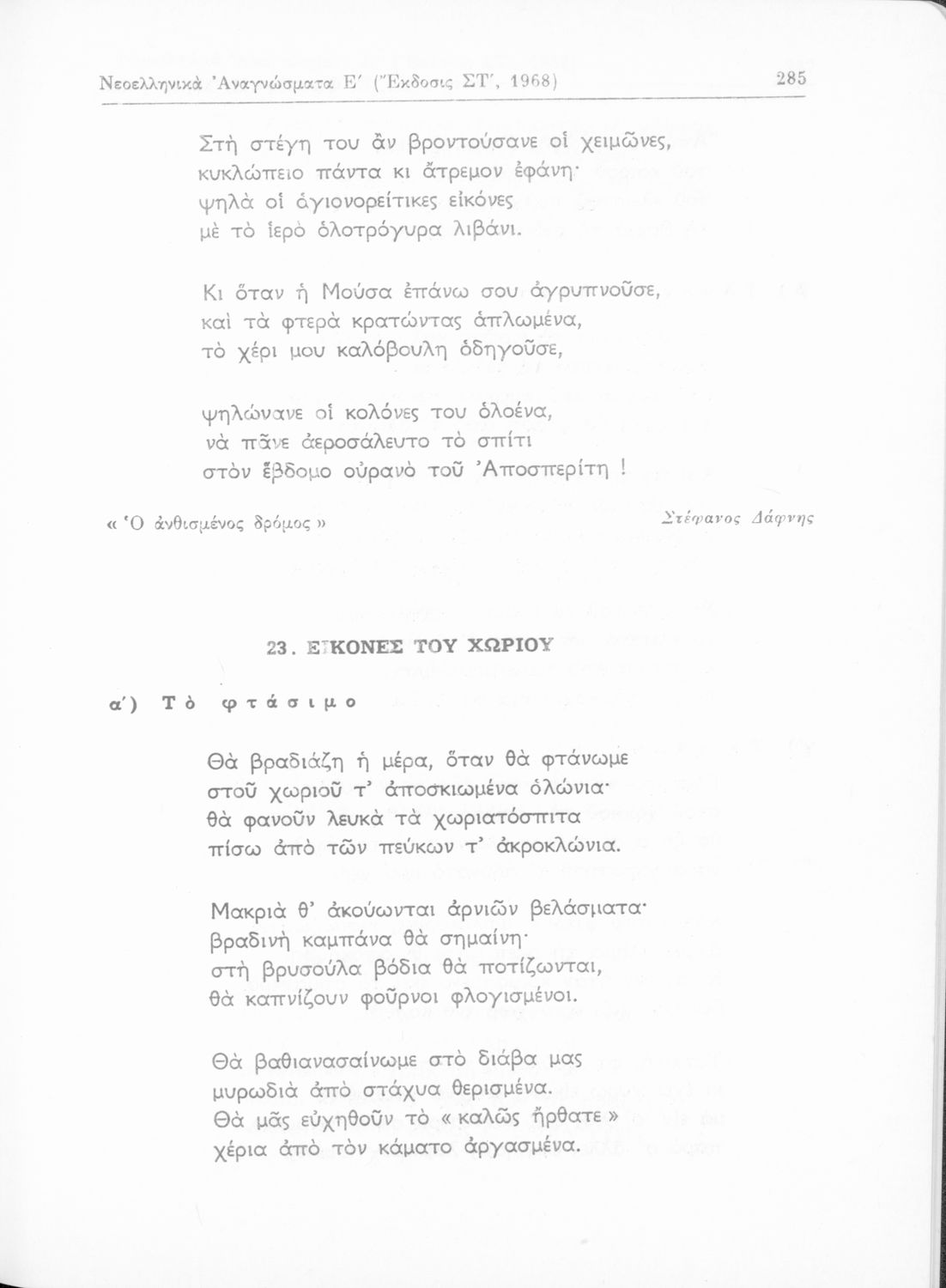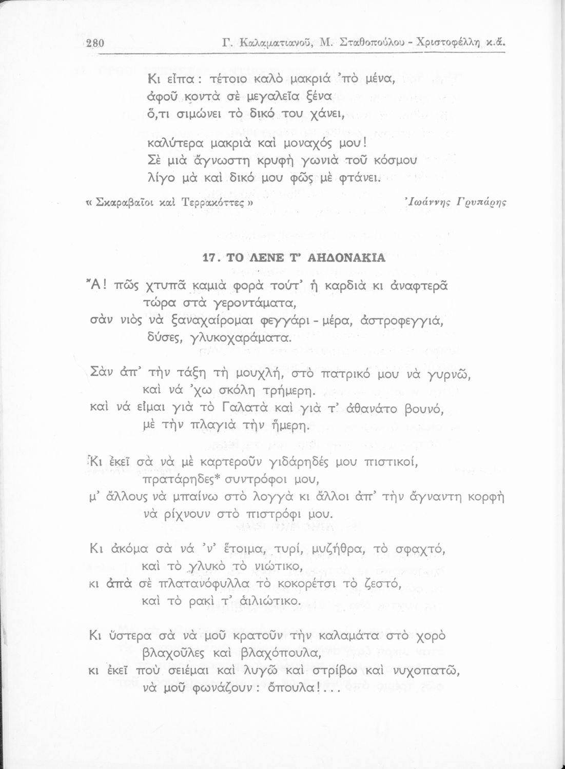 Σχολικό εγχειρίδιο Νέων Ελληνικών Ε΄ Γυμνασίου που περιλαμβάνει κείμενα Ελλήνων συγγραφέων και δημοτικά τραγούδια με θέματα από την σύγχρονη ελληνική ιστορία, τη θρησκευτική παράδοση, την οικογενειακή ζωή, και