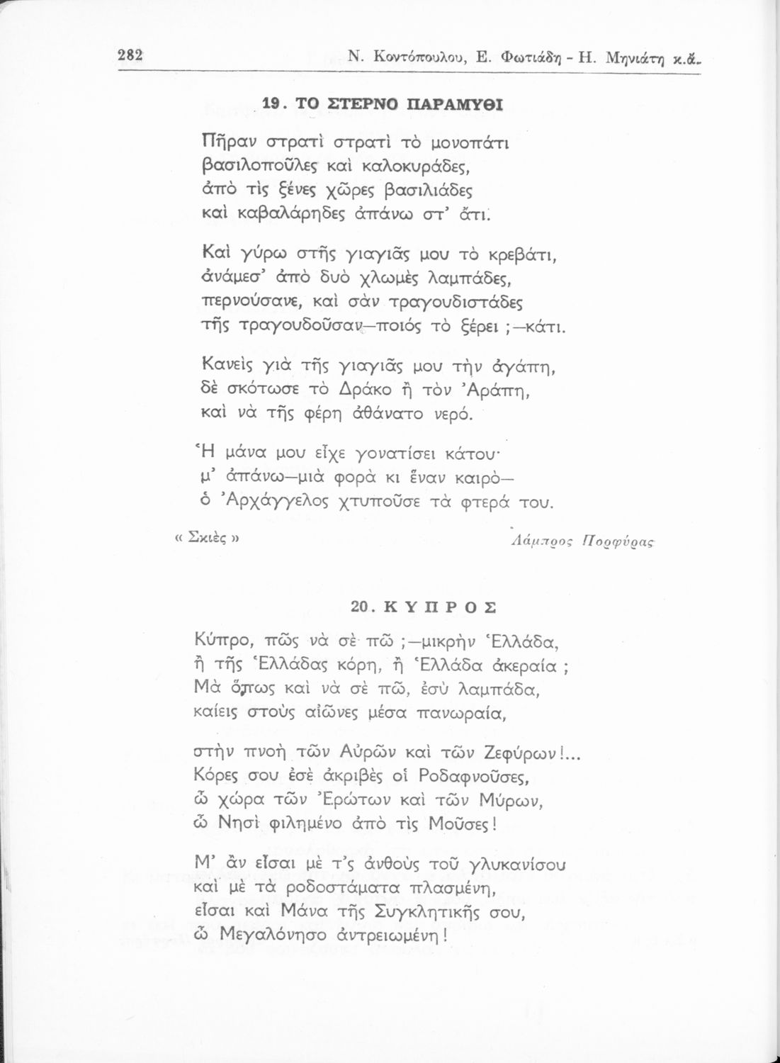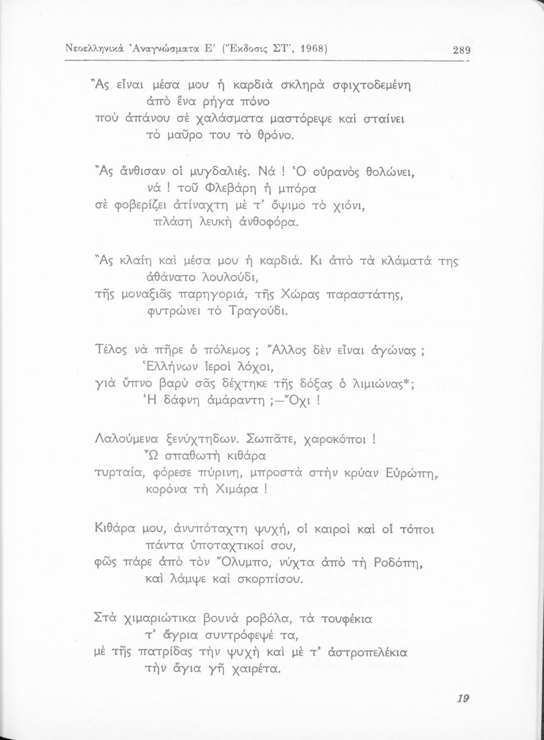 Σχολικό εγχειρίδιο Νέων Ελληνικών Ε΄ Γυμνασίου που περιέχει πεζά και ποιήματα συγγραφέων της βυζαντινής και μεταβυζαντινής περιόδου πατριωτικού και θρησκευτικού περιεχομένου. Περιλαμβάνει και πεζά και ποιήματα Ελλήνων και δημοτικά τραγούδια πατριωτικού περιεχομένου και παράρτημα με βιογραφίες των συγγραφέων και λεξιλόγιο. Φέρει το σύμβολο της δικτατορίας.