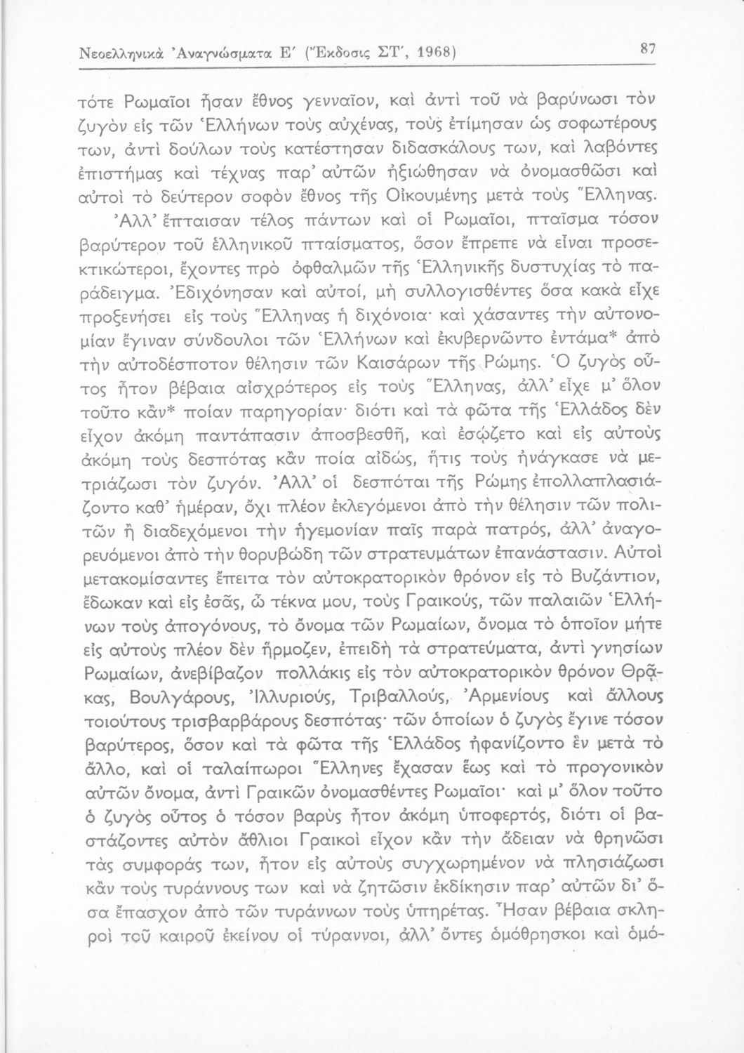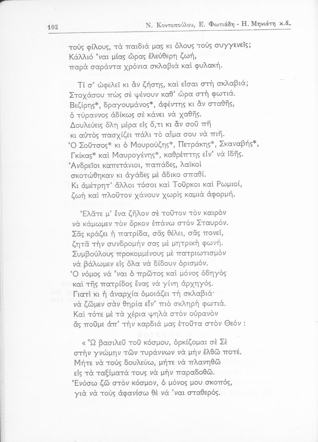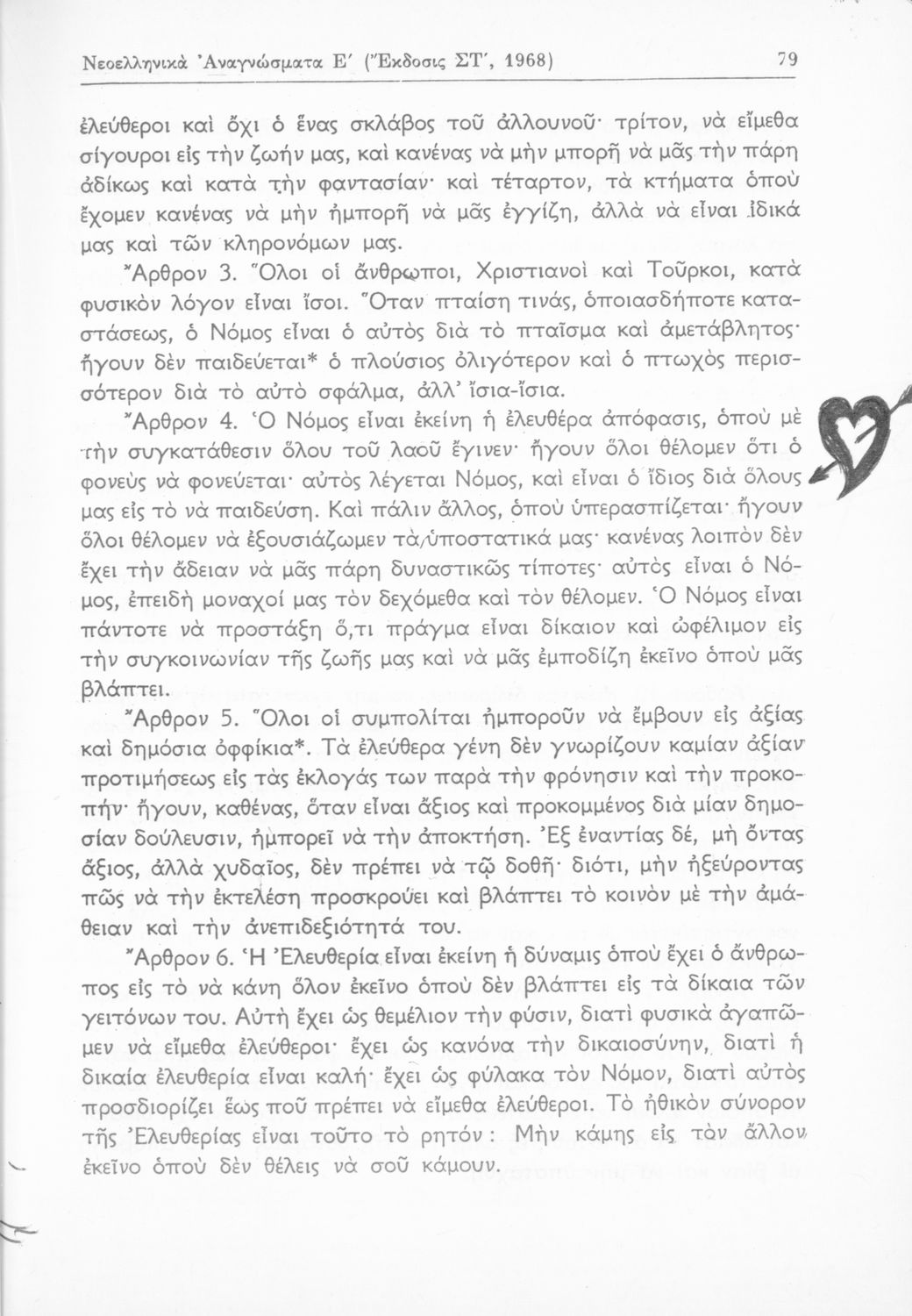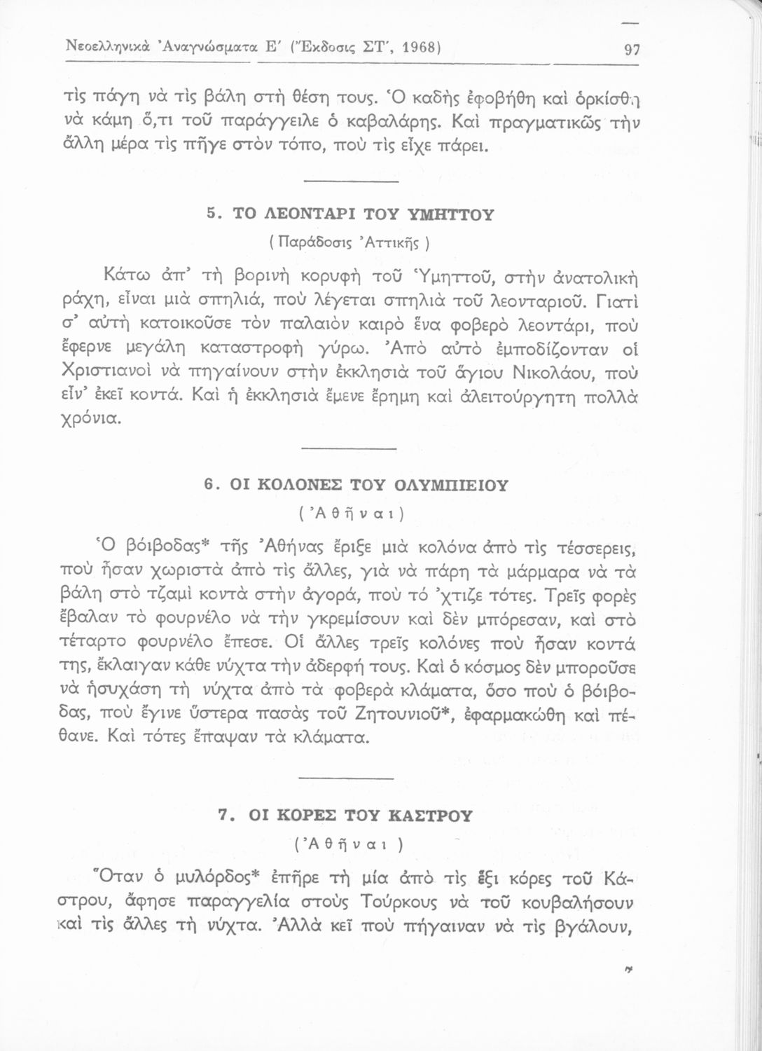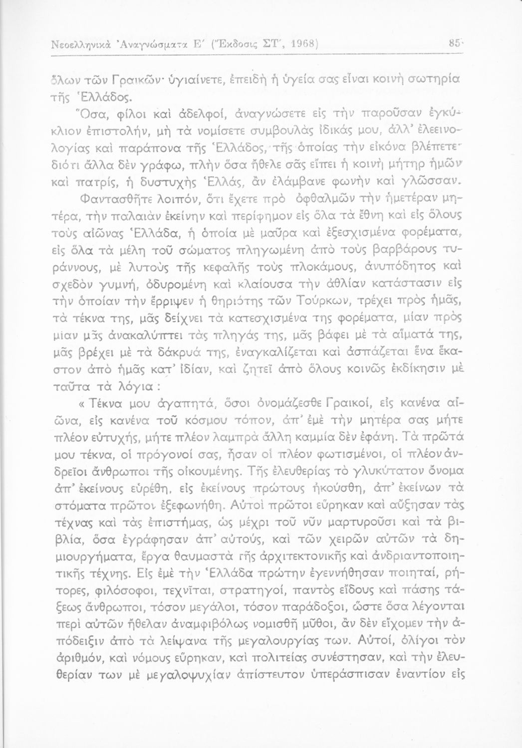 Σχολικό εγχειρίδιο Νέων Ελληνικών Ε΄ Γυμνασίου που περιέχει πεζά και ποιήματα συγγραφέων της βυζαντινής και μεταβυζαντινής περιόδου πατριωτικού και θρησκευτικού περιεχομένου. Περιλαμβάνει και πεζά και ποιήματα Ελλήνων και δημοτικά τραγούδια πατριωτικού περιεχομένου και παράρτημα με βιογραφίες των συγγραφέων και λεξιλόγιο. Φέρει το σύμβολο της δικτατορίας.