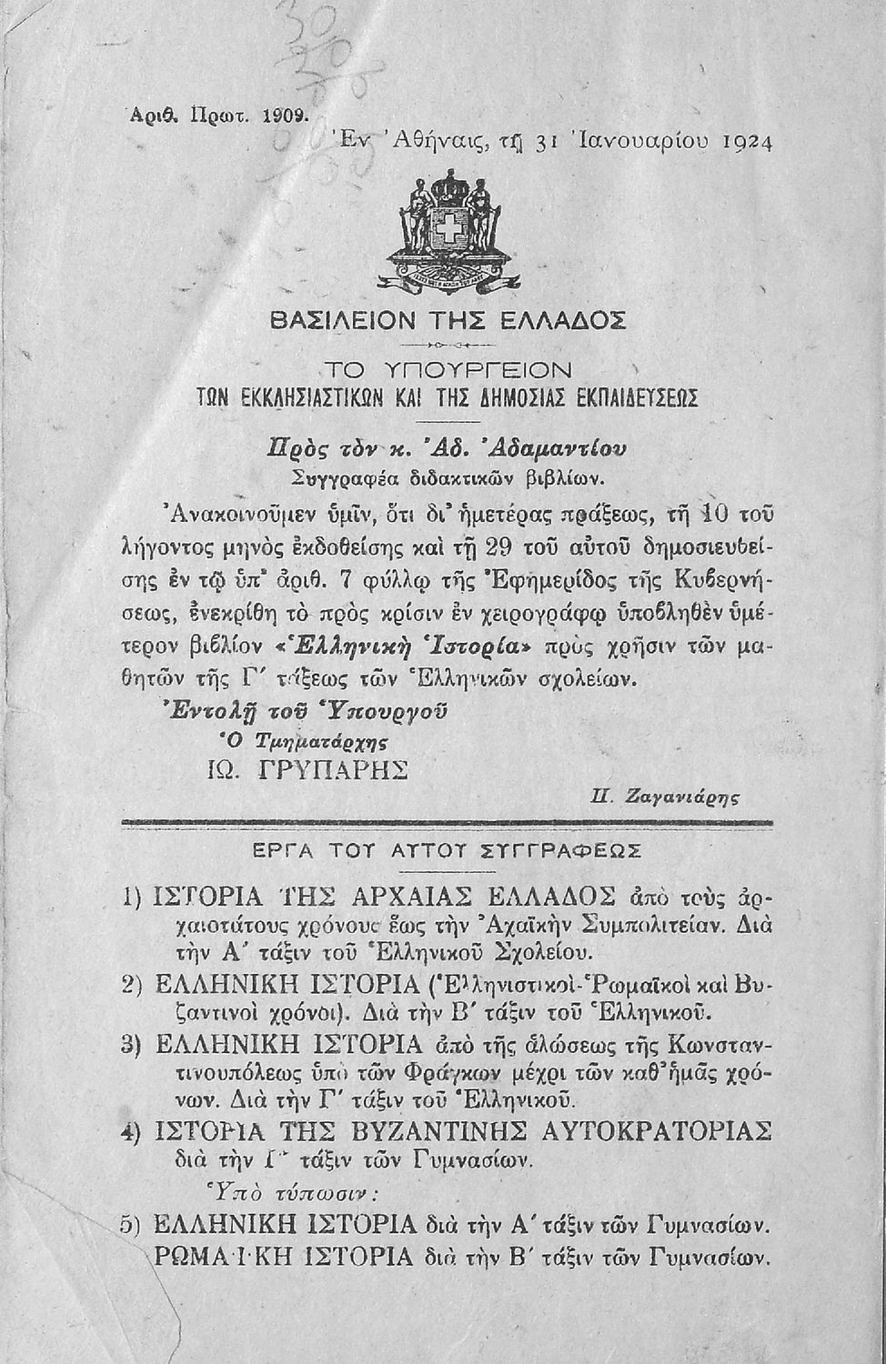 Υπουργική απόφαση / Σύμβαση: 1909/31-1-1924