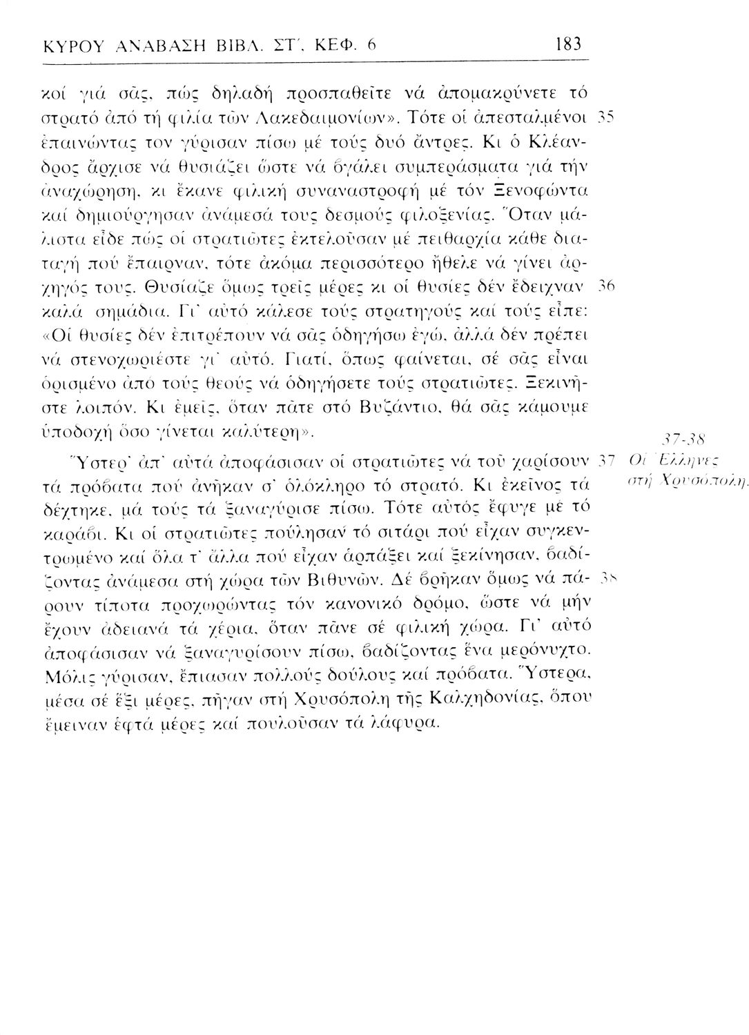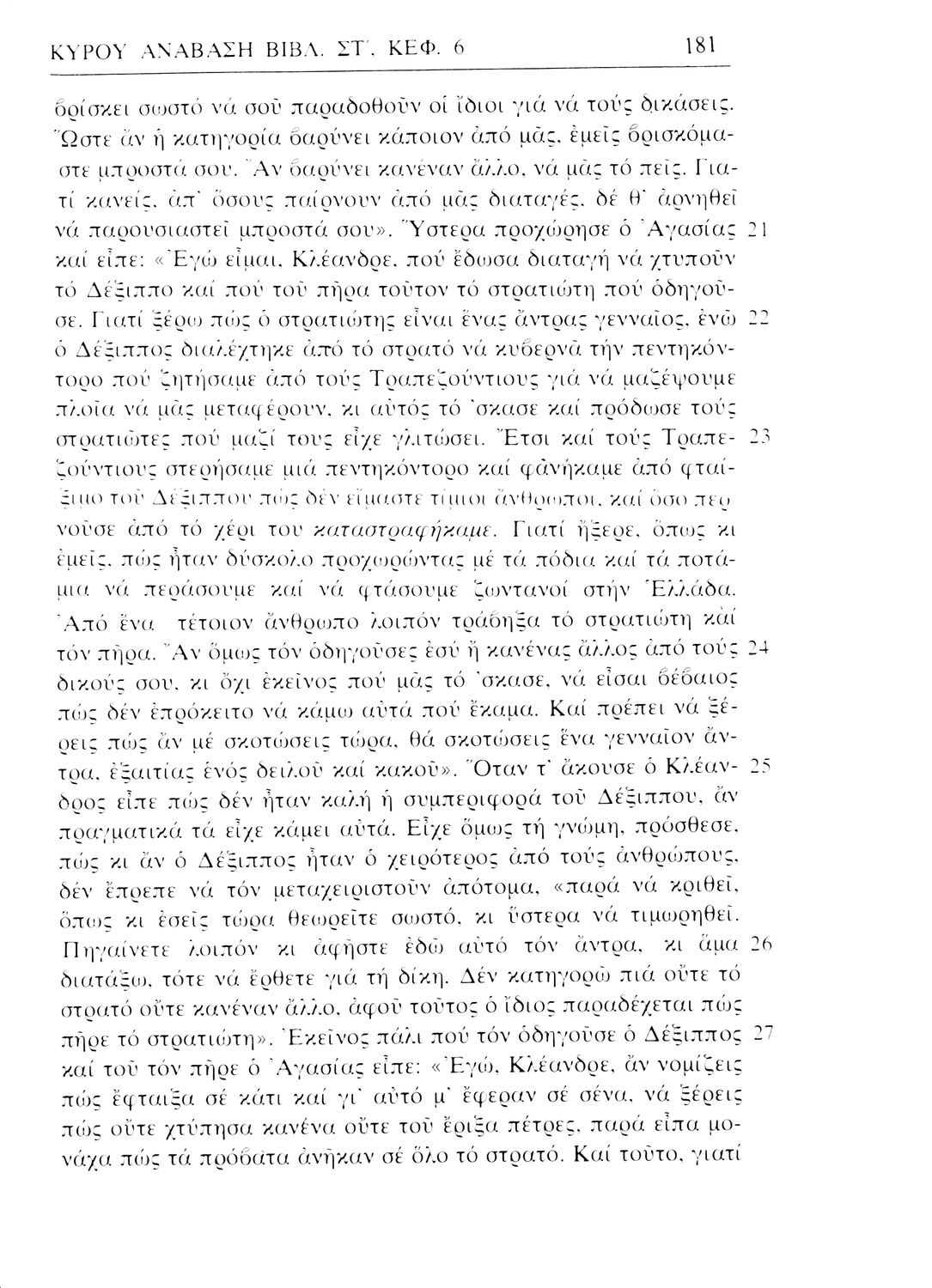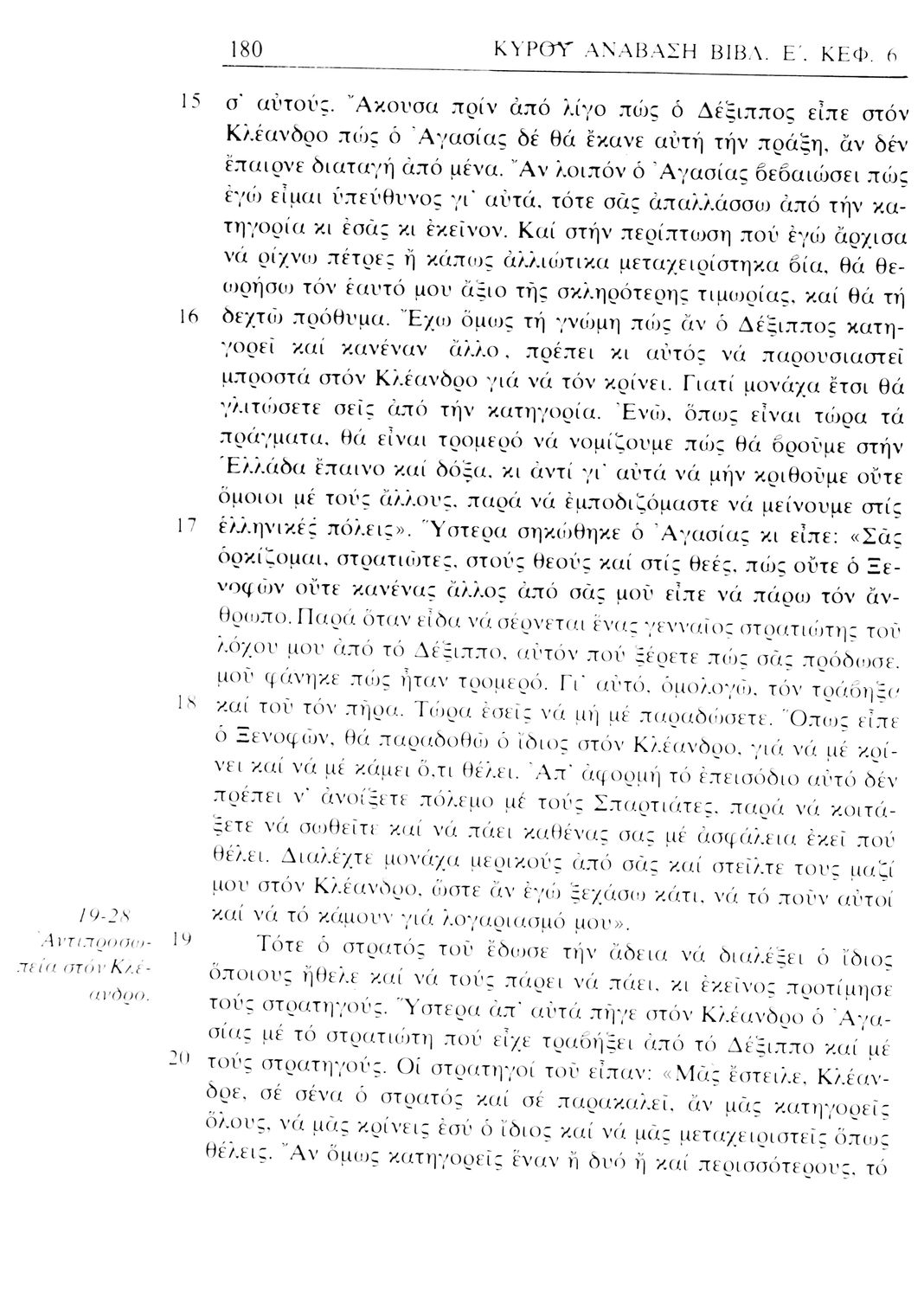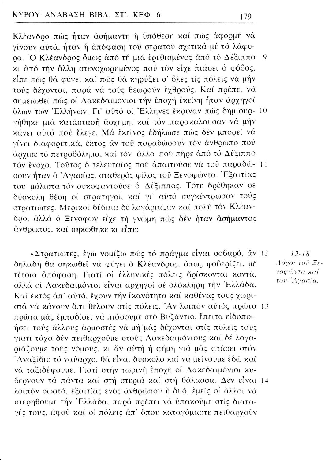 Σχολικό εγχειρίδιο Αρχαίων Ελληνικών. Αρχικά ένα εισαγωγικό σημείωμα αναφέρεται στη ζωή και το έργο του Ξενοφώντα και ακολουθεί το έργο του "Κύρου Ανάβασις". Στο εγχειρίδιο παραθέτονται σε περίληψη το Πρώτο και Έβδομο βιβλίο και σε μεταφρασμένο κείμενο το Δεύτερο, Τρίτο, Τέταρτο, Πέμπτο και Έκτο βιβλίο. Ακολουθούν σημειώσεις πάνω στα κείμενα τα οποία διανθίζονται από έγχρωμες εικόνες που παραχωρήθηκαν από την «Εκδοτική Αθηνών Α.Ε.»