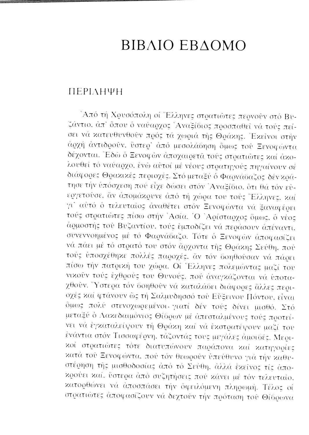 Σχολικό εγχειρίδιο Αρχαίων Ελληνικών. Από τα εφτά μέρη της "Κύρου Ανάβασις" του Ξενοφώντα που περιέχονται στο εγχειρίδιο το Πρώτο και το Έβδομο αναφέρονται περιληπτικά. Στο βιβλίο περιλαμβάνονται εισαγωγικό ...