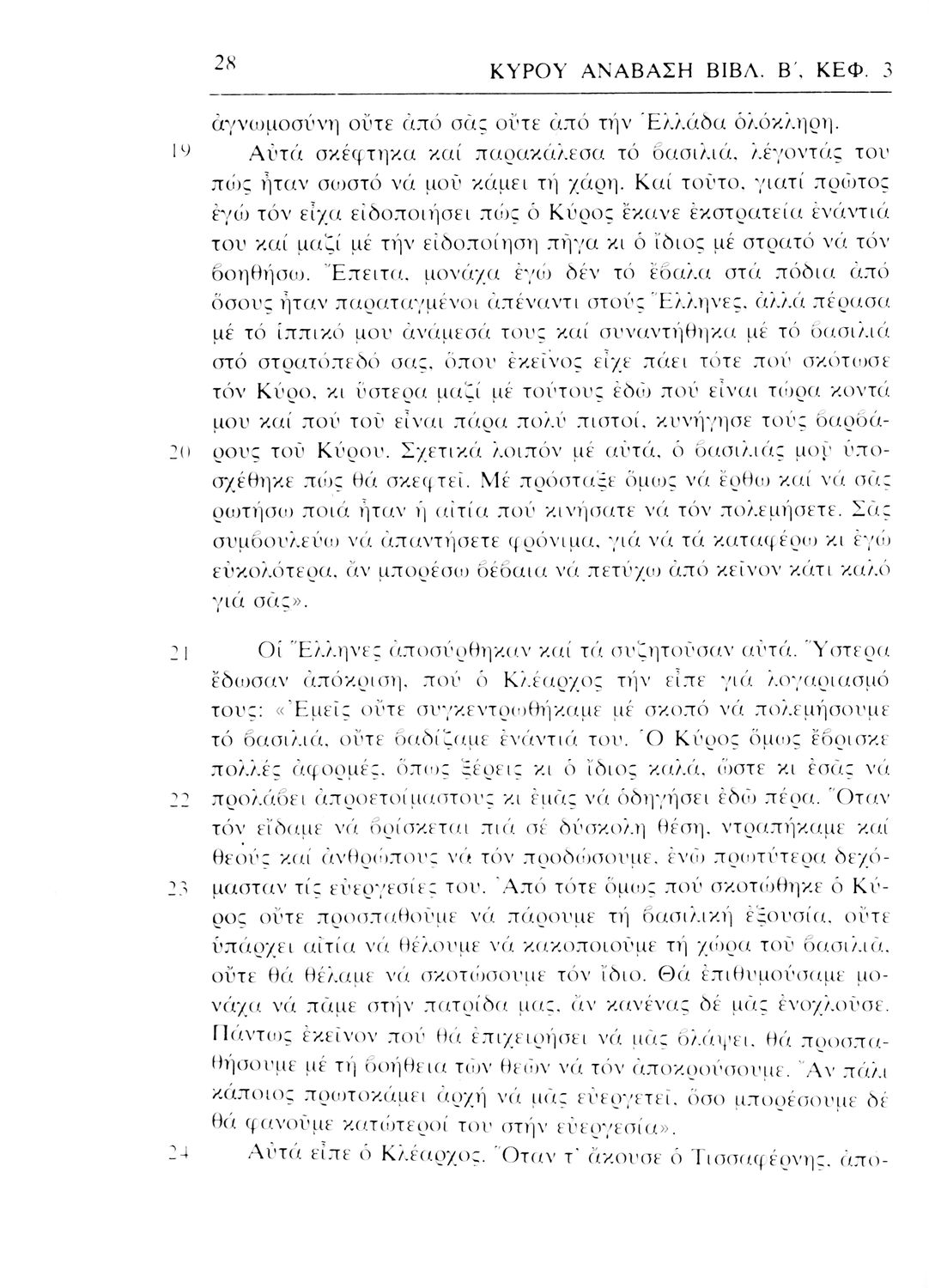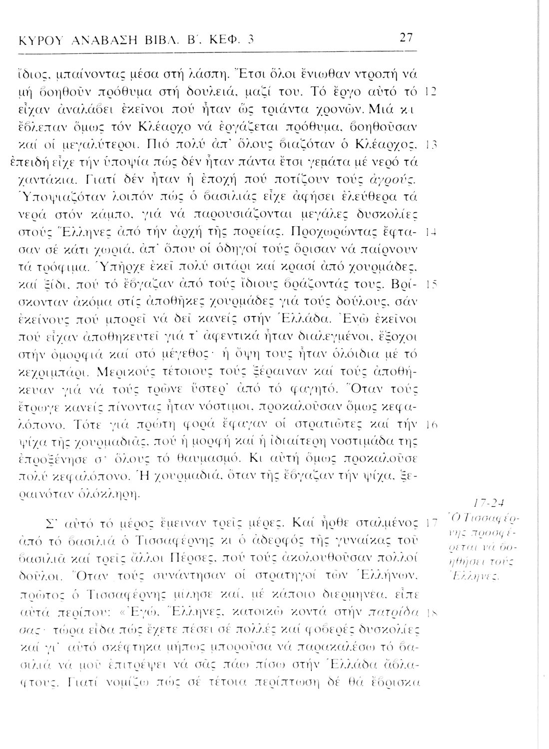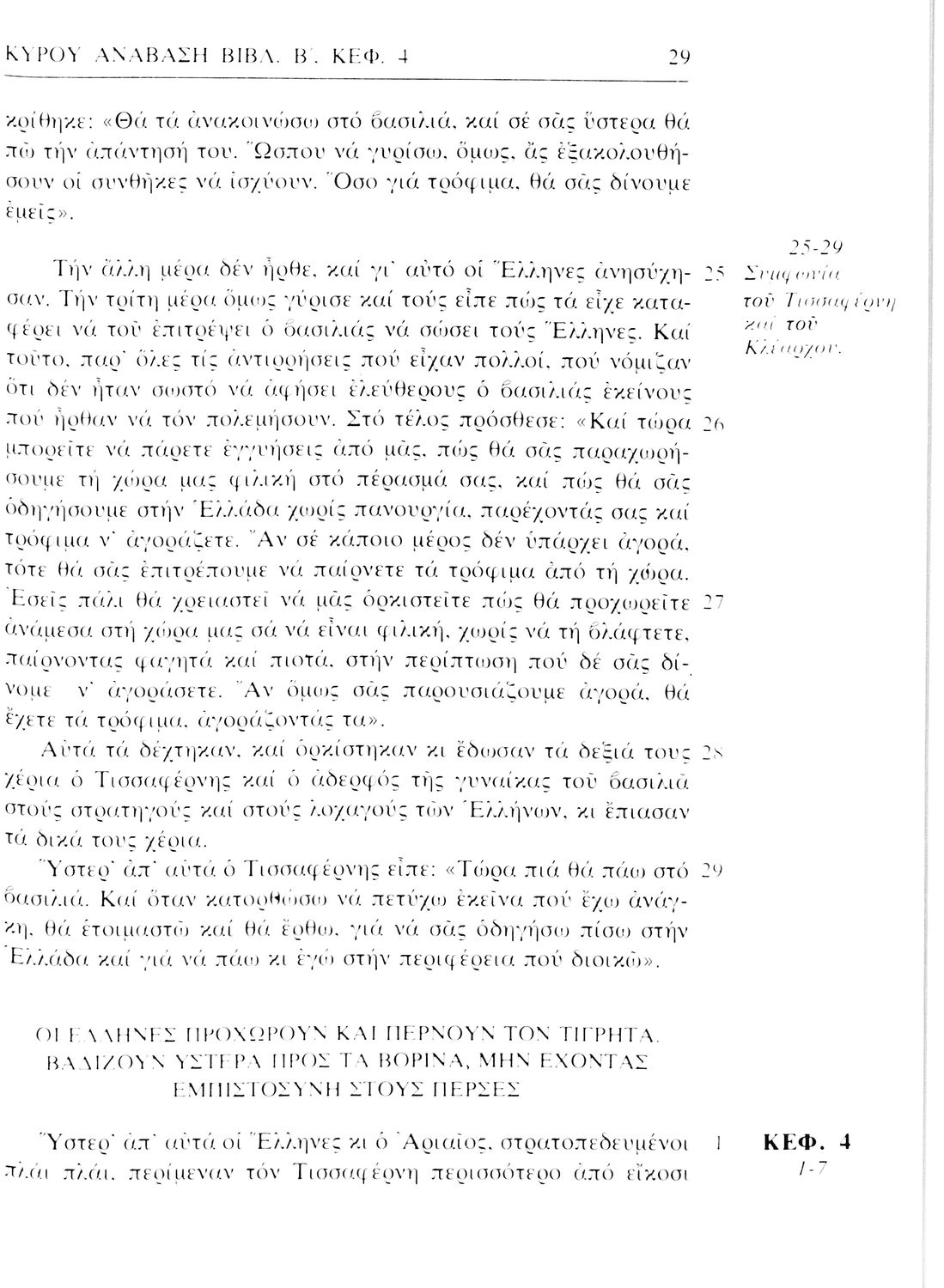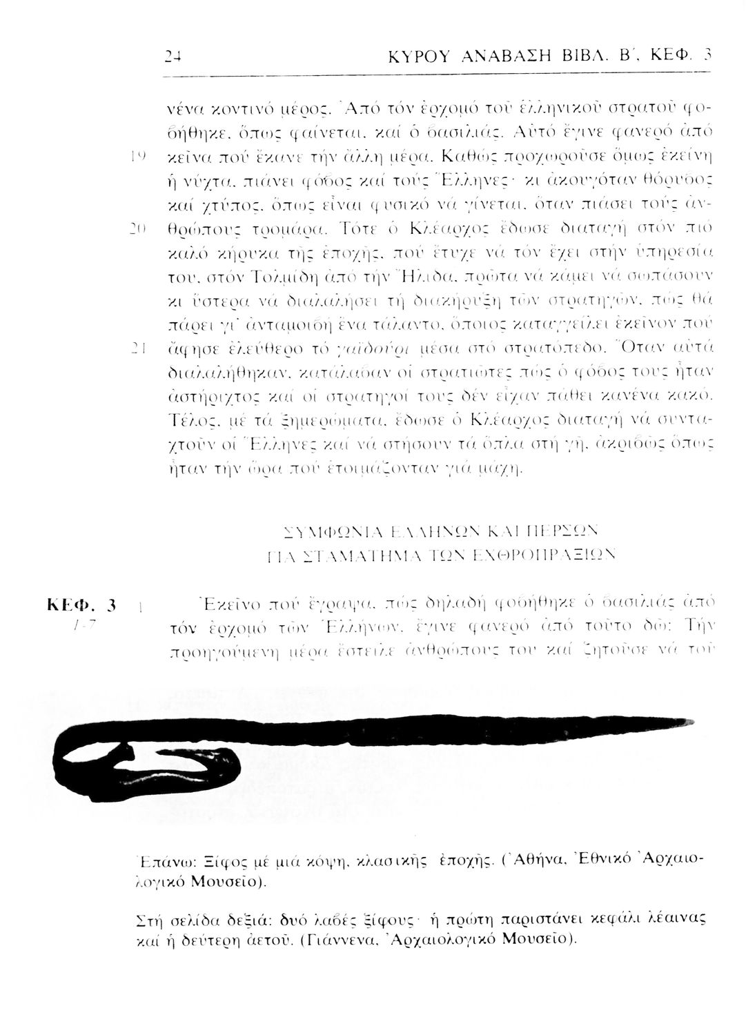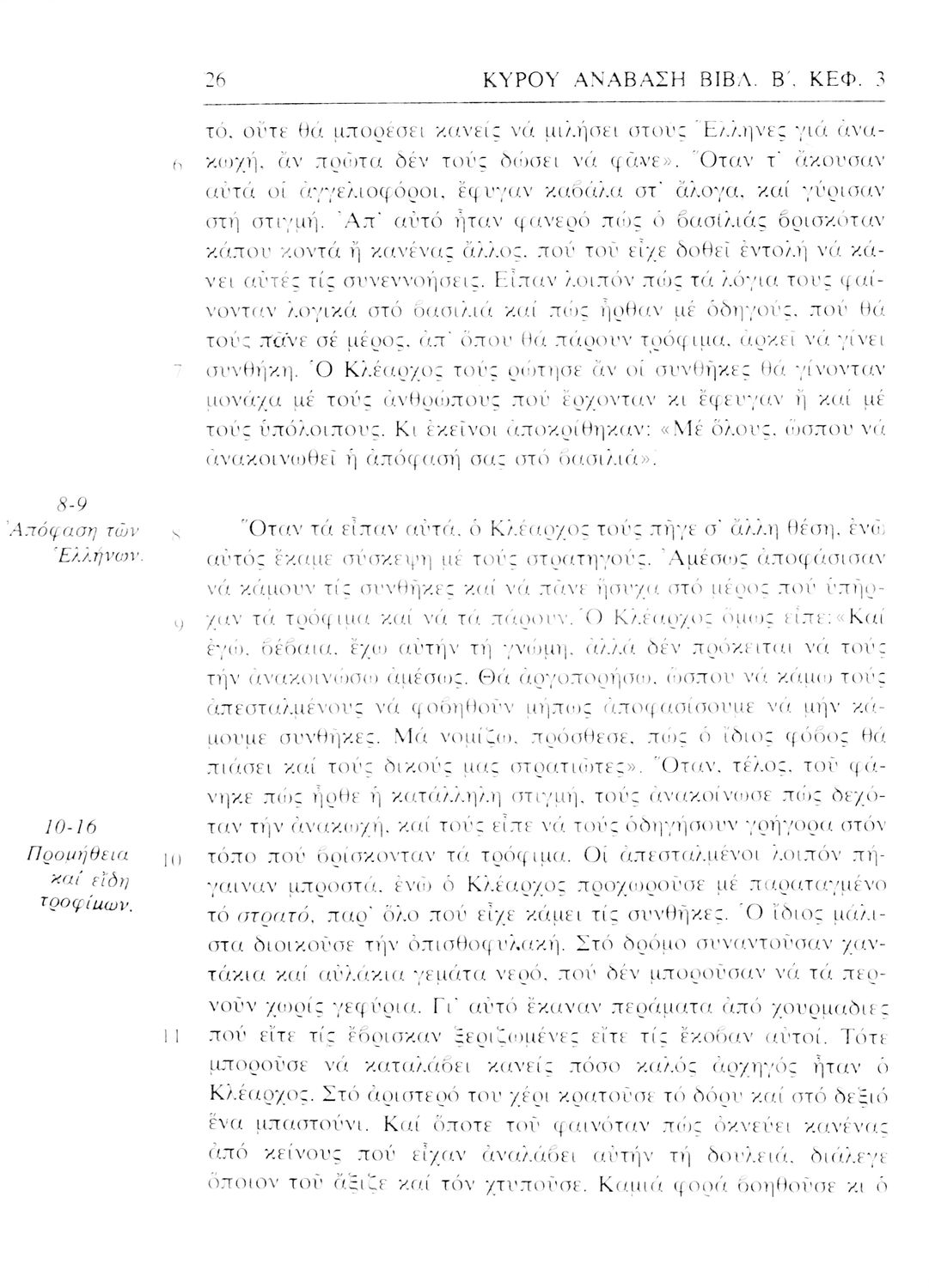 Σχολικό εγχειρίδιο Αρχαίων Ελληνικών. Αρχικά ένα εισαγωγικό σημείωμα αναφέρεται στη ζωή και το έργο του Ξενοφώντα και ακολουθεί το έργο του "Κύρου Ανάβασις". Στο εγχειρίδιο παραθέτονται σε περίληψη το Πρώτο και Έβδομο βιβλίο και σε μεταφρασμένο κείμενο το Δεύτερο, Τρίτο, Τέταρτο, Πέμπτο και Έκτο βιβλίο. Ακολουθούν σημειώσεις πάνω στα κείμενα τα οποία διανθίζονται από έγχρωμες εικόνες που παραχωρήθηκαν από την «Εκδοτική Αθηνών Α.Ε.»