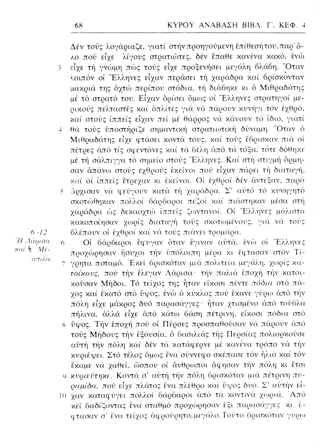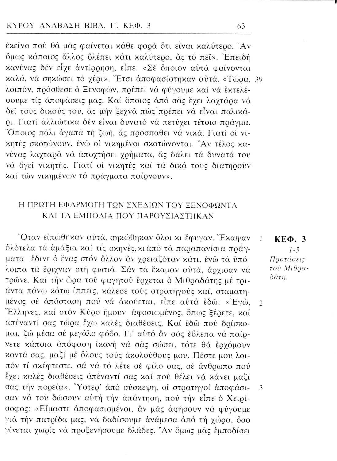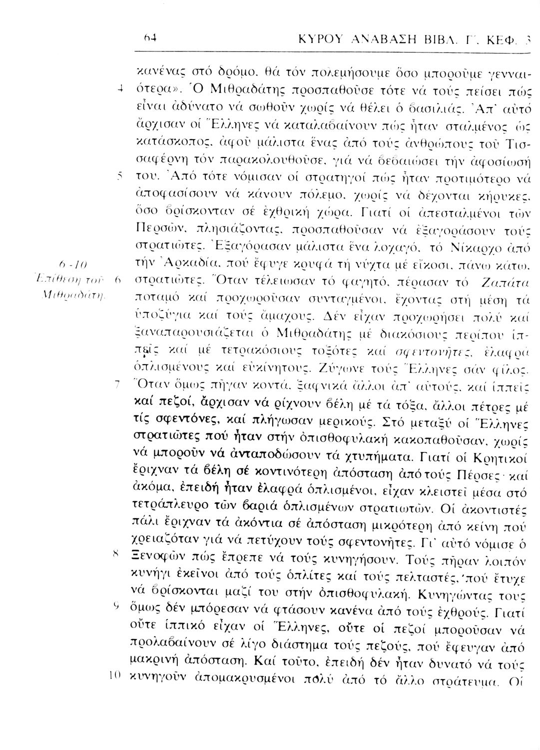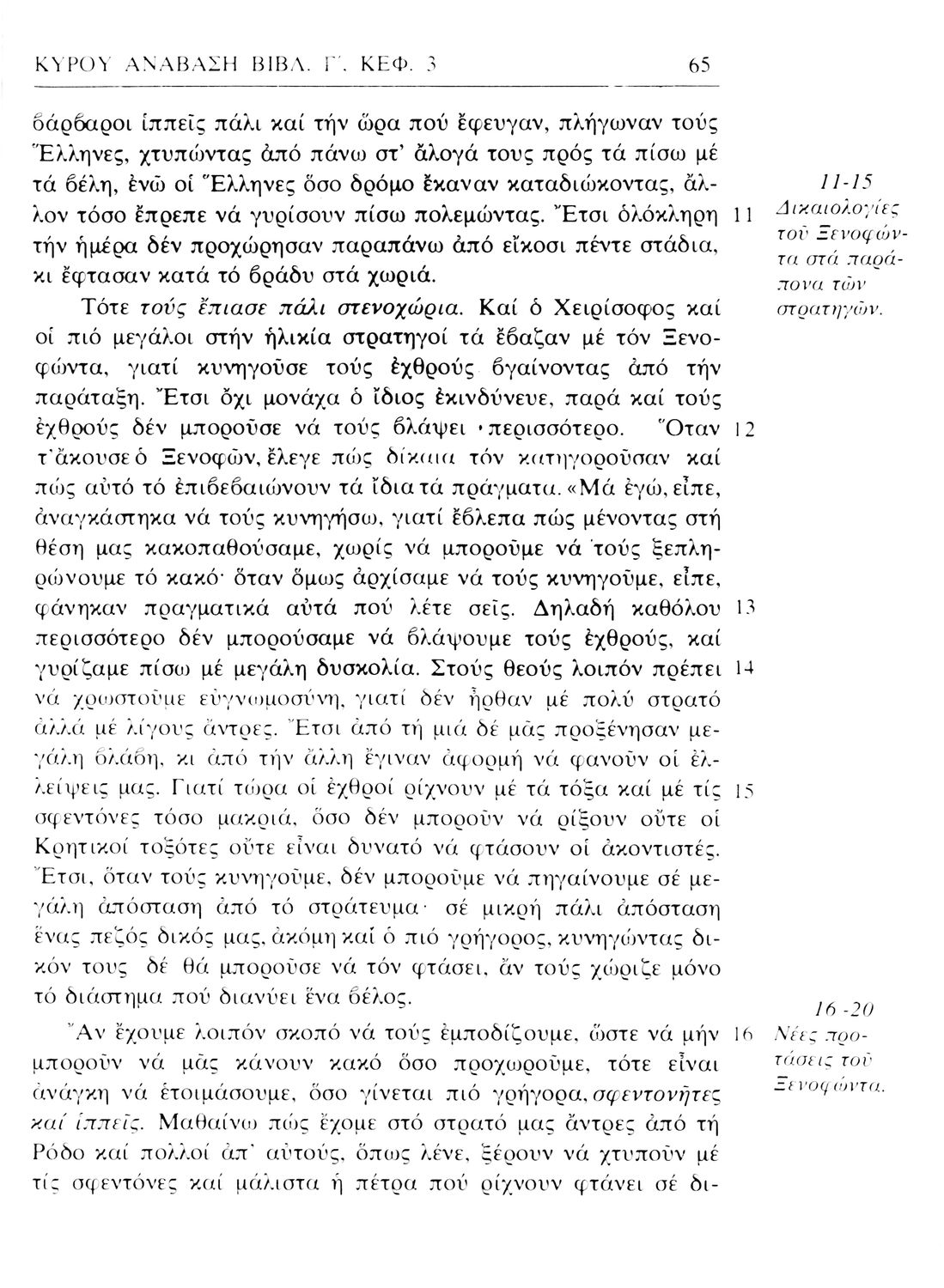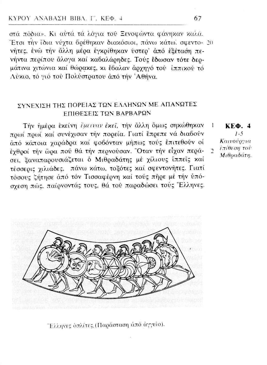 Σχολικό εγχειρίδιο Αρχαίων Ελληνικών. Αρχικά ένα εισαγωγικό σημείωμα αναφέρεται στη ζωή και το έργο του Ξενοφώντα και ακολουθεί το έργο του "Κύρου Ανάβασις". Στο εγχειρίδιο παραθέτονται σε περίληψη το Πρώτο και Έβδομο βιβλίο και σε μεταφρασμένο κείμενο το Δεύτερο, Τρίτο, Τέταρτο, Πέμπτο και Έκτο βιβλίο. Ακολουθούν σημειώσεις πάνω στα κείμενα τα οποία διανθίζονται από έγχρωμες εικόνες που παραχωρήθηκαν από την «Εκδοτική Αθηνών Α.Ε.»