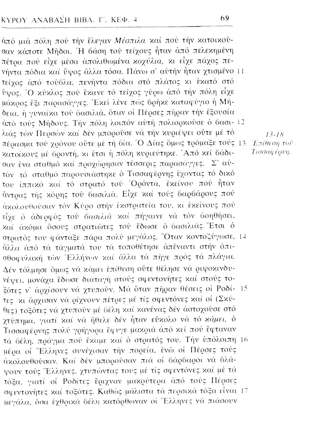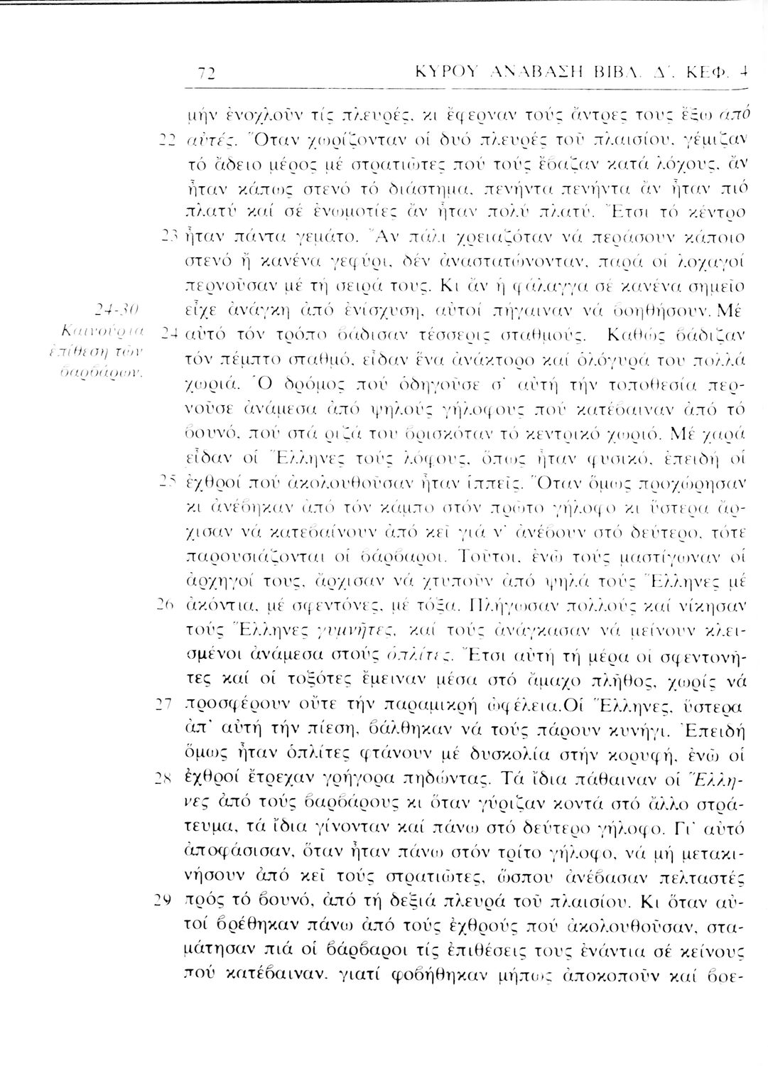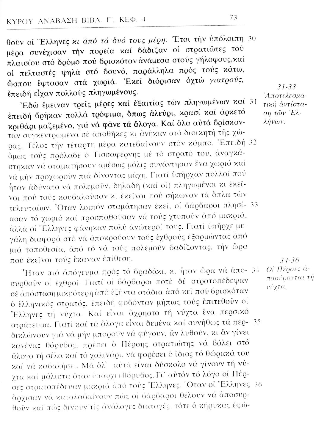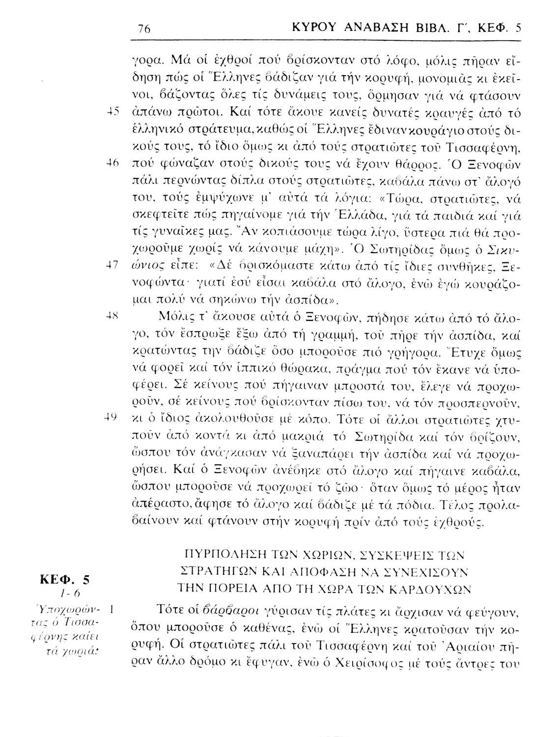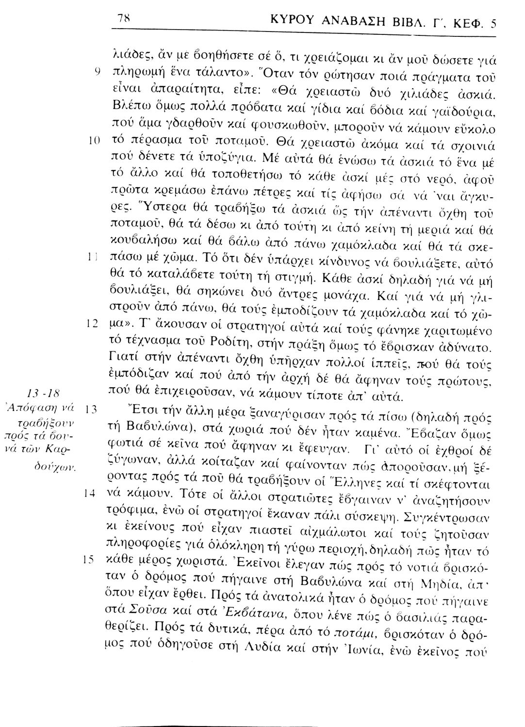 Σχολικό εγχειρίδιο Αρχαίων Ελληνικών. Αρχικά ένα εισαγωγικό σημείωμα αναφέρεται στη ζωή και το έργο του Ξενοφώντα και ακολουθεί το έργο του "Κύρου Ανάβασις". Στο εγχειρίδιο παραθέτονται σε περίληψη το Πρώτο και Έβδομο βιβλίο και σε μεταφρασμένο κείμενο το Δεύτερο, Τρίτο, Τέταρτο, Πέμπτο και Έκτο βιβλίο. Ακολουθούν σημειώσεις πάνω στα κείμενα τα οποία διανθίζονται από έγχρωμες εικόνες που παραχωρήθηκαν από την «Εκδοτική Αθηνών Α.Ε.»