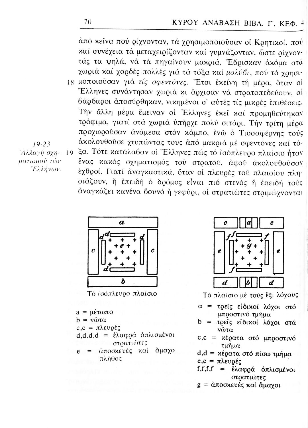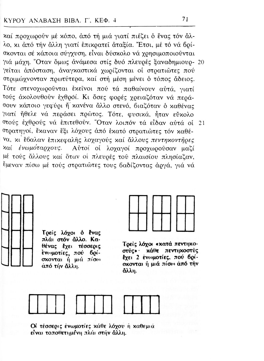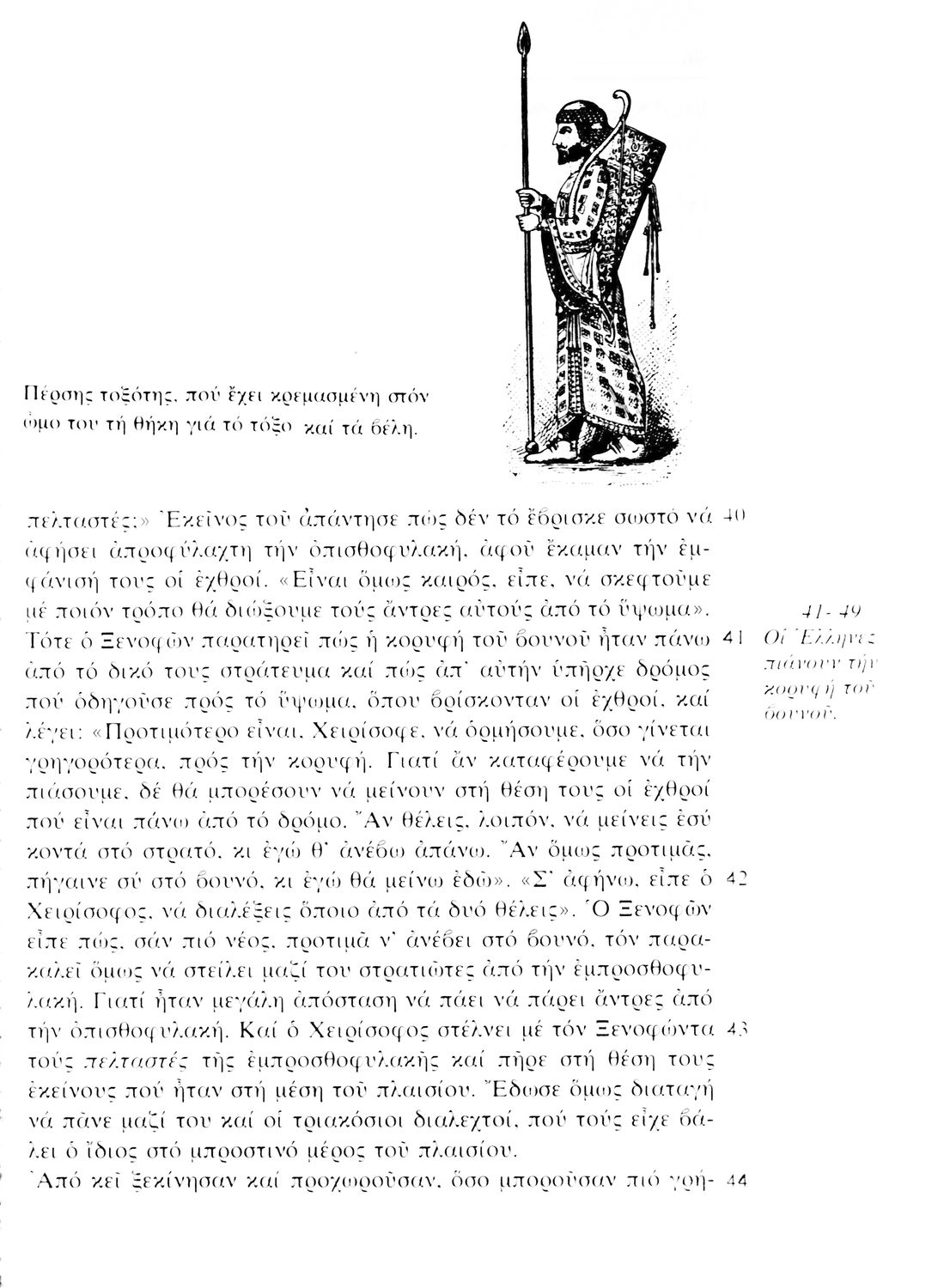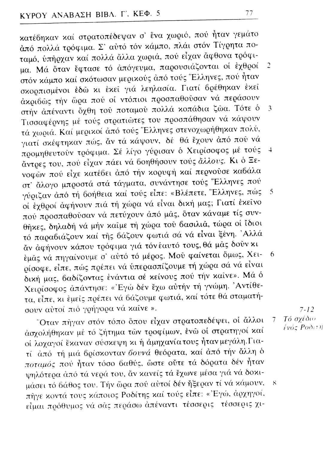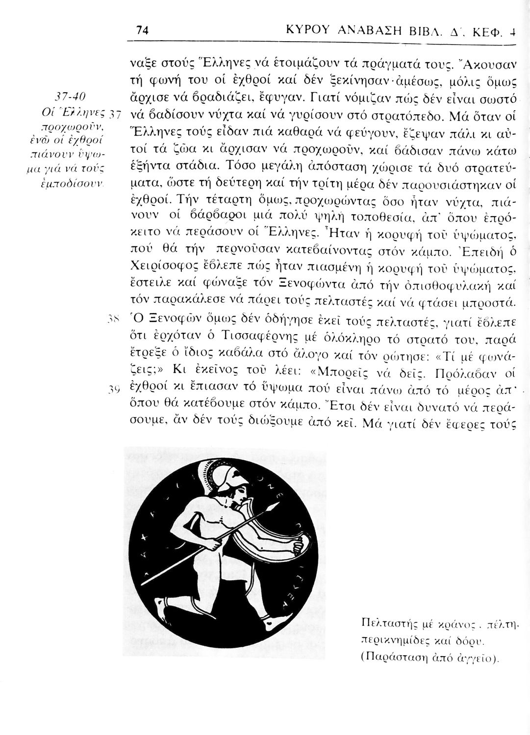 Σχολικό εγχειρίδιο Αρχαίων Ελληνικών. Αρχικά ένα εισαγωγικό σημείωμα αναφέρεται στη ζωή και το έργο του Ξενοφώντα και ακολουθεί το έργο του "Κύρου Ανάβασις". Στο εγχειρίδιο παραθέτονται σε περίληψη το Πρώτο και Έβδομο βιβλίο και σε μεταφρασμένο κείμενο το Δεύτερο, Τρίτο, Τέταρτο, Πέμπτο και Έκτο βιβλίο. Ακολουθούν σημειώσεις πάνω στα κείμενα τα οποία διανθίζονται από έγχρωμες εικόνες που παραχωρήθηκαν από την «Εκδοτική Αθηνών Α.Ε.»