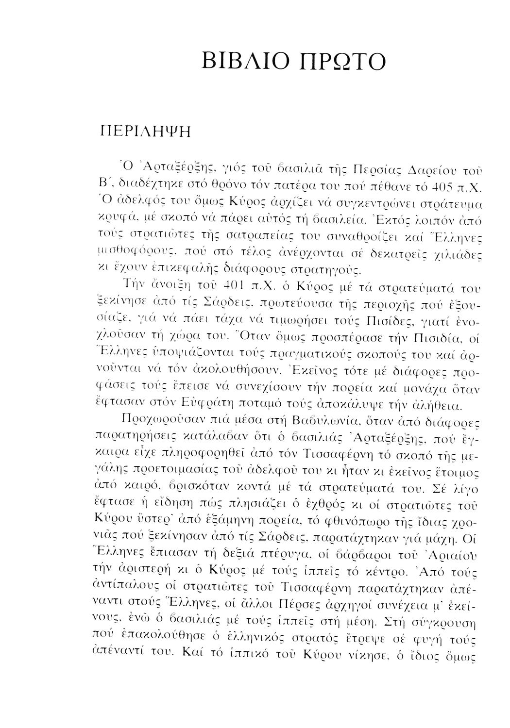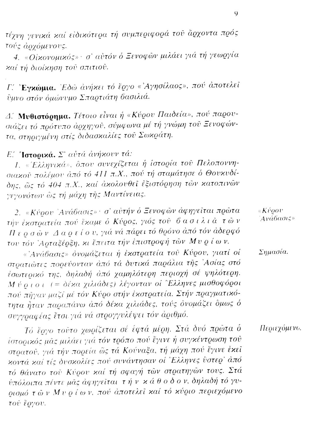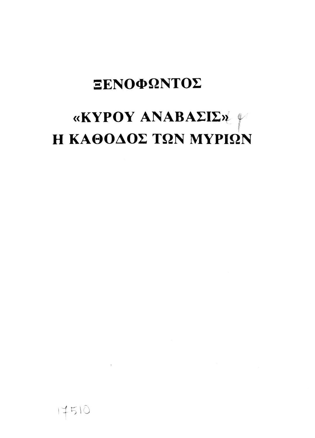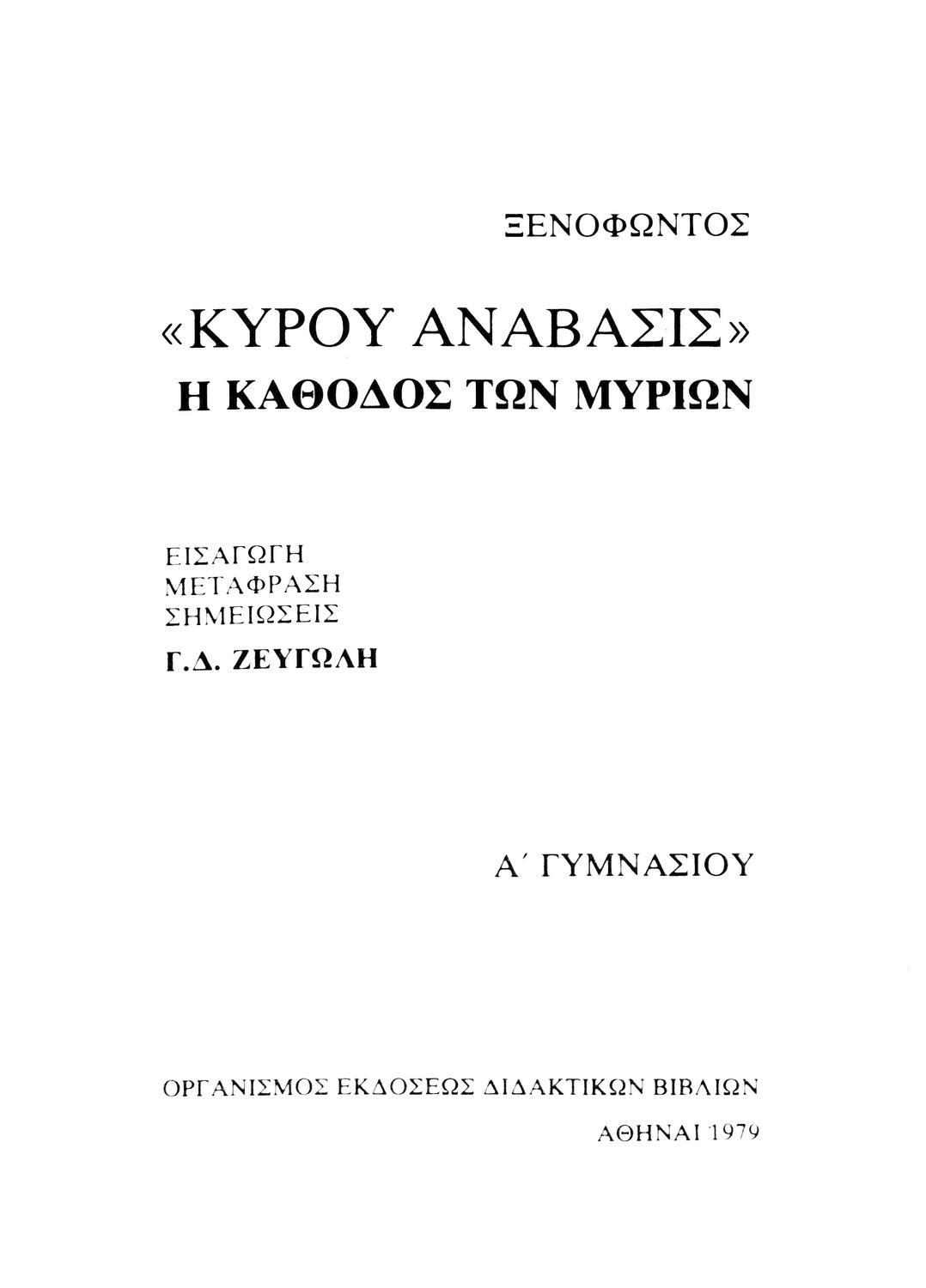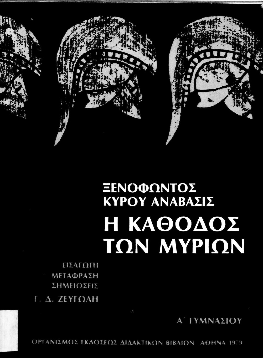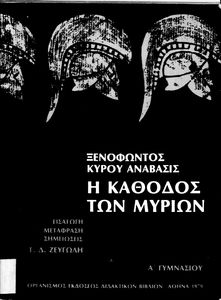 Σχολικό εγχειρίδιο Αρχαίων Ελληνικών. Αρχικά ένα εισαγωγικό σημείωμα αναφέρεται στη ζωή και το έργο του Ξενοφώντα και ακολουθεί το έργο του "Κύρου Ανάβασις". Στο εγχειρίδιο παραθέτονται σε περίληψη το Πρώτο και Έβδομο βιβλίο και σε μεταφρασμένο κείμενο το Δεύτερο, Τρίτο, Τέταρτο, Πέμπτο και Έκτο βιβλίο. Ακολουθούν σημειώσεις πάνω στα κείμενα τα οποία διανθίζονται από έγχρωμες εικόνες που παραχωρήθηκαν από την «Εκδοτική Αθηνών Α.Ε.»
