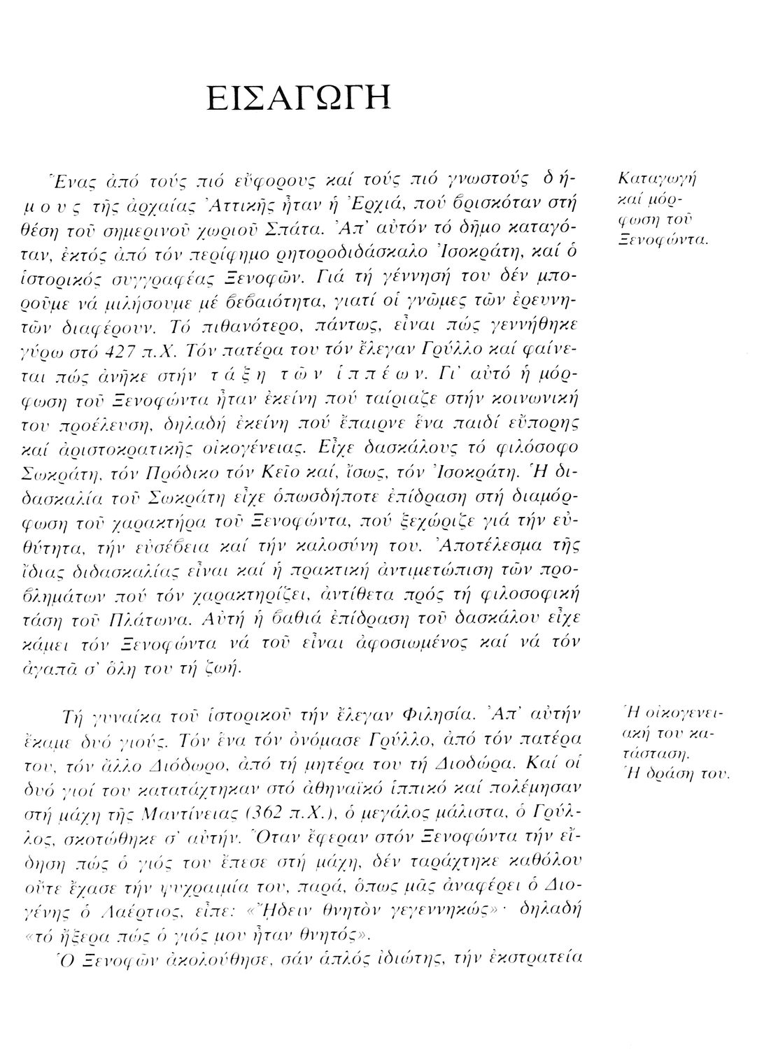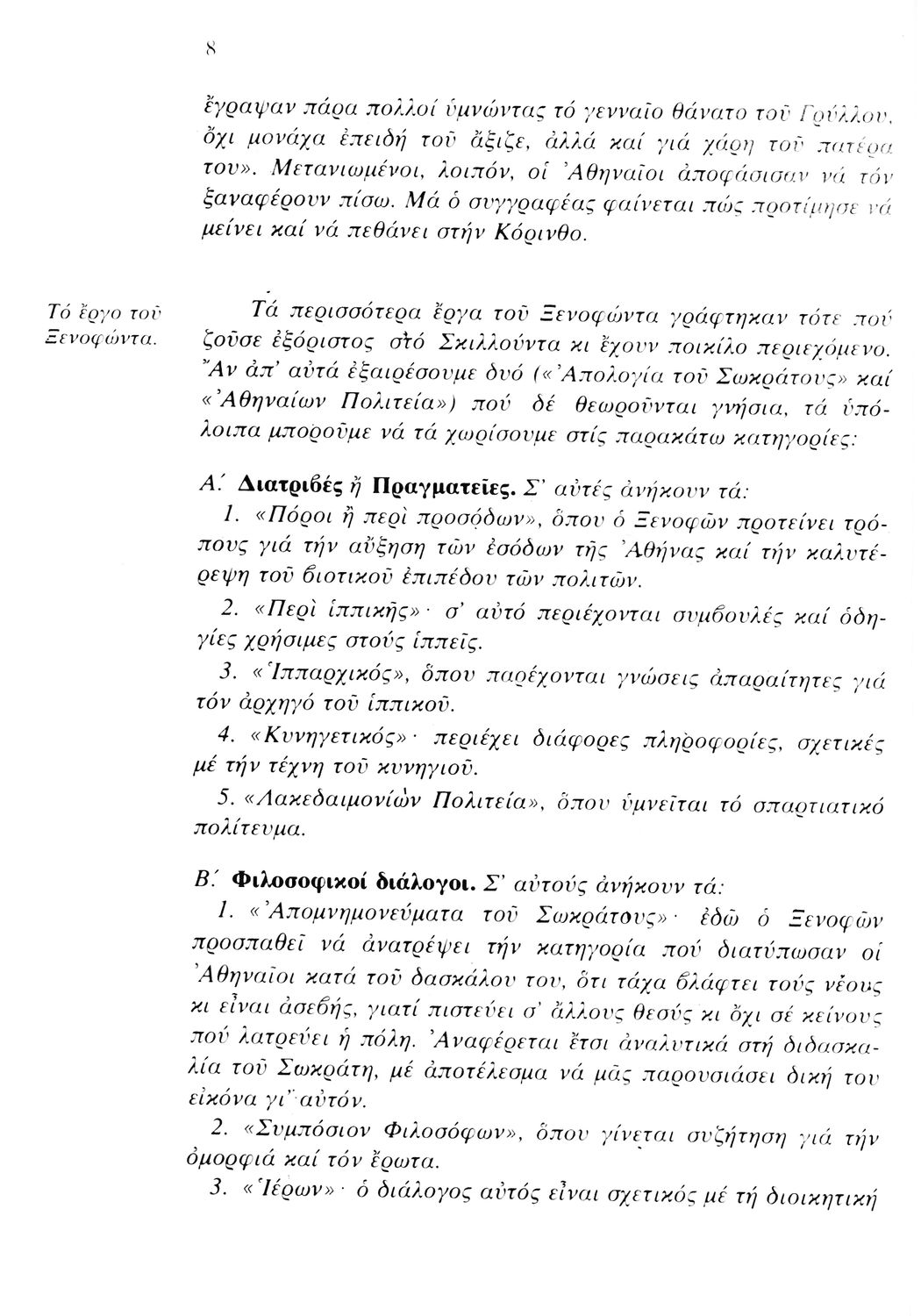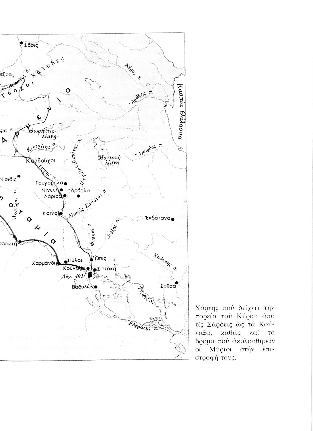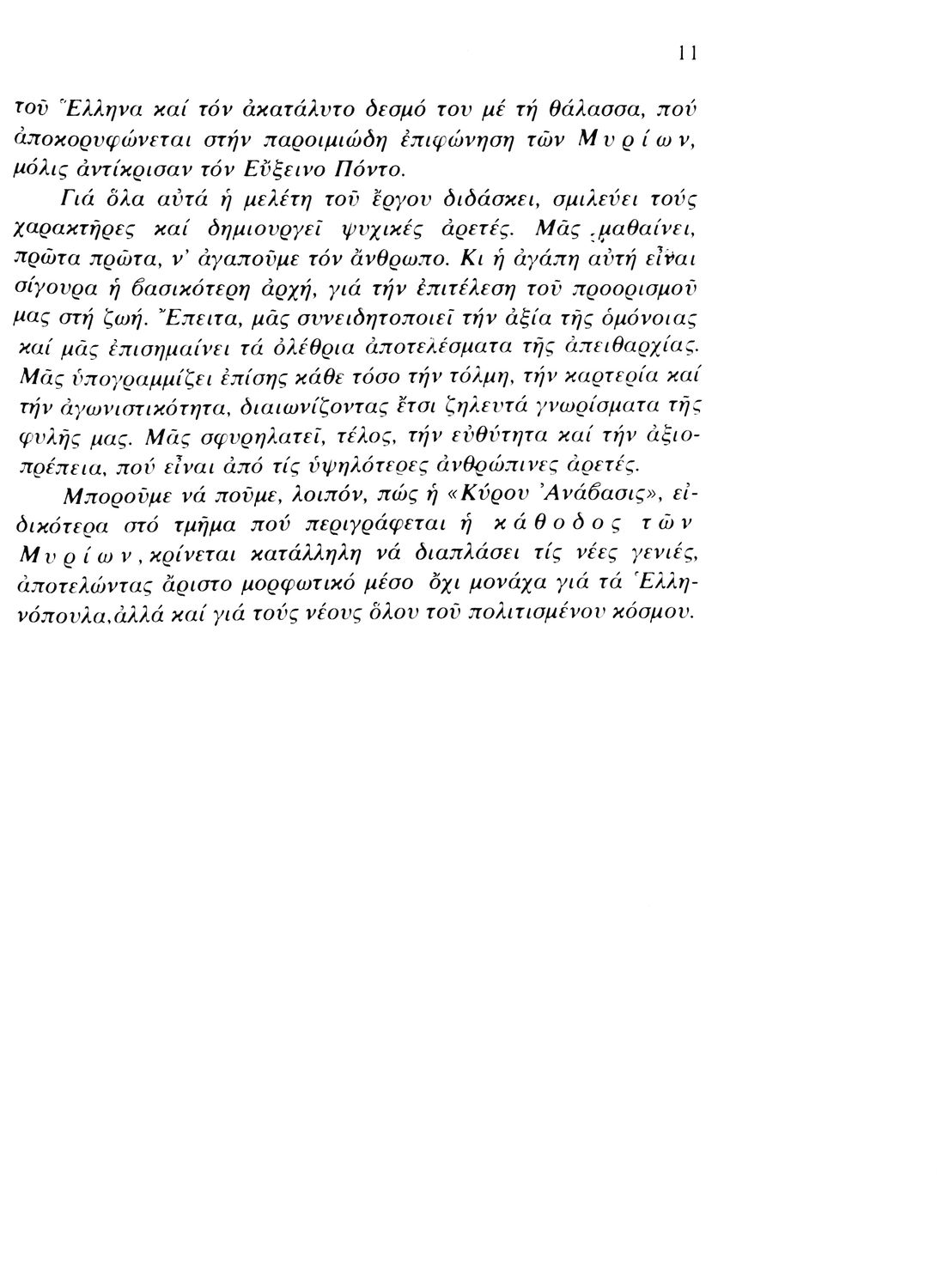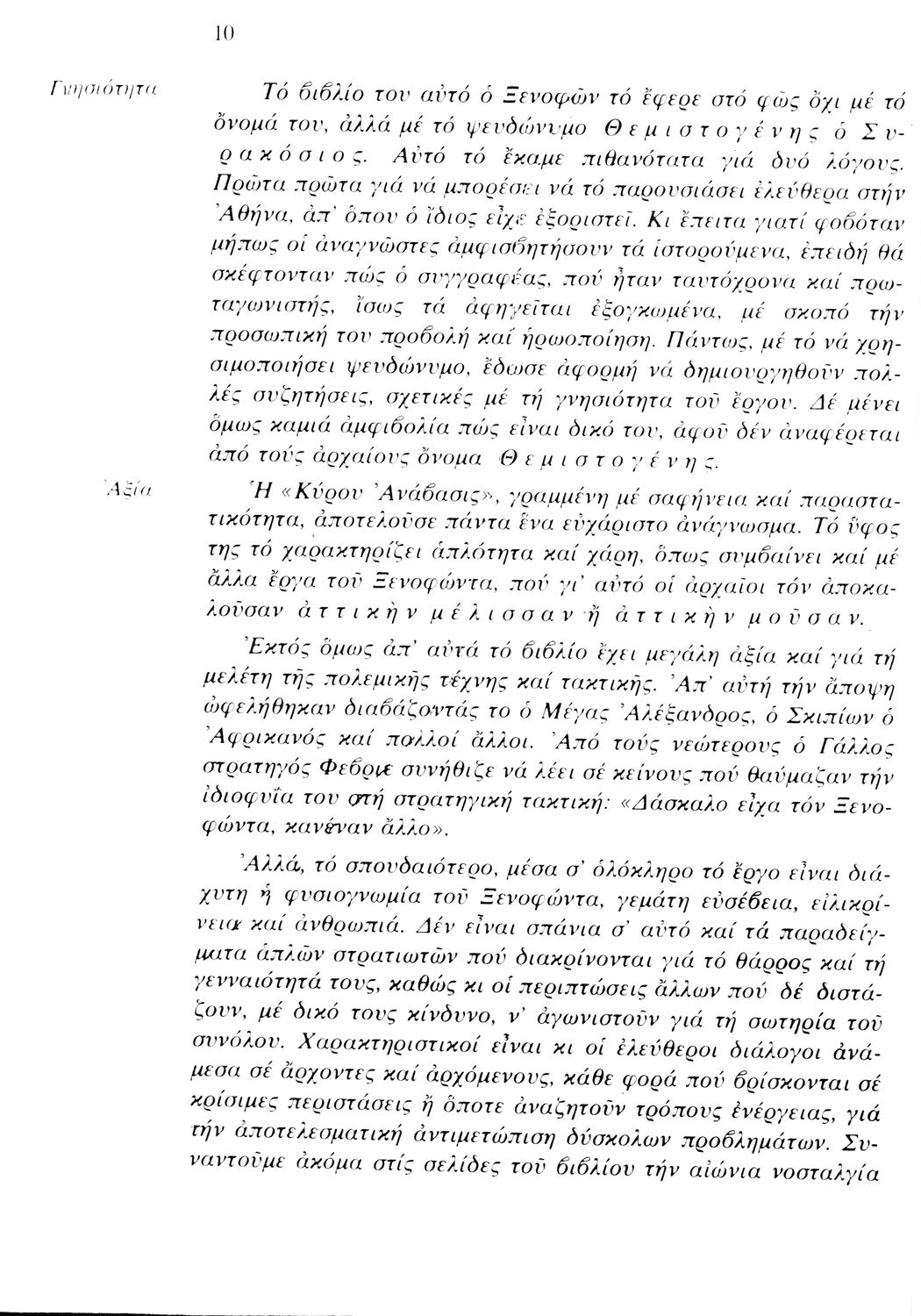 Σχολικό εγχειρίδιο Αρχαίων Ελληνικών. Αρχικά ένα εισαγωγικό σημείωμα αναφέρεται στη ζωή και το έργο του Ξενοφώντα και ακολουθεί το έργο του "Κύρου Ανάβασις". Στο εγχειρίδιο παραθέτονται σε περίληψη το Πρώτο και Έβδομο βιβλίο και σε μεταφρασμένο κείμενο το Δεύτερο, Τρίτο, Τέταρτο, Πέμπτο και Έκτο βιβλίο. Ακολουθούν σημειώσεις πάνω στα κείμενα τα οποία διανθίζονται από έγχρωμες εικόνες που παραχωρήθηκαν από την «Εκδοτική Αθηνών Α.Ε.»