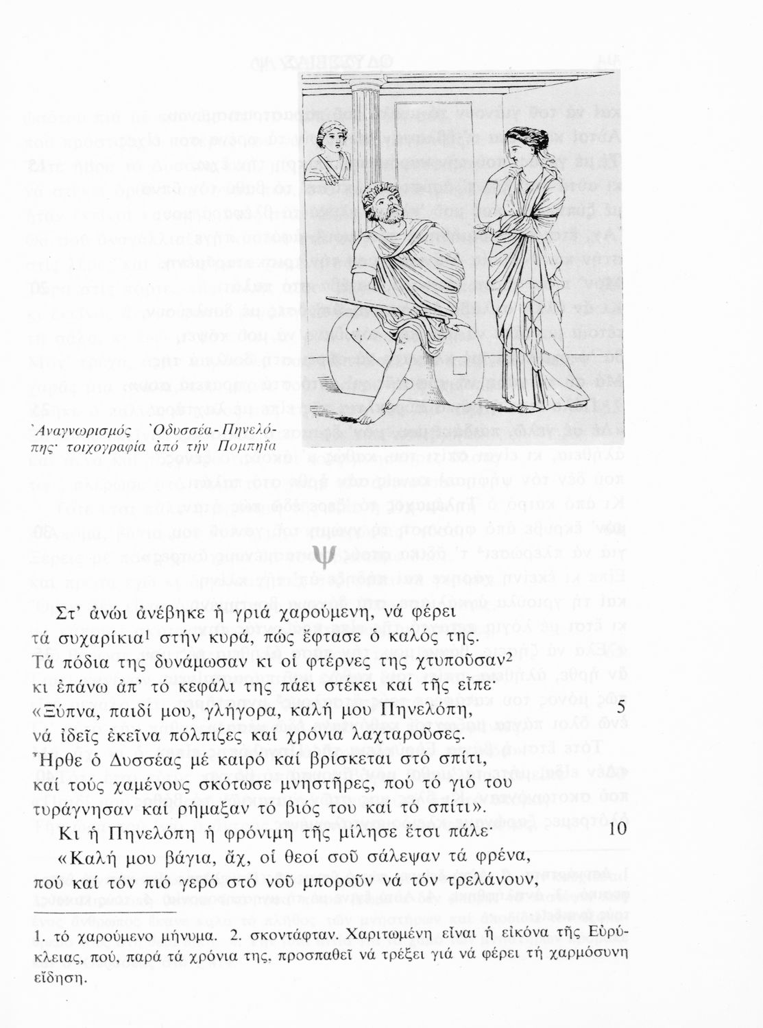 Σχολικό εγχειρίδιο Αρχαίων Ελληνικών. Το βιβλίο περιλαμβάνει εισαγωγή σχετικά με το έργο του Ομήρου, τη δομή και το περιεχόμενο της Οδύσσειας. Ακολουθεί το έπος της Οδύσσειας σε μετάφραση του Ζήσιμου Σιδέρη. Τα κείμενα συνοδεύουν ερμηνευτικές υποσημειώσεις και σχόλια. Η εισαγωγή και τα σχόλια είναι του Γεν. Επιθεωρητή Τριαντ. Ι. Δελή. Η ορθογραφική προσαρμογή της μετάφρασης έγινε από το Γεν. Επιθ. Κ. Μικρούδη. Η επιλογή των αγγειογραφιών έγινε με τη συνεργασία της αρχαιολόγου Ίριδας Ντούσκου και του Τριαντάφυλλου Ι. Δέλη.