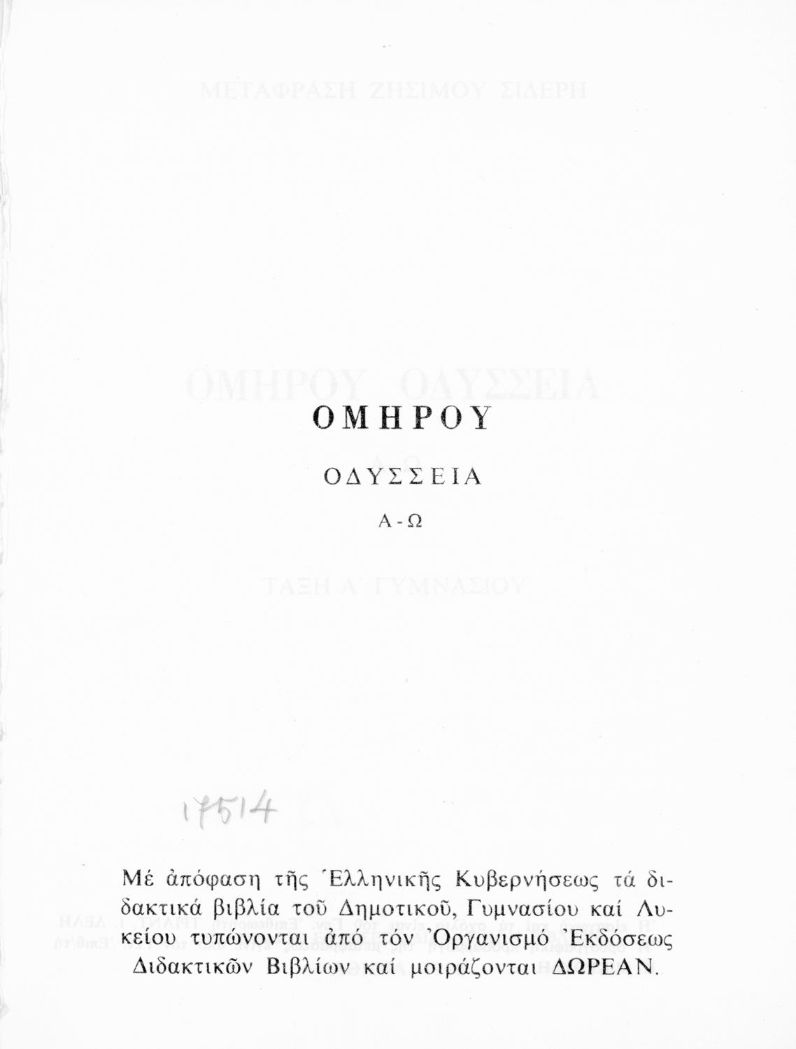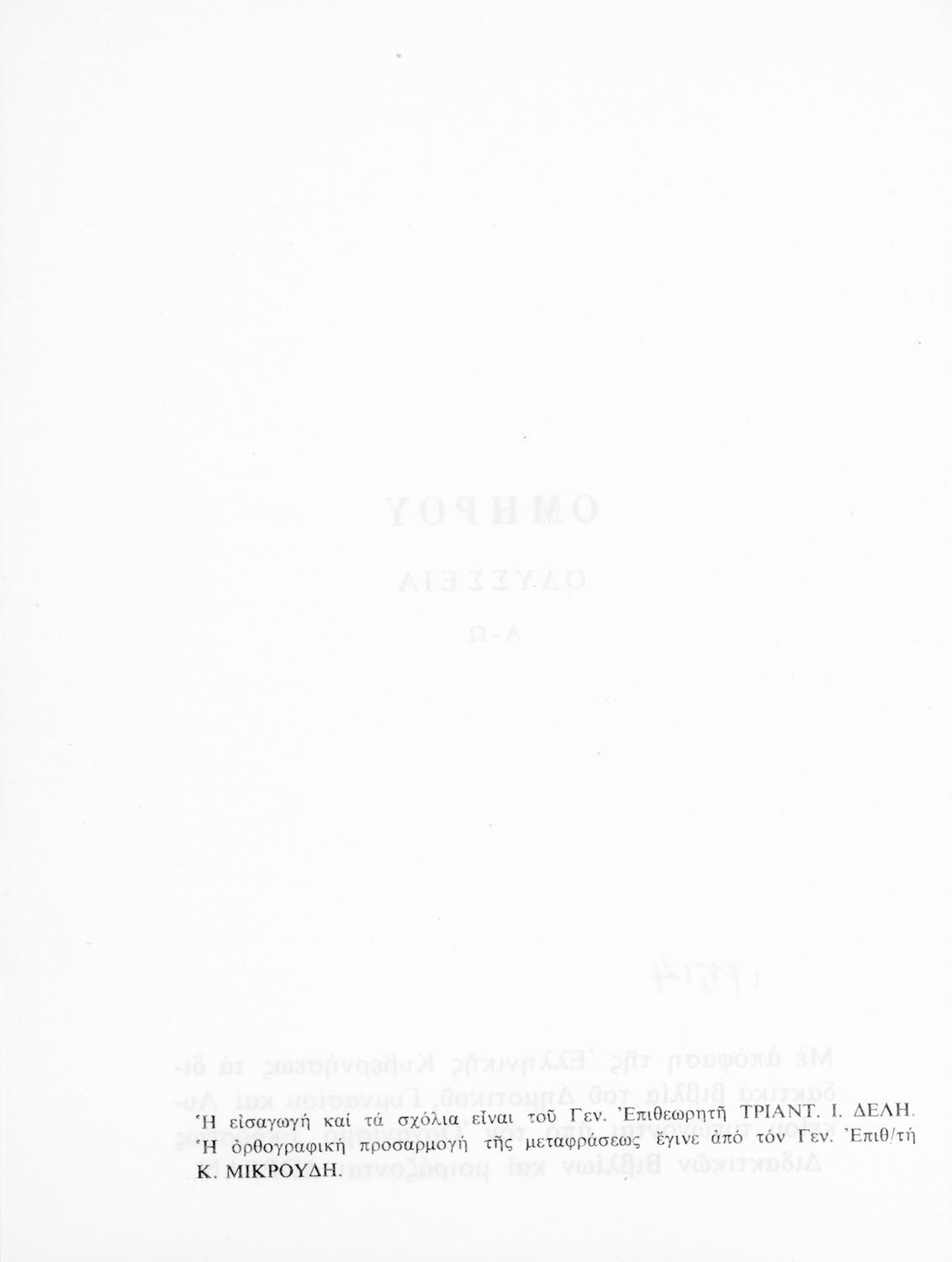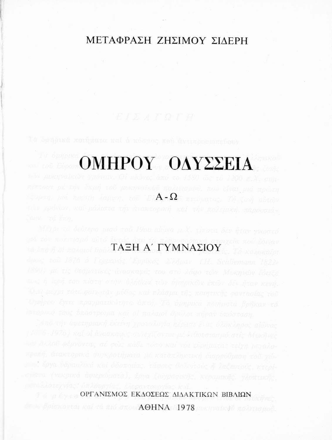 Σχολικό εγχειρίδιο Αρχαίων Ελληνικών. Το βιβλίο περιλαμβάνει εισαγωγή σχετικά με το έργο του Ομήρου, τη δομή και το περιεχόμενο της Οδύσσειας. Ακολουθεί το έπος της Οδύσσειας σε μετάφραση του Ζήσιμου Σιδέρη. Τα κείμενα συνοδεύουν ερμηνευτικές υποσημειώσεις και σχόλια. Η εισαγωγή και τα σχόλια είναι του Γεν. Επιθεωρητή Τριαντ. Ι. Δελή. Η ορθογραφική προσαρμογή της μετάφρασης έγινε από το Γεν. Επιθ. Κ. Μικρούδη. Η επιλογή των αγγειογραφιών έγινε με τη συνεργασία της αρχαιολόγου Ίριδας Ντούσκου και του Τριαντάφυλλου Ι. Δέλη.