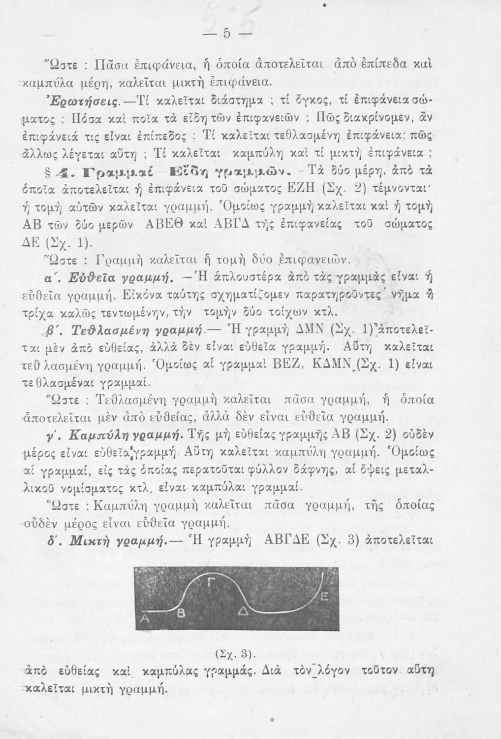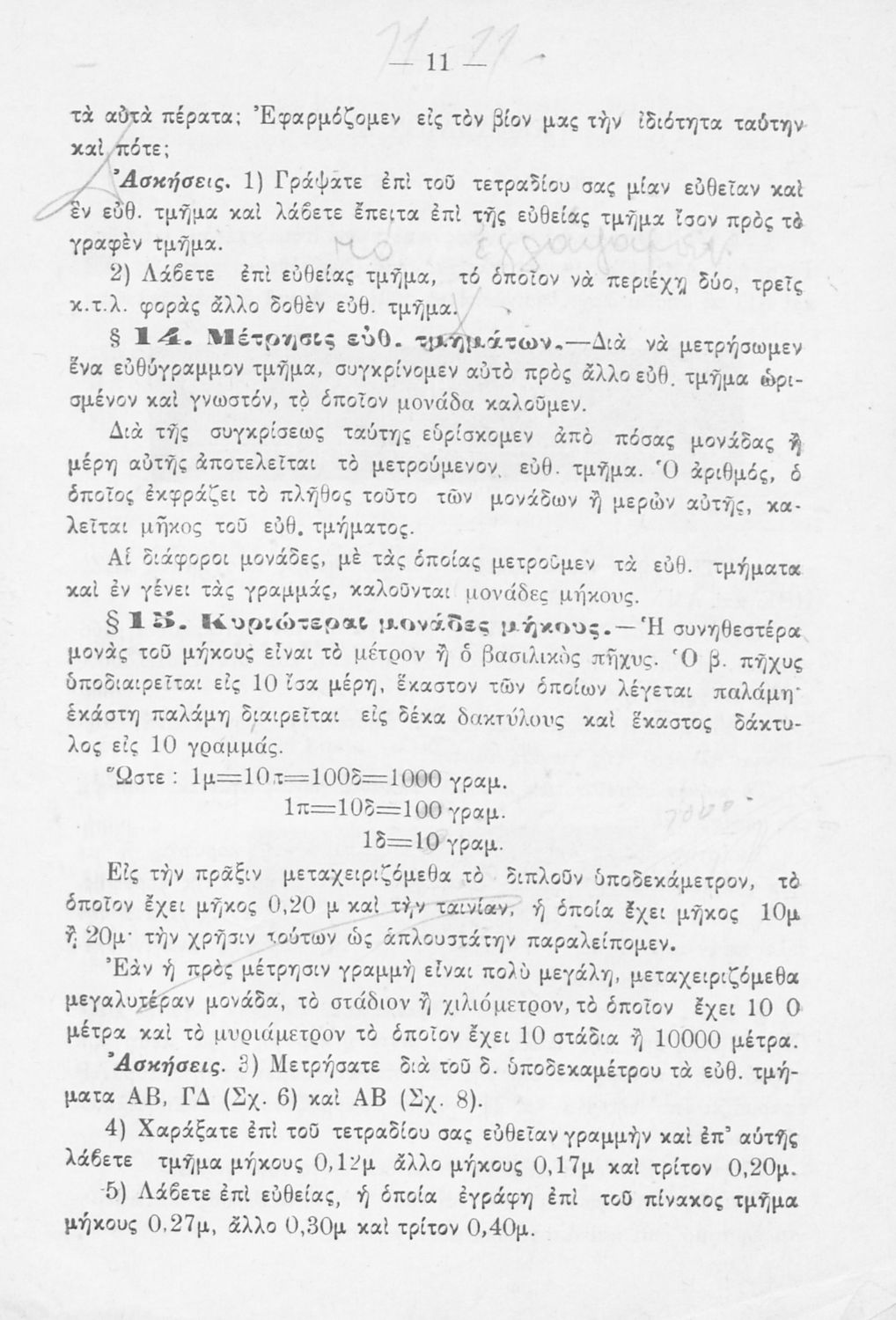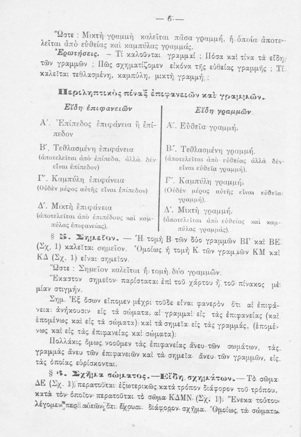Σχολικό εγχειρίδιο Γεωμετρίας για την Α΄, Β΄ και Γ΄ τάξη των Ελληνικών και Αστικών Σχολείων και Παρθεναγωγείων που είναι χωρισμένο σε Επιπεδομετρία και Στερεομετρία και περιλαμβάνει θεωρία και ασκήσεις.