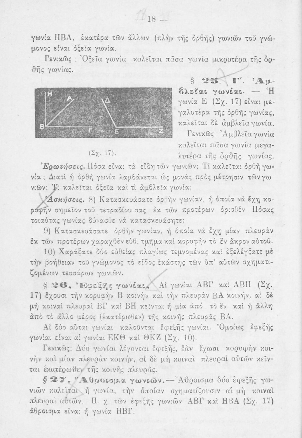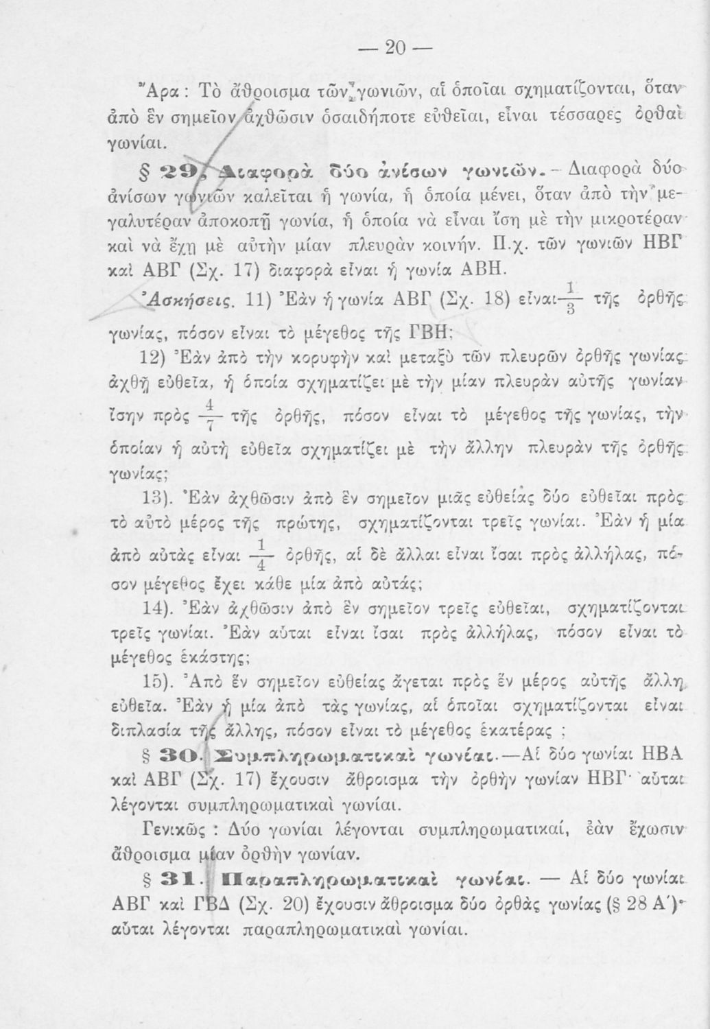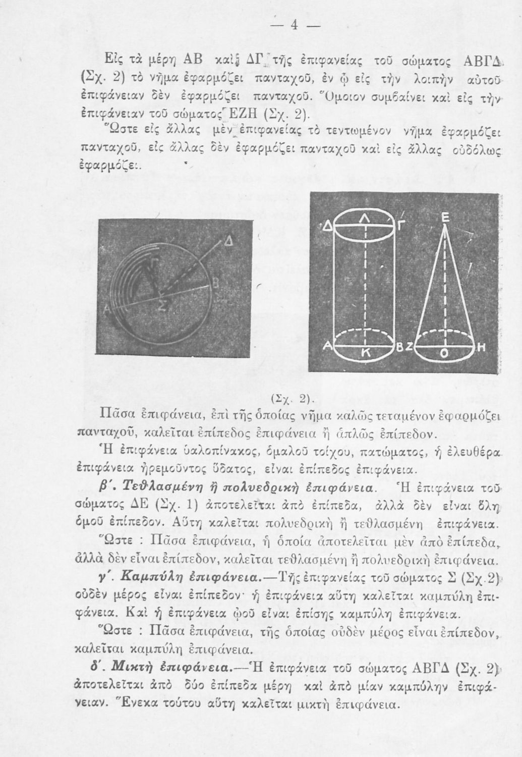 Σχολικό εγχειρίδιο Γεωμετρίας για την Α΄, Β΄ και Γ΄ τάξη των Ελληνικών και Αστικών Σχολείων και Παρθεναγωγείων που είναι χωρισμένο σε Επιπεδομετρία και Στερεομετρία και περιλαμβάνει θεωρία και ασκήσεις.