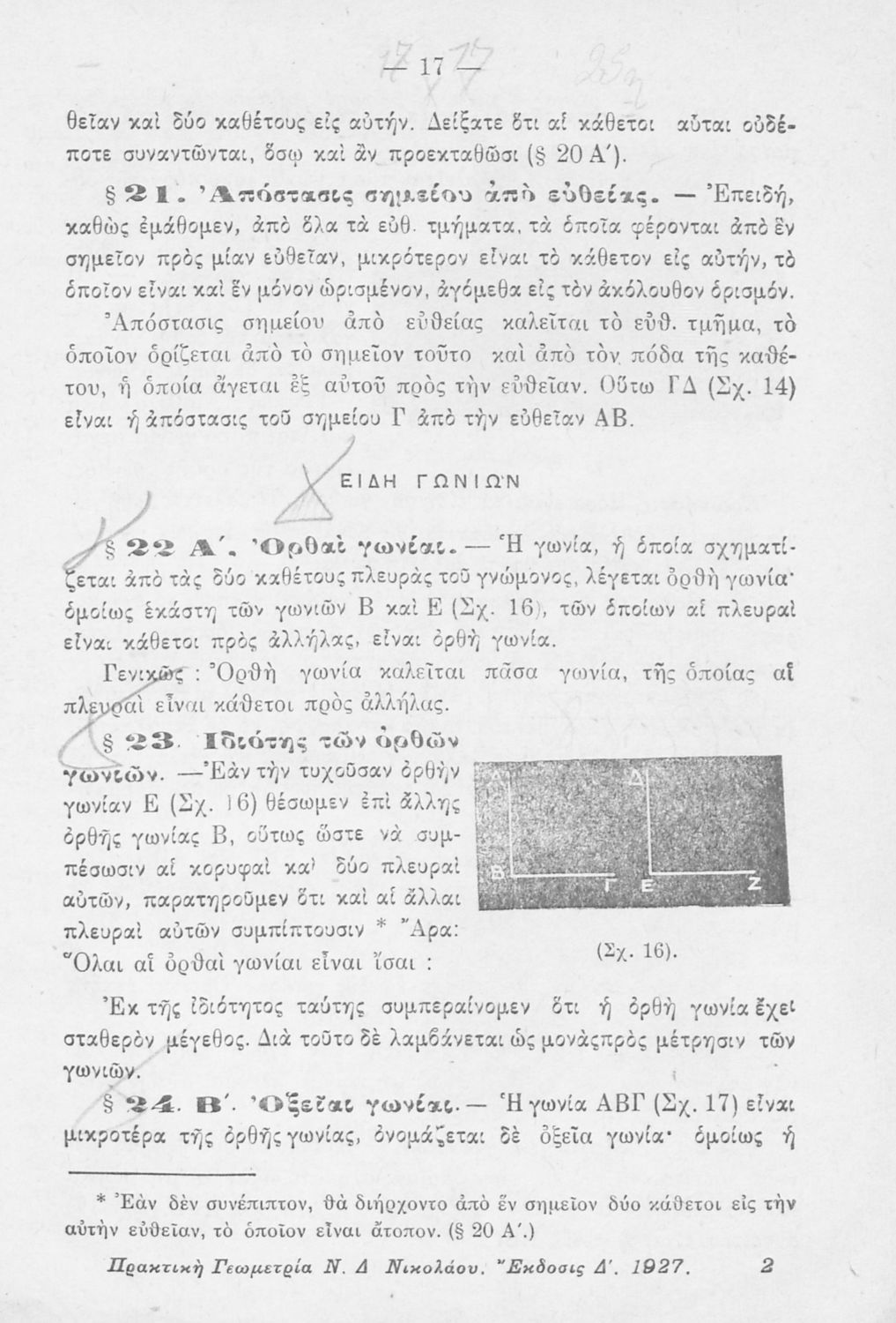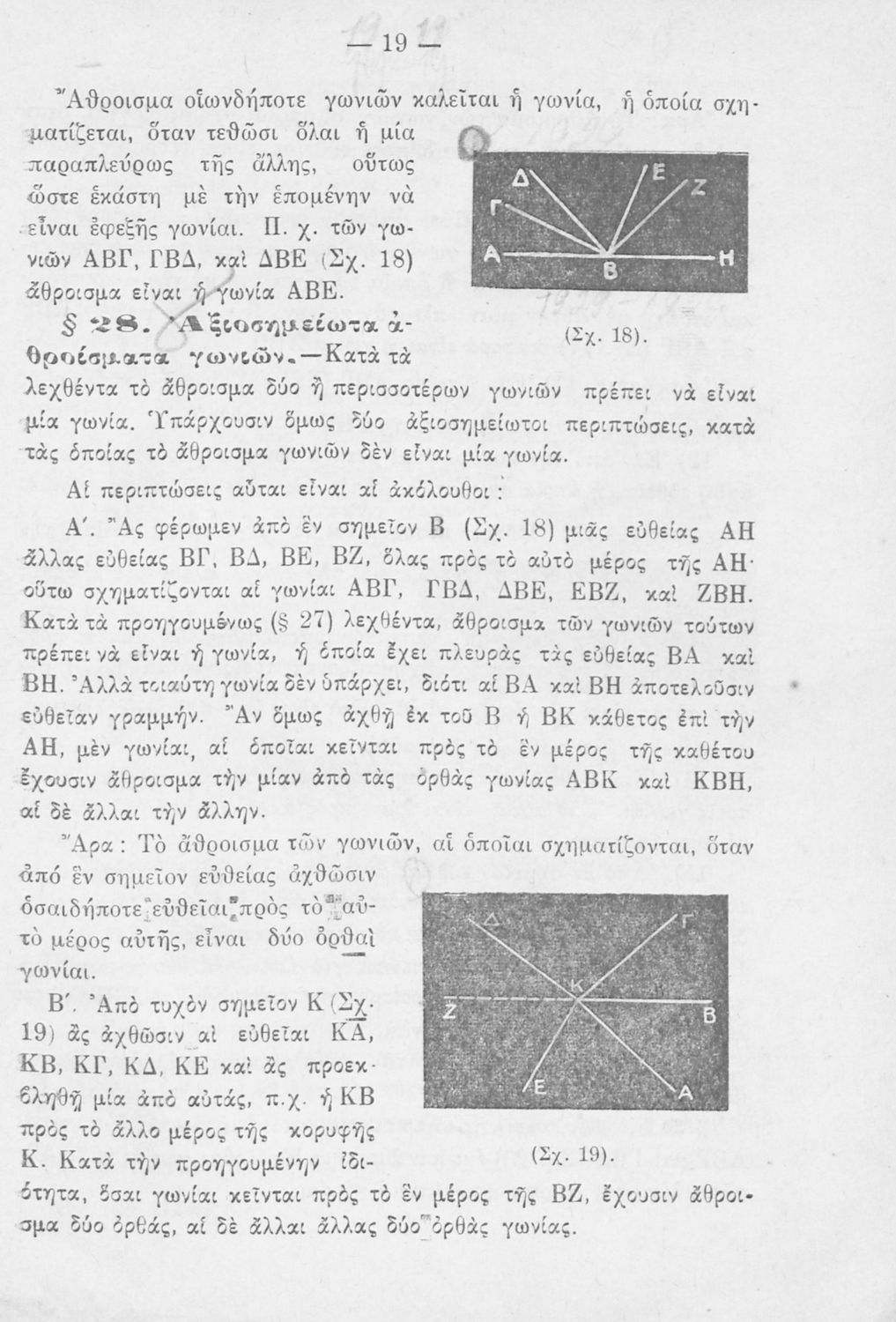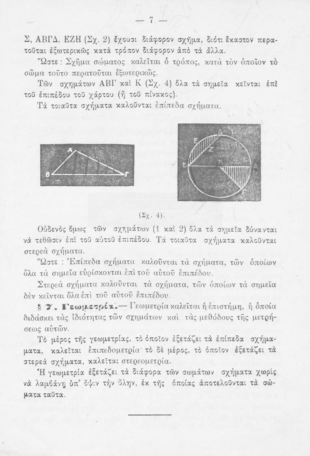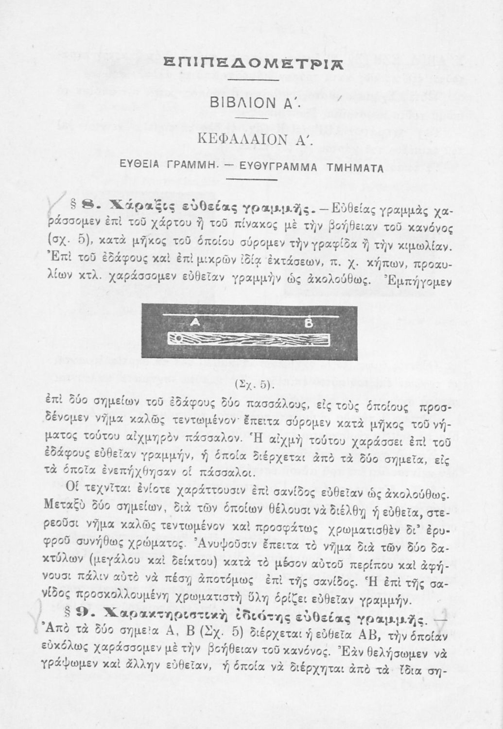 Σχολικό εγχειρίδιο Γεωμετρίας για τα Ελληνικά και Αστικά Σχολεία χωρισμένο σε Επιπεδομετρία και Στερεομετρία. Περιλαμβάνει προβλήματα και στοιχεία χωρομετρίας.