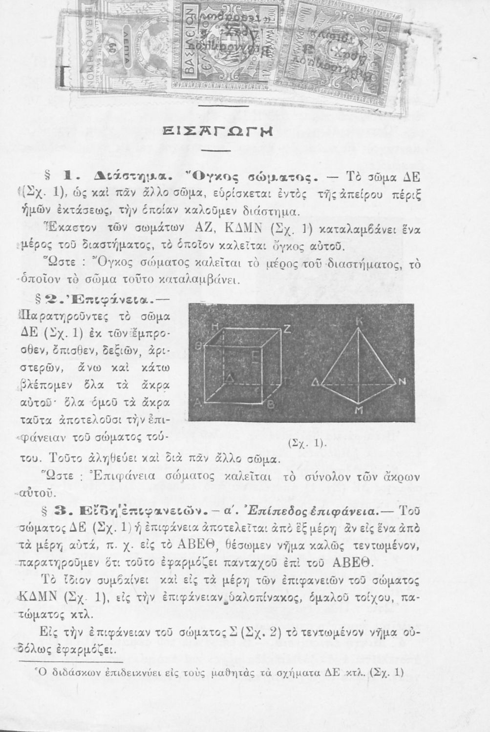 Σχολικό εγχειρίδιο Γεωμετρίας για τα Ελληνικά και Αστικά Σχολεία που περιέχει θεωρία και ασκήσεις και είναι χωρισμένο σε Επιπεδομετρία και Στερεομετρία.