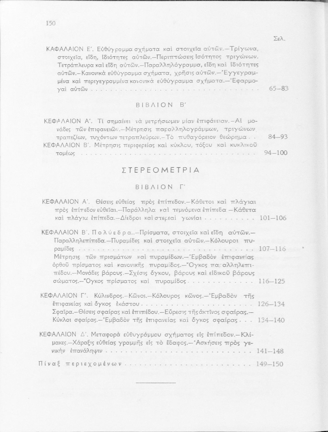 Σχολικό εγχειρίδιο Γεωμετρίας Γυμνασίων και Αστικών Σχολείων χωρισμένο σε Επιπεδομετρία και Στερεομετρία. Περιλαμβάνει και στοιχεία Χωρομετρίας.