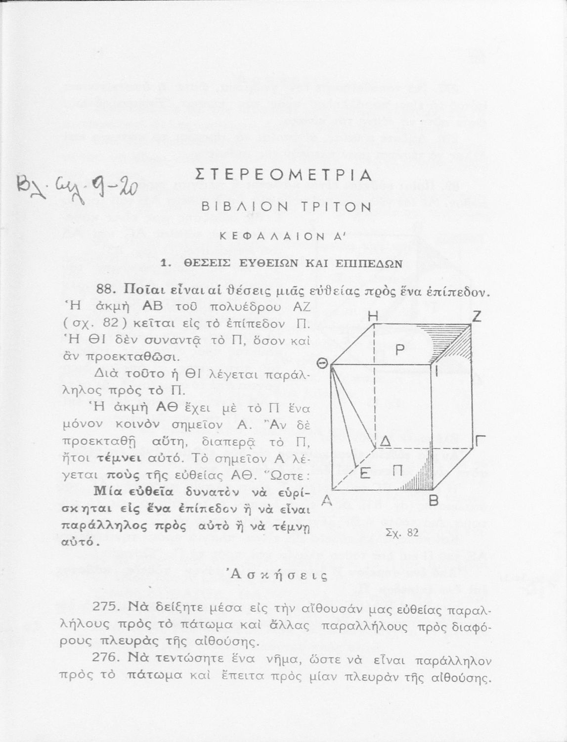 Σχολικό εγχειρίδιο Γεωμετρίας για τα Γυμνάσια και Αστικά Σχολεία που περιλαμβάνει θεωρία και ασκήσεις και είναι χωρισμένο σε Επιπεδομετρία και Στερεομετρία.