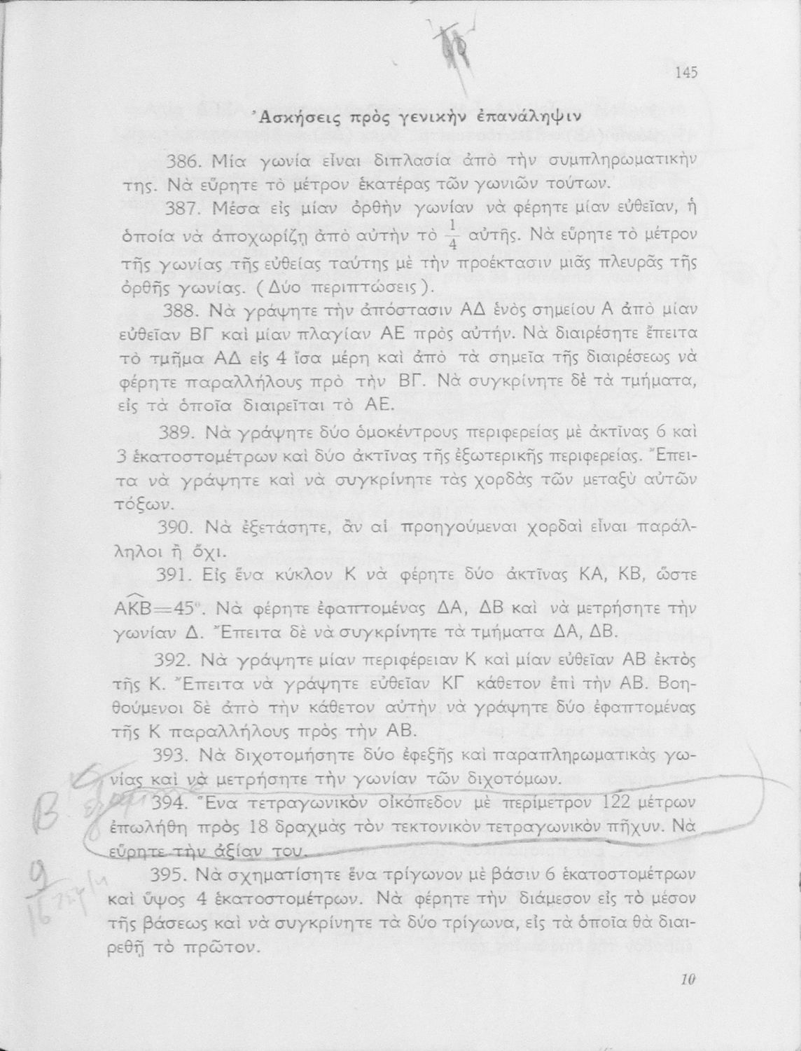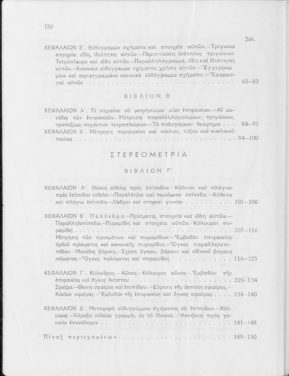 Σχολικό εγχειρίδιο Γεωμετρίας για τα Γυμνάσια και Αστικά Σχολεία που περιλαμβάνει θεωρία και ασκήσεις και είναι χωρισμένο σε Επιπεδομετρία και Στερεομετρία.