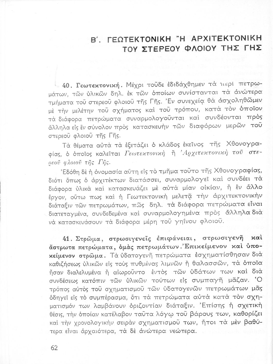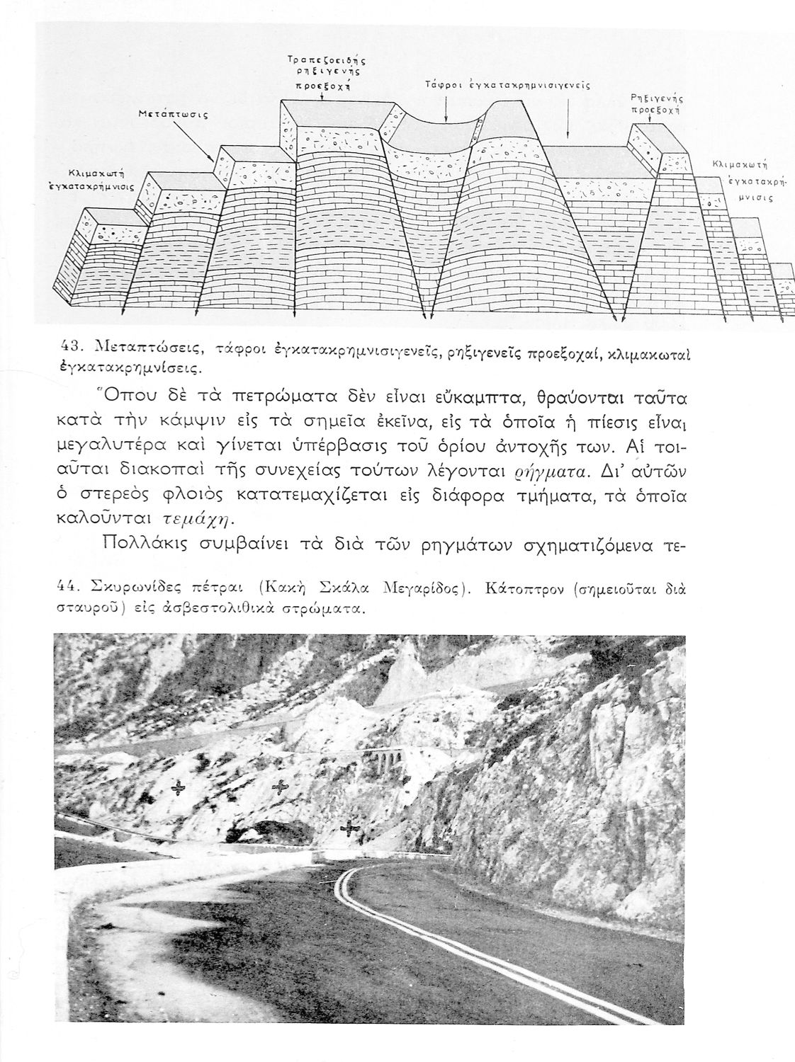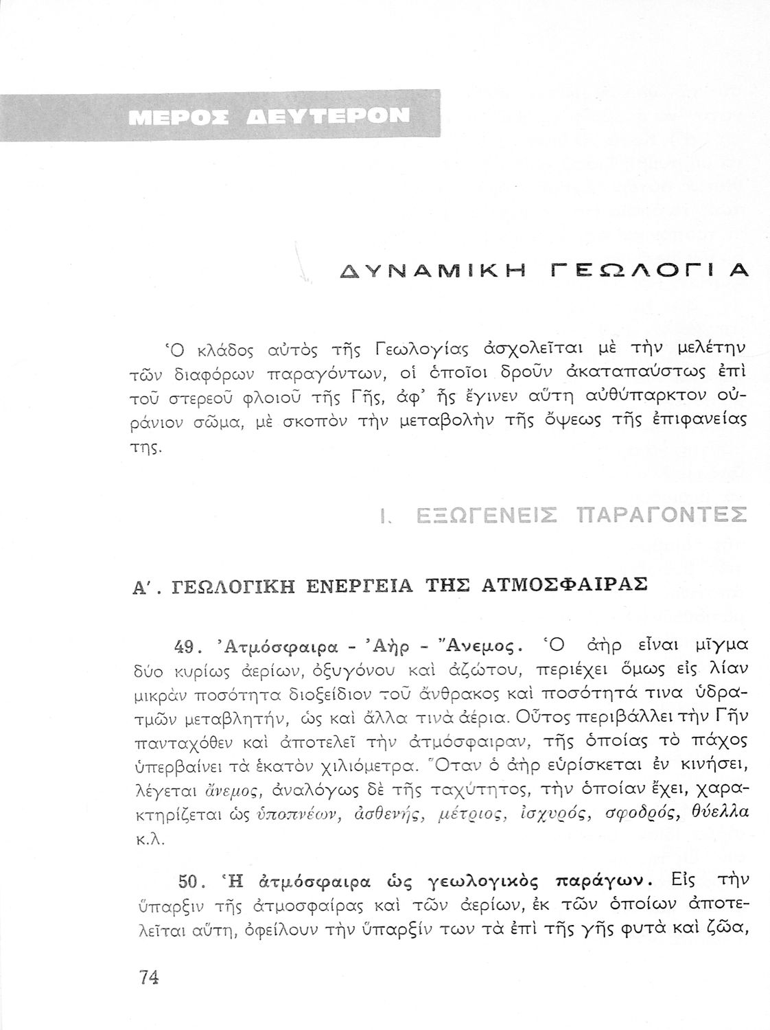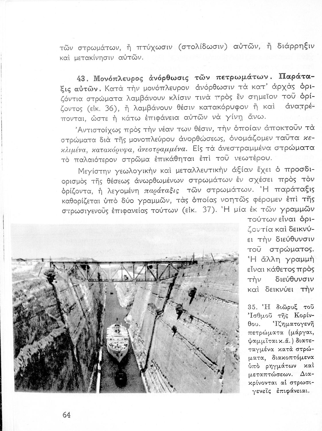 Σχολικό εγχειρίδιο Γεωλογίας/Ορυκτολογίας για τη Δ΄ Γυμνασίου που περιλαμβάνει χθονογραφική, δυναμική και ιστορική γεωλογία, και γενική και ειδική ορυκτολογία. Ο συγγραφέας ήταν καθηγητής πανεπιστημίου και η συγγραφέας φυσικός. Φέρει το σύμβολο της δικτατορίας. Περιέχει παράρτημα με «Στοιχεία Μαθηματικής Γεωγραφίας» από τη γεωγραφία Δ’ τάξης του Αλκίνοου Μάζη (εκδ. 1963).
