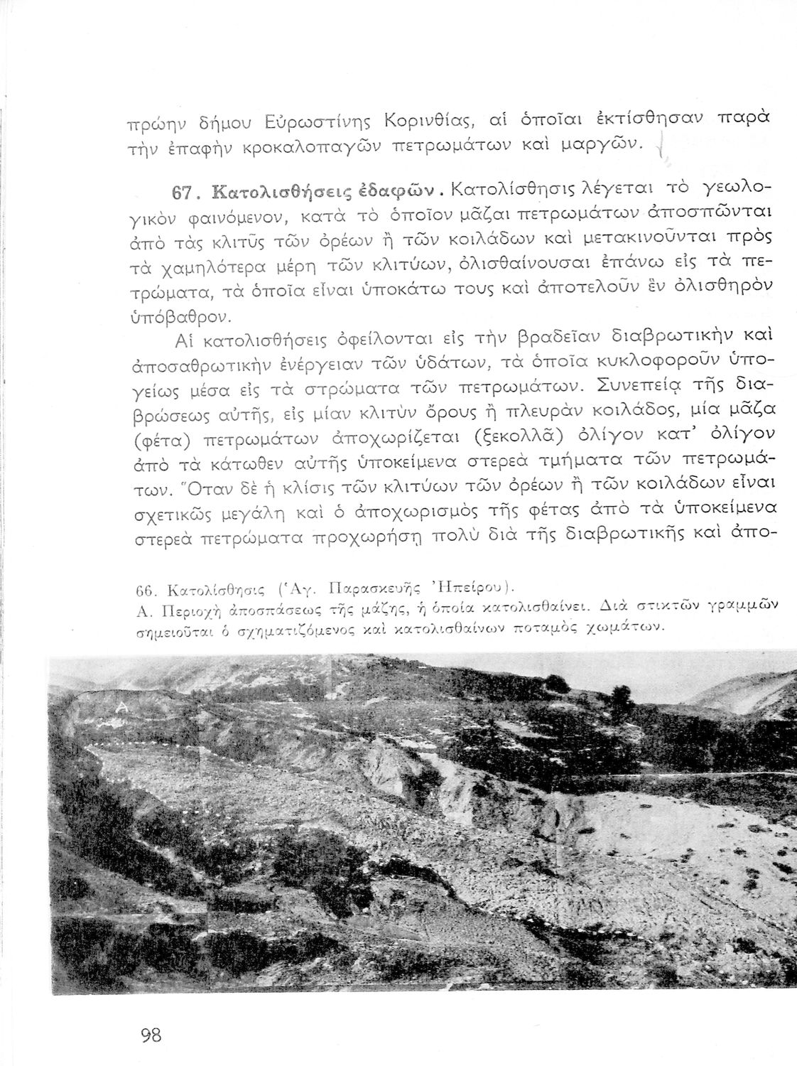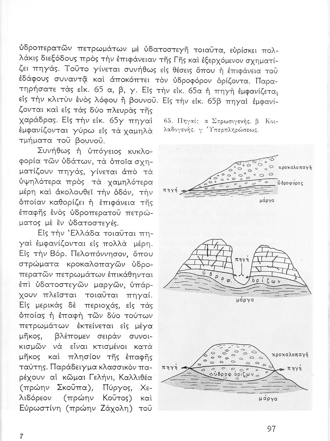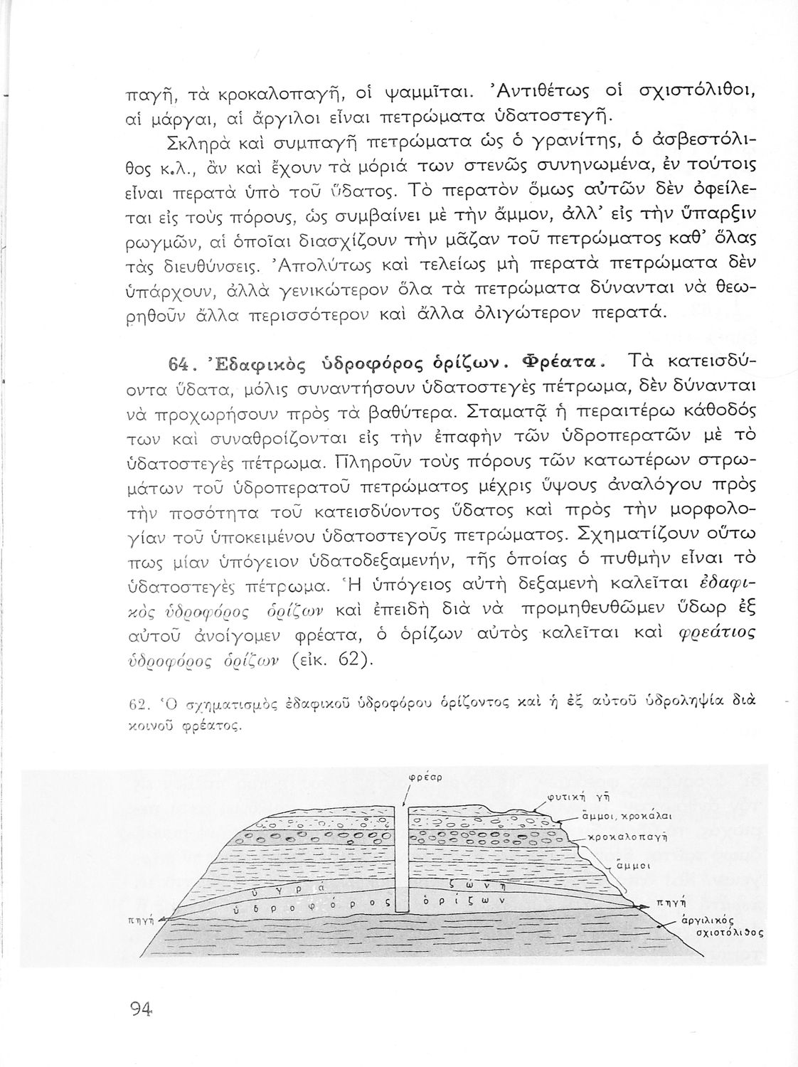 Σχολικό εγχειρίδιο Γεωλογίας/Ορυκτολογίας για τη Δ΄ Γυμνασίου που περιλαμβάνει χθονογραφική, δυναμική και ιστορική γεωλογία, και γενική και ειδική ορυκτολογία. Ο συγγραφέας ήταν καθηγητής πανεπιστημίου και η συγγραφέας φυσικός. Φέρει το σύμβολο της δικτατορίας. Περιέχει παράρτημα με «Στοιχεία Μαθηματικής Γεωγραφίας» από τη γεωγραφία Δ’ τάξης του Αλκίνοου Μάζη (εκδ. 1963).