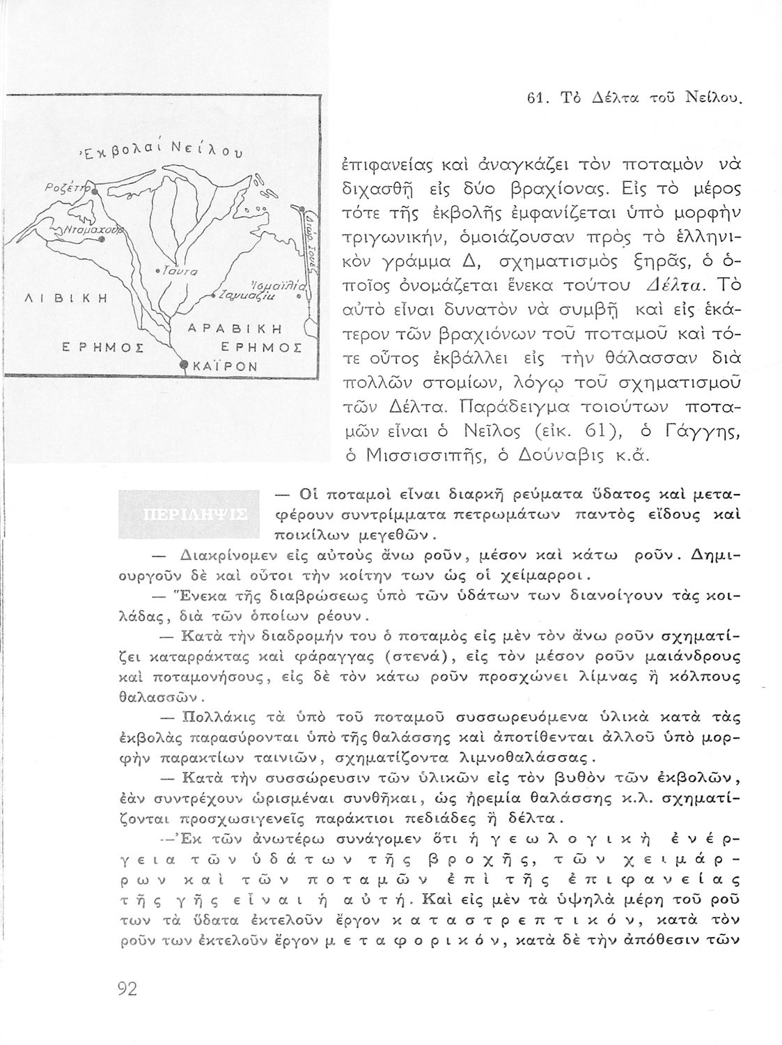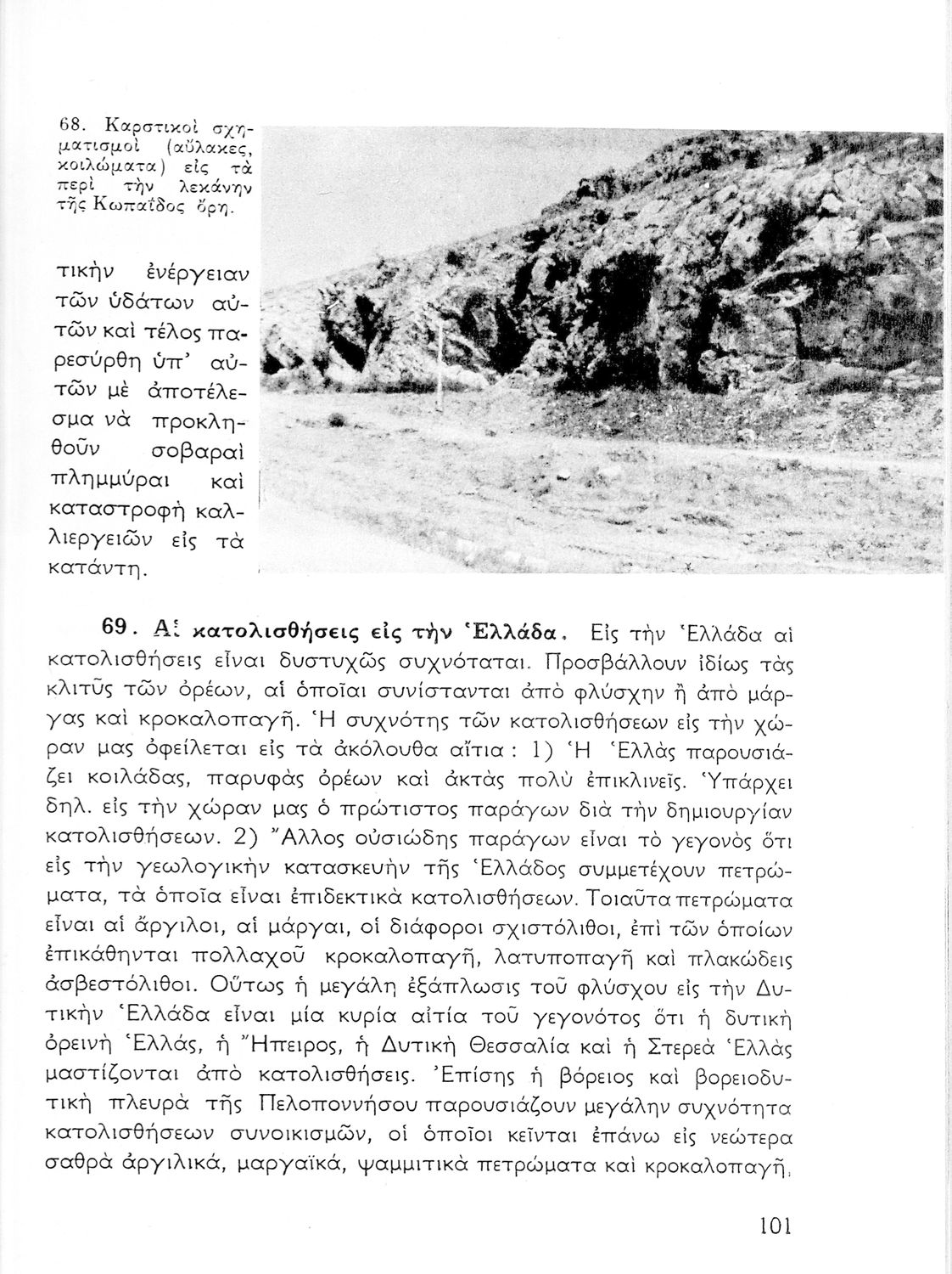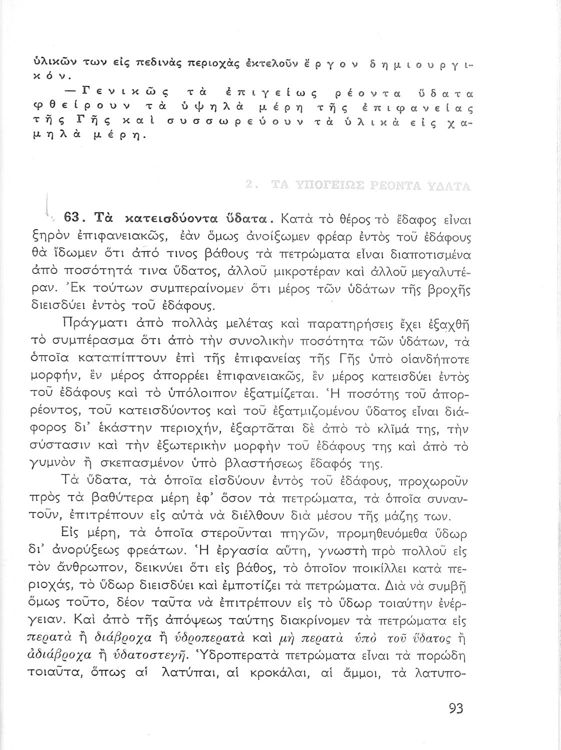 Σχολικό εγχειρίδιο Γεωλογίας/Ορυκτολογίας για τη Δ΄ Γυμνασίου που περιλαμβάνει χθονογραφική, δυναμική και ιστορική γεωλογία, και γενική και ειδική ορυκτολογία. Ο συγγραφέας ήταν καθηγητής πανεπιστημίου και η συγγραφέας φυσικός. Φέρει το σύμβολο της δικτατορίας. Περιέχει παράρτημα με «Στοιχεία Μαθηματικής Γεωγραφίας» από τη γεωγραφία Δ’ τάξης του Αλκίνοου Μάζη (εκδ. 1963).