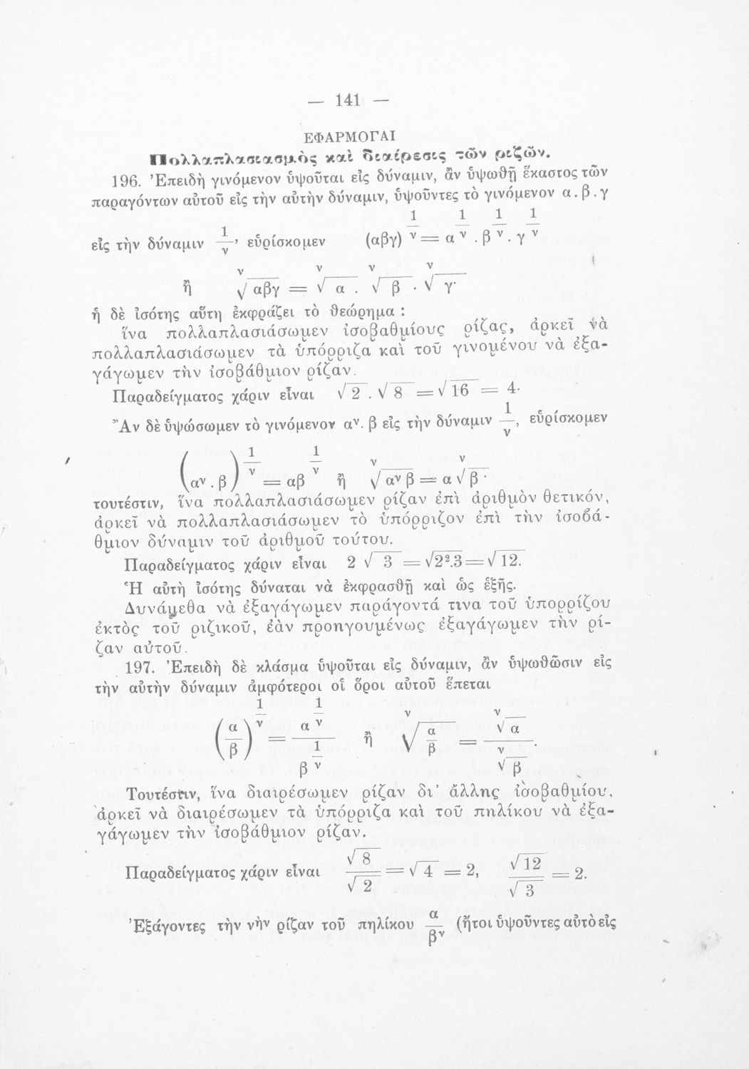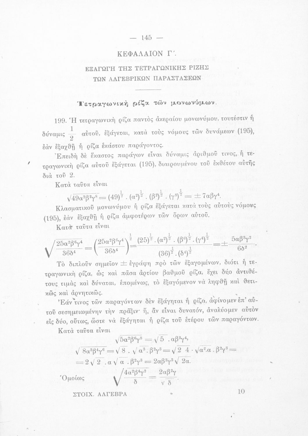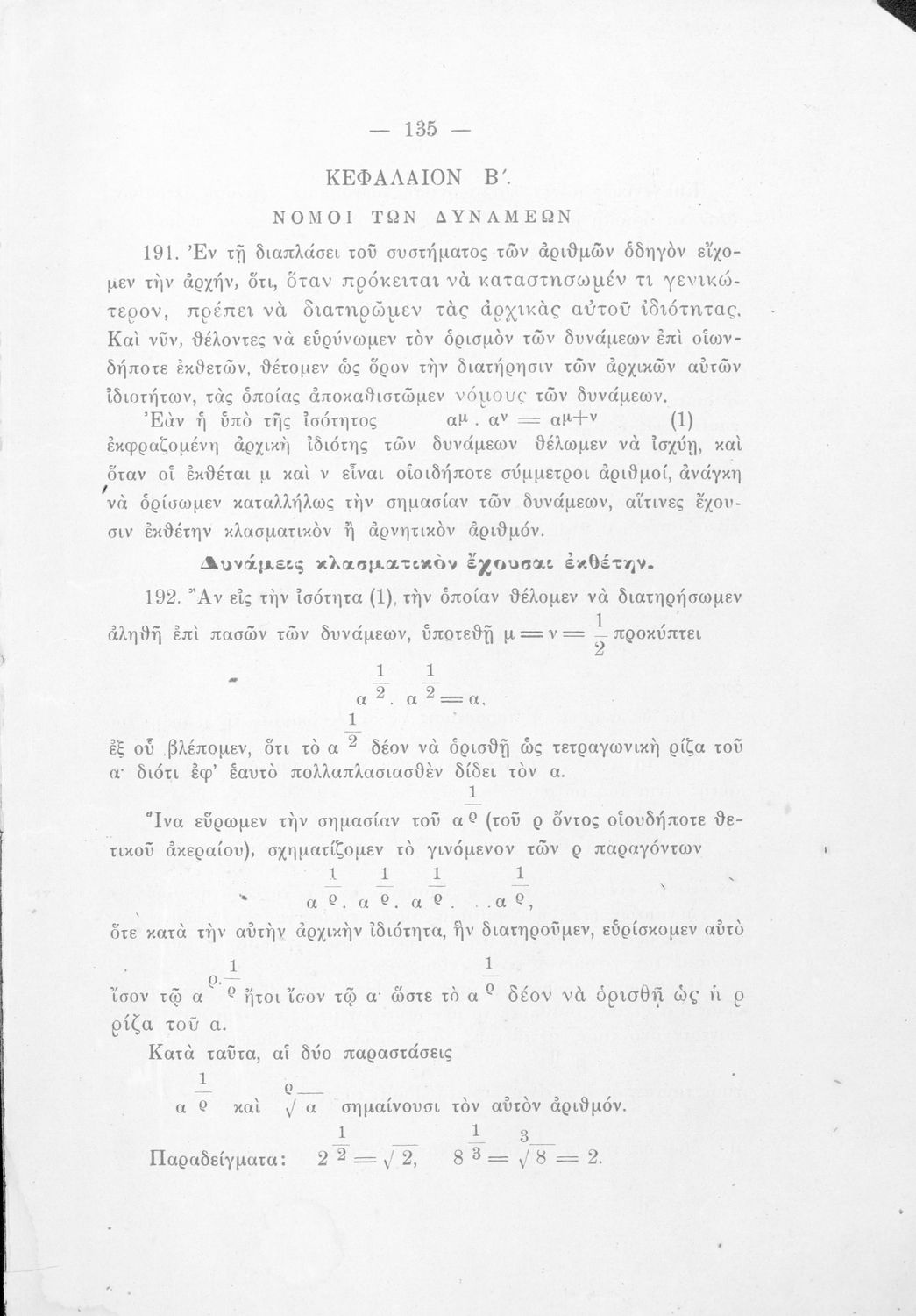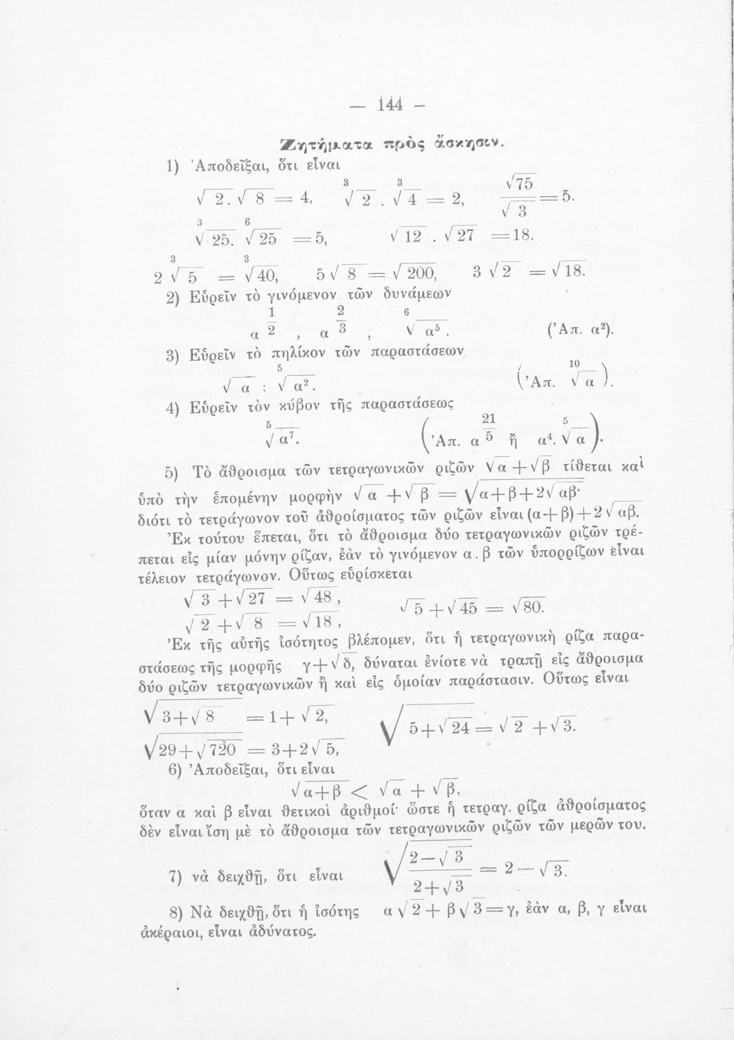 Σχολικό εγχειρίδιο Άλγεβρας Γυμνασίου που περιέχει θεωρία και ασκήσεις. Ο συγγραφέας ήταν υφηγητής στο Εθνικό Πανεπιστήμιο.