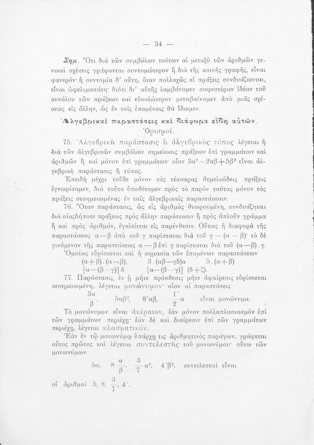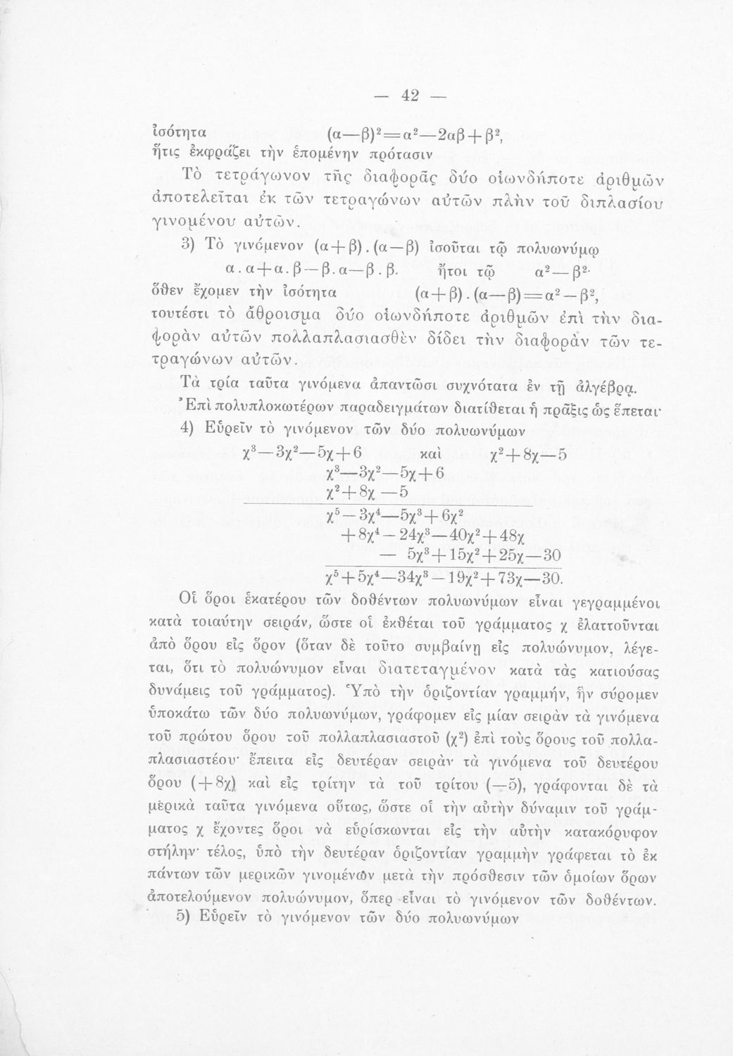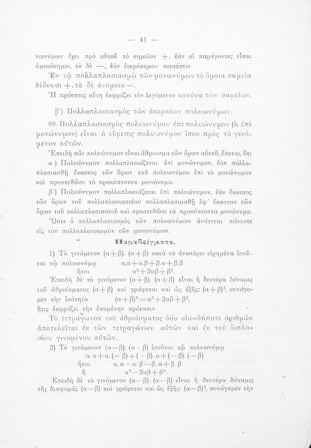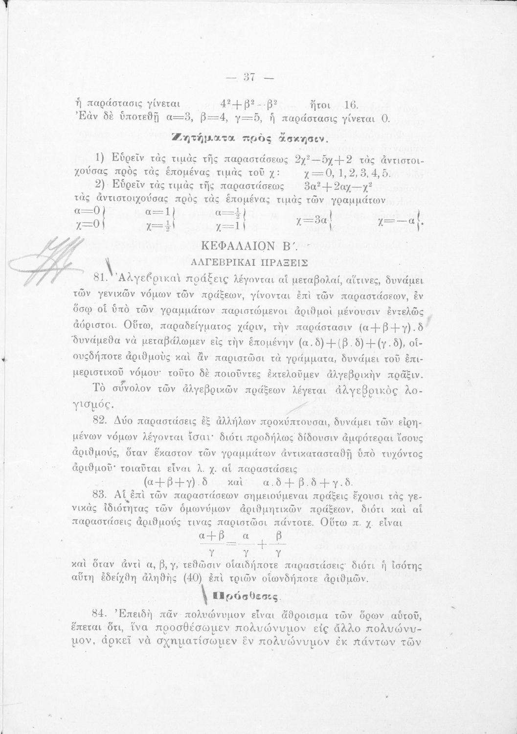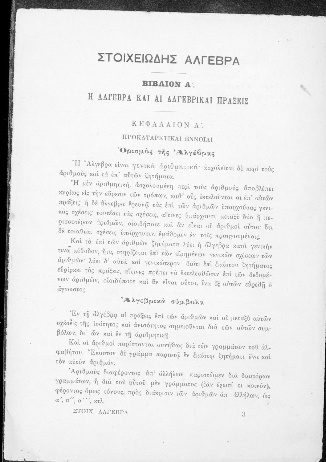 Σχολικό εγχειρίδιο Άλγεβρας Γυμνασίου που περιέχει θεωρία και ασκήσεις. Ο συγγραφέας ήταν υφηγητής στο Εθνικό Πανεπιστήμιο.