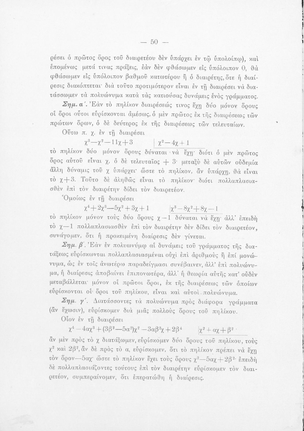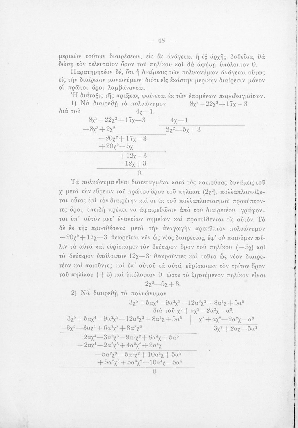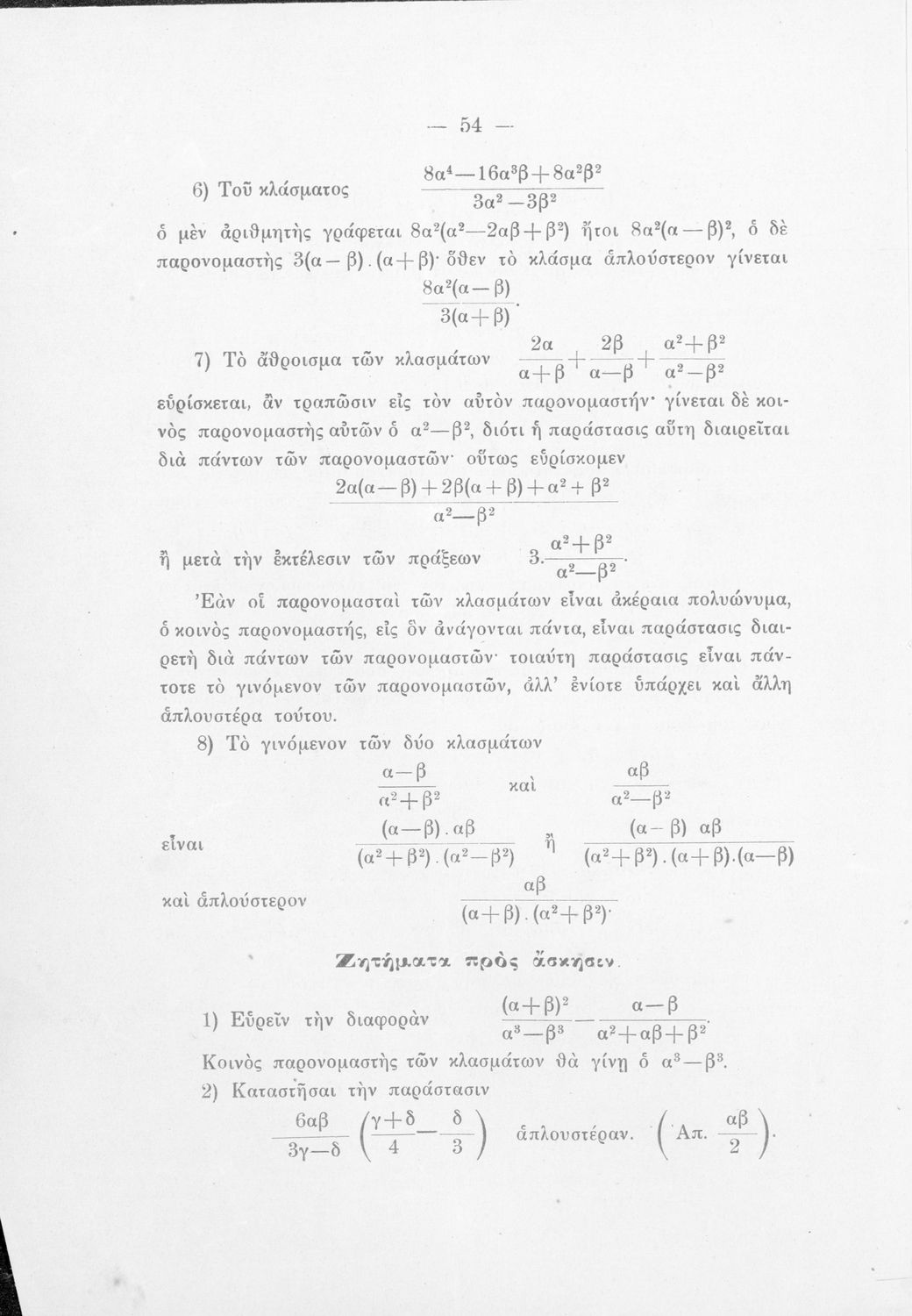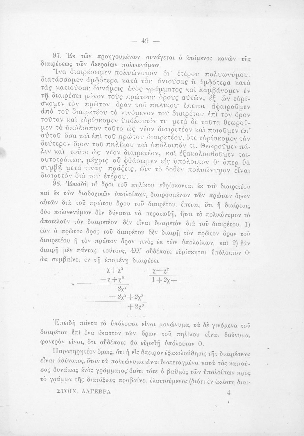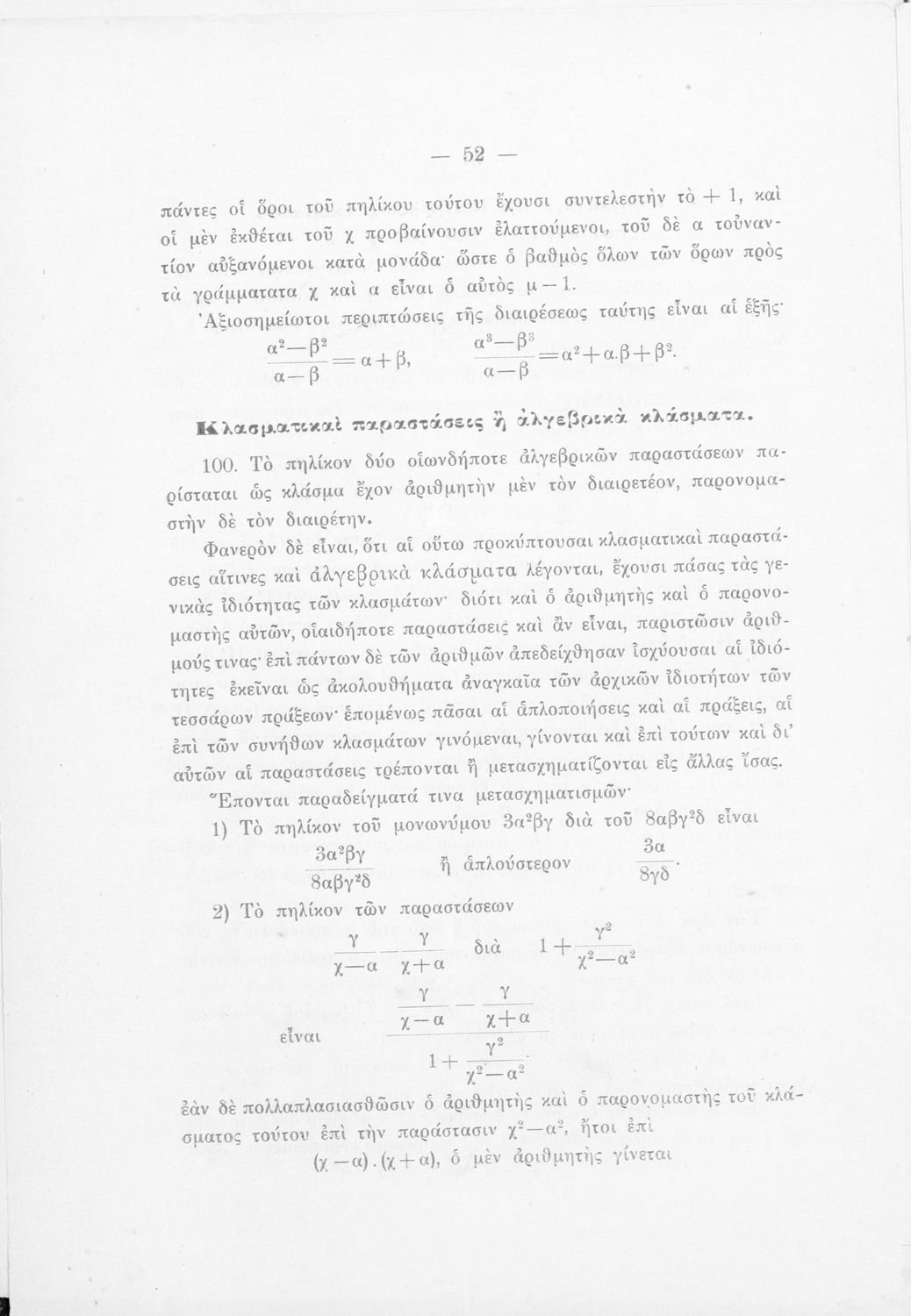 Σχολικό εγχειρίδιο Άλγεβρας Γυμνασίου που περιέχει θεωρία και ασκήσεις. Ο συγγραφέας ήταν υφηγητής στο Εθνικό Πανεπιστήμιο.