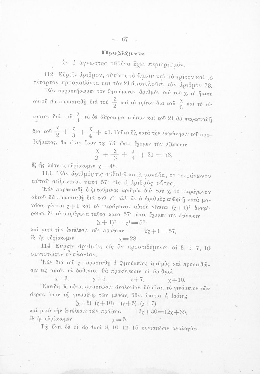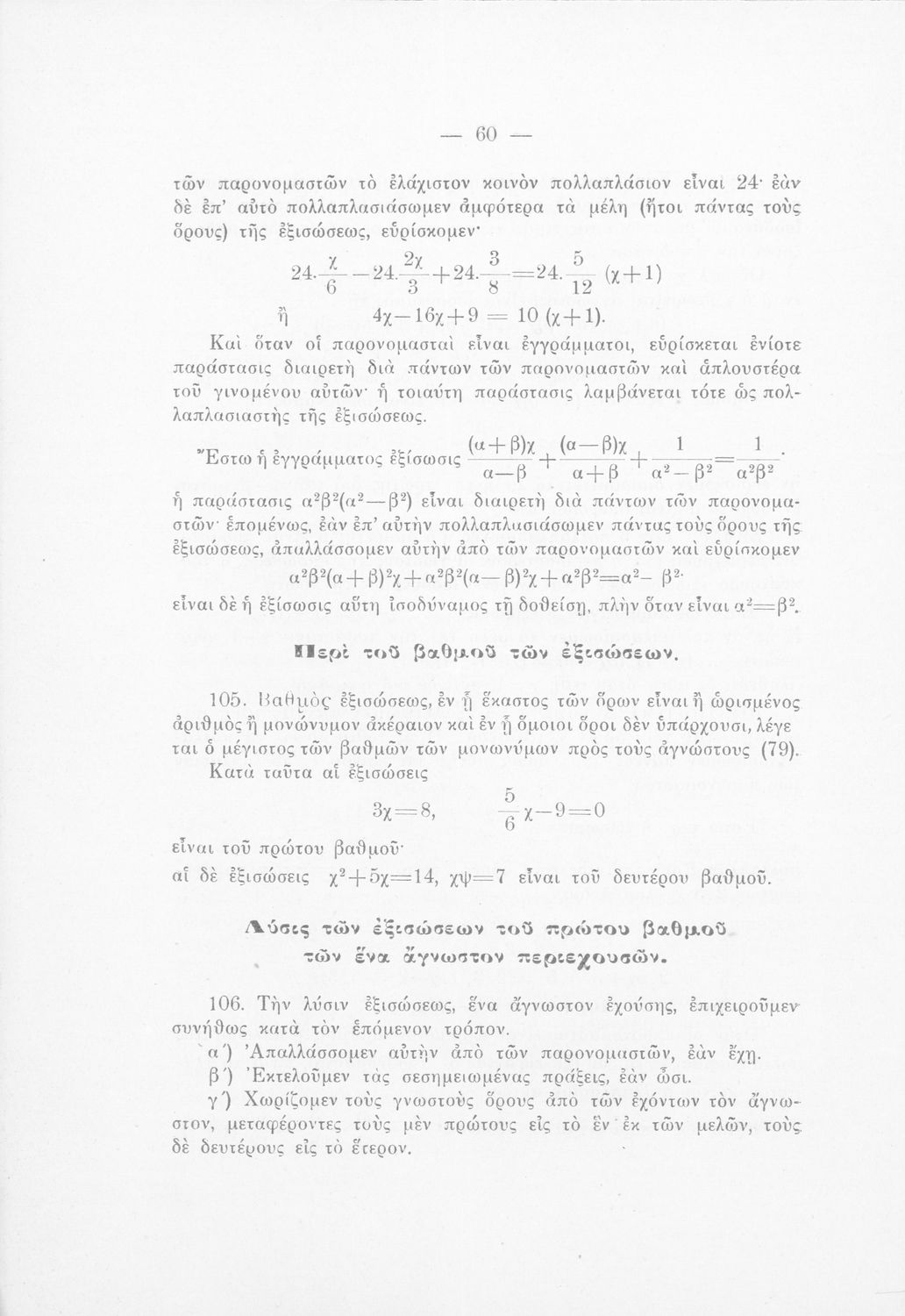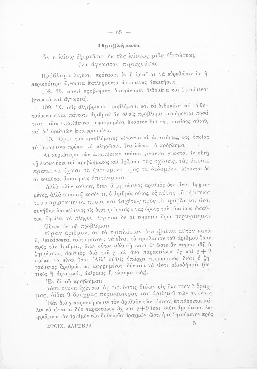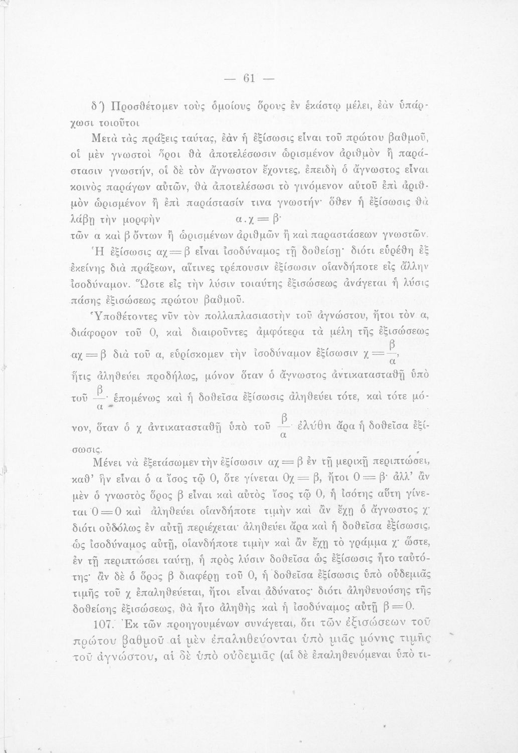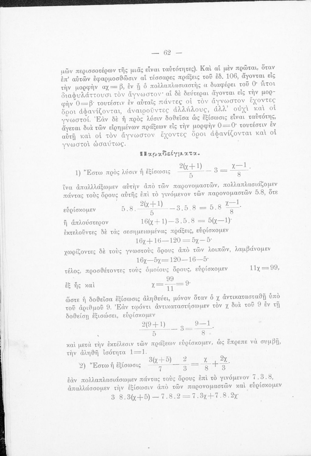 Σχολικό εγχειρίδιο Άλγεβρας Γυμνασίου που περιέχει θεωρία και ασκήσεις. Ο συγγραφέας ήταν υφηγητής στο Εθνικό Πανεπιστήμιο.