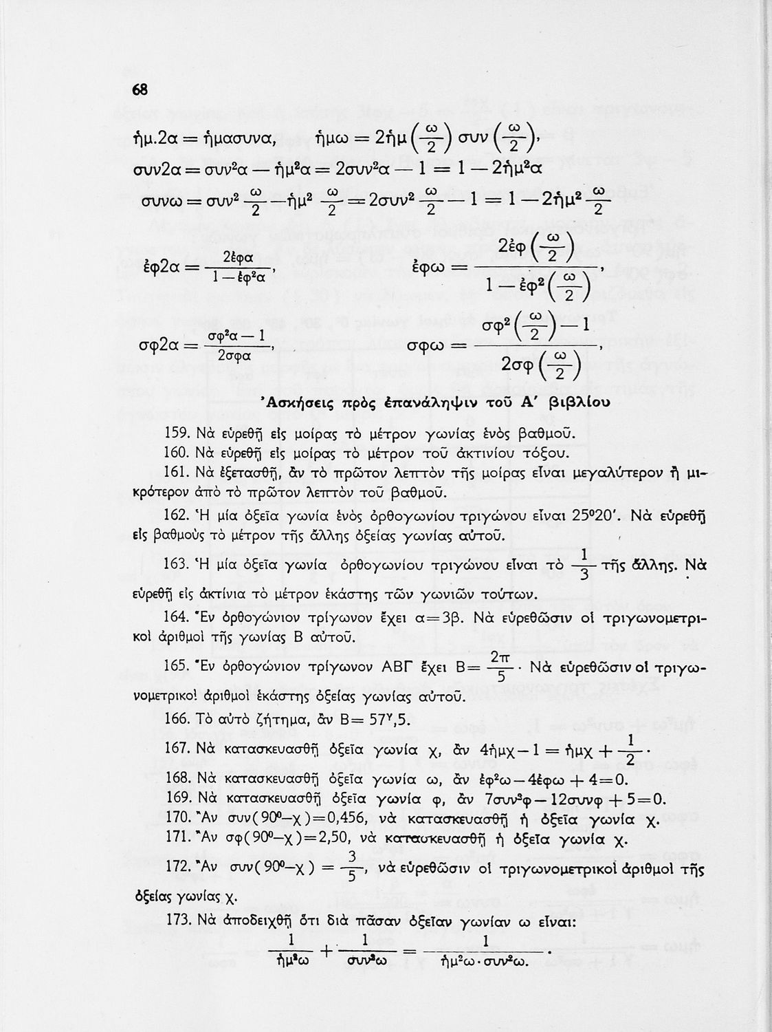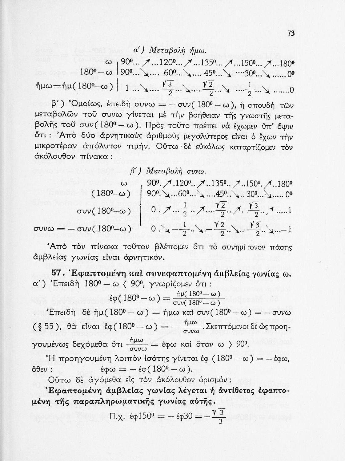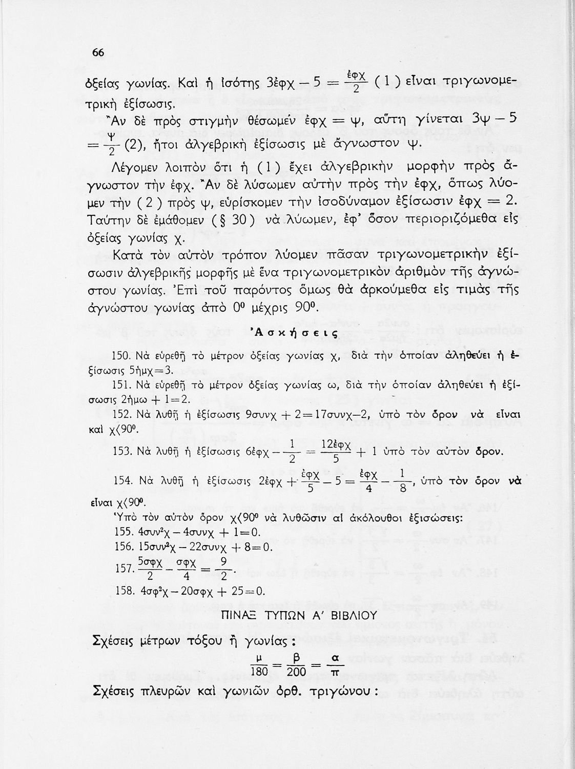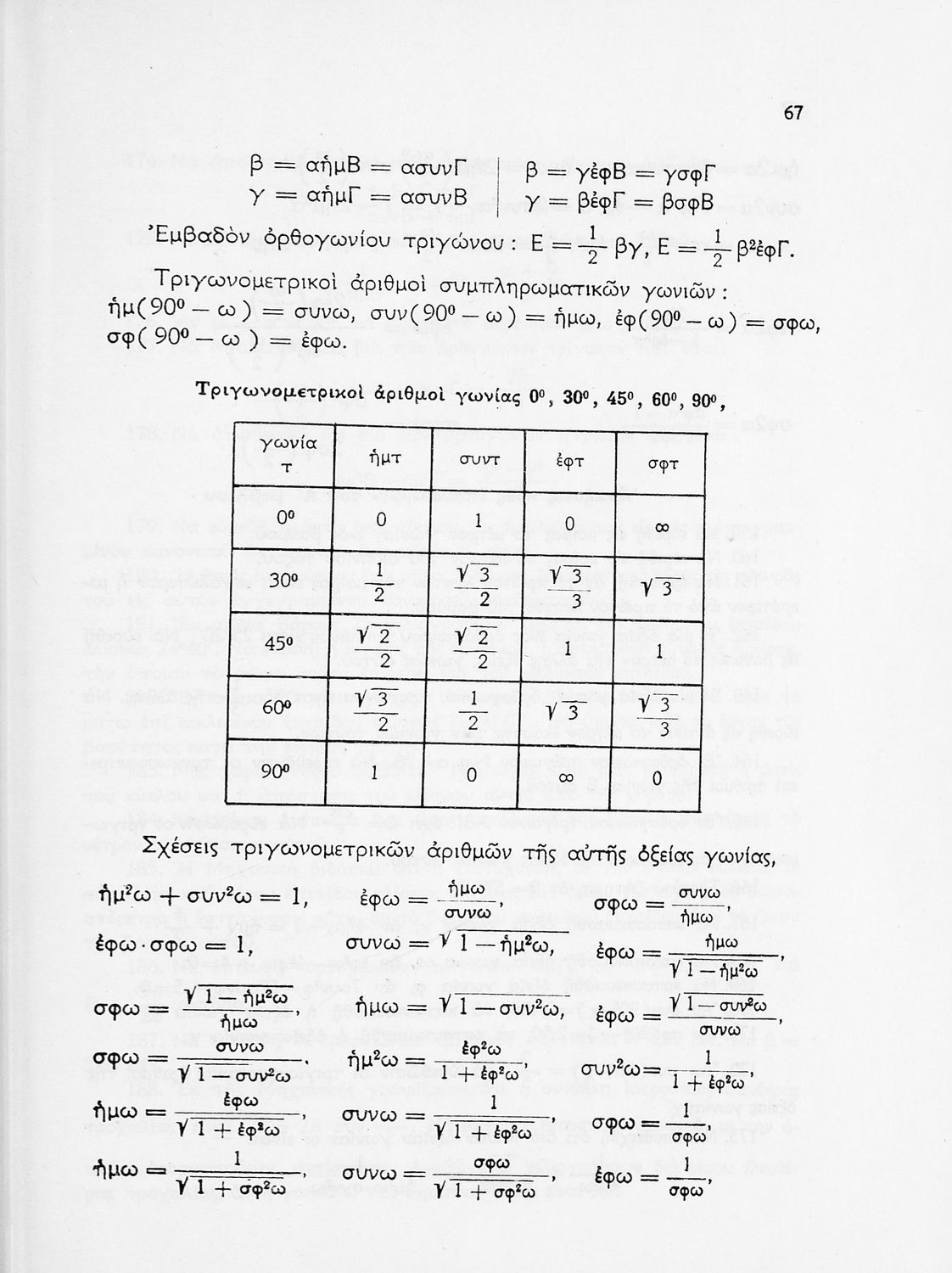 Σχολικό εγχειρίδιο Τριγωνομετρίας για τις Δ΄, Ε΄ και ΣΤ΄ Γυμνασίου που περιλαμβάνει θεωρία και ασκήσεις. Φέρει το σύμβολο της δικτατορίας.