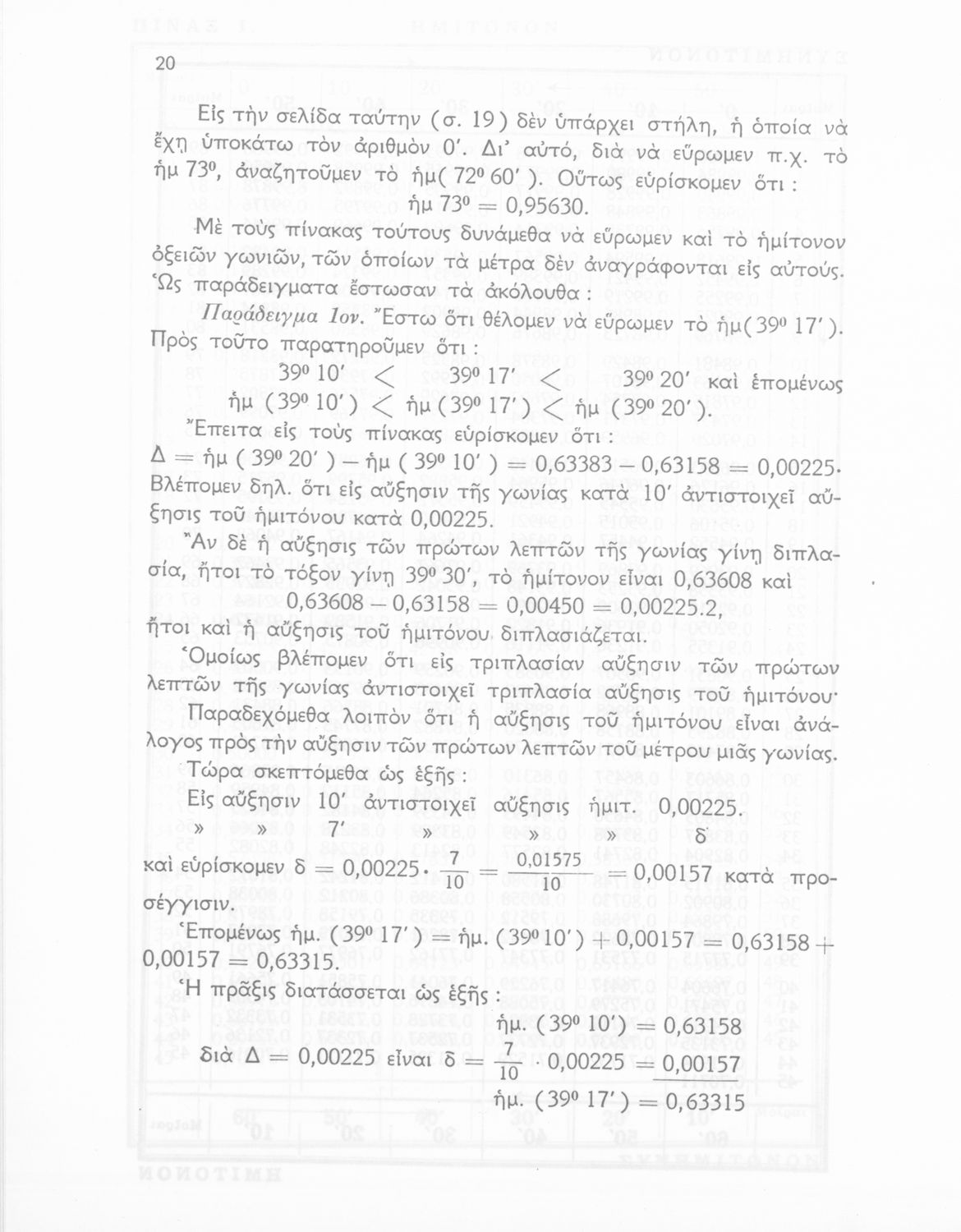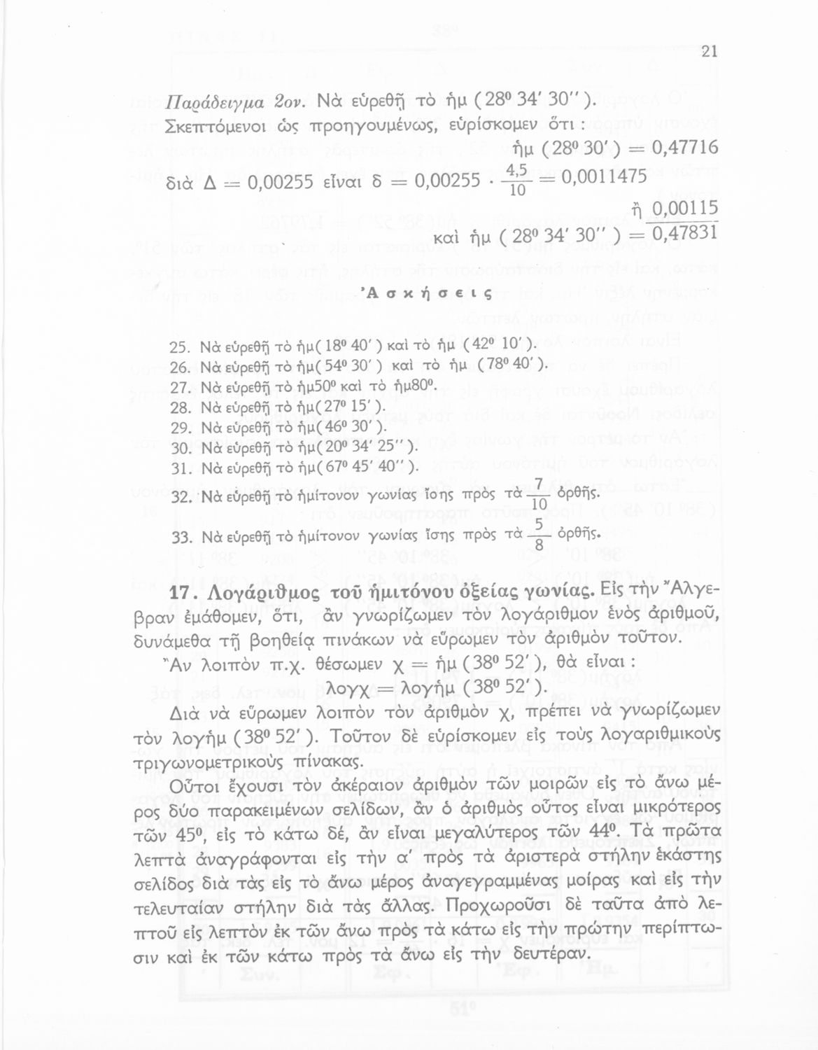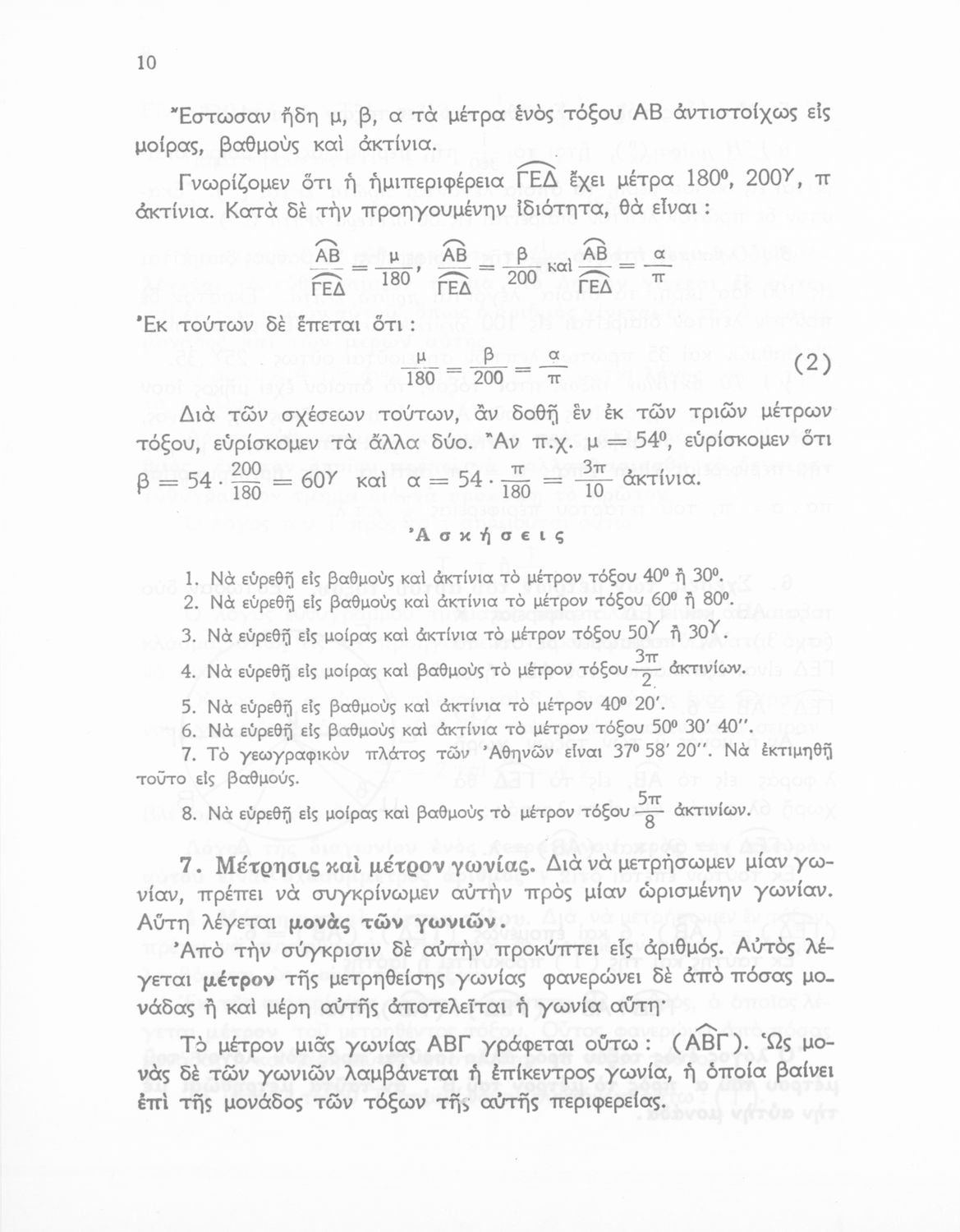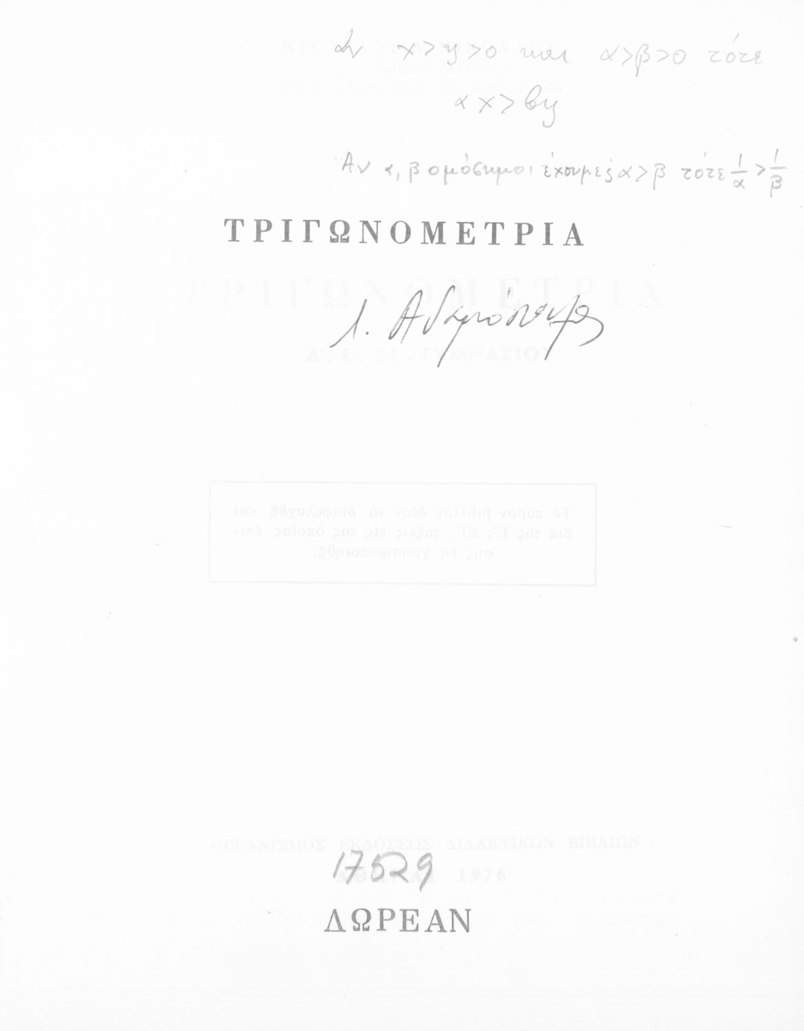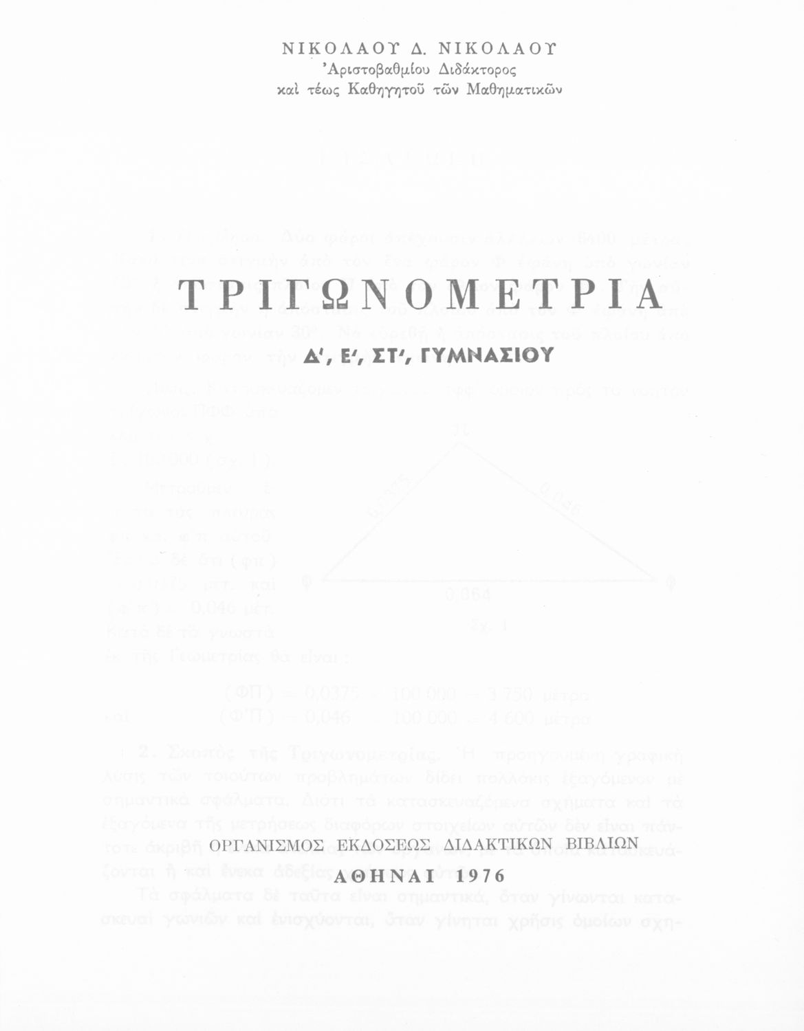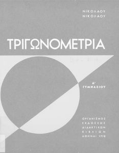 Σχολικό εγχειρίδιο Τριγωνομετρίας για τις Δ΄, Ε΄ και ΣΤ΄ Γυμνασίου που περιλαμβάνει θεωρία και ασκήσεις. Φέρει το σύμβολο της δικτατορίας.