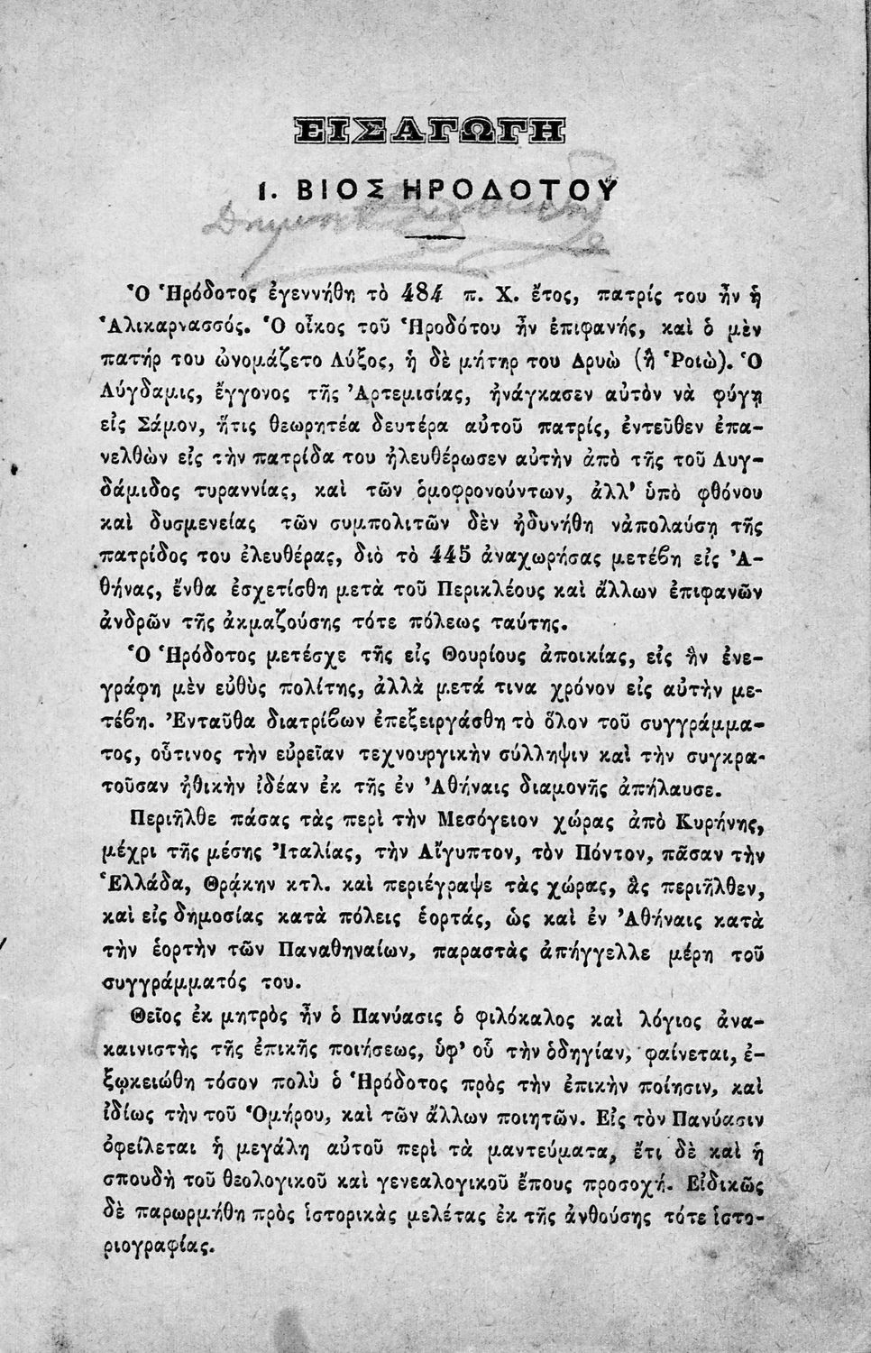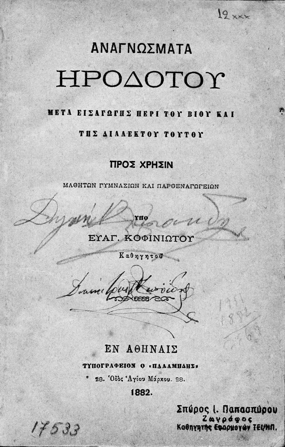 Σχολικό εγχειρίδιο Αρχαίων Ελληνικών για τους μαθητές των Γυμνασίων και Παρθεναγωγείων που περιέχει εισαγωγή στη ζωή και διάλεκτο του Ηρόδοτου, αποσπάσματα από το έργο του και ερμηνευτικές σημειώσεις.