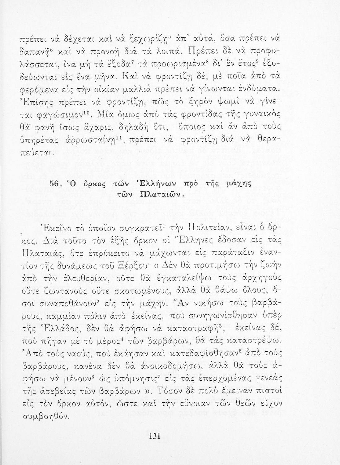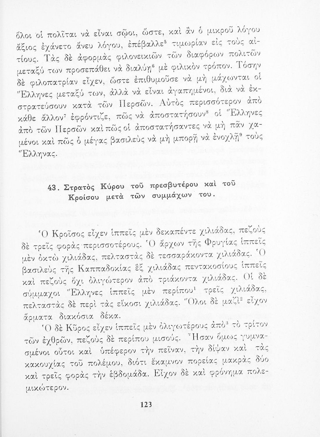 Σχολικό Εγχειρίδιο Αρχαίων Ελληνικών που περιλαμβάνει κείμενα προσαρμοσμένα στη διδασκαλία των γραμματικών και συντακτικών φαινομένων, και ερμηνευτικές και λεξιλογικές σημειώσεις. Φέρει το σύμβολο της δικτατορίας.