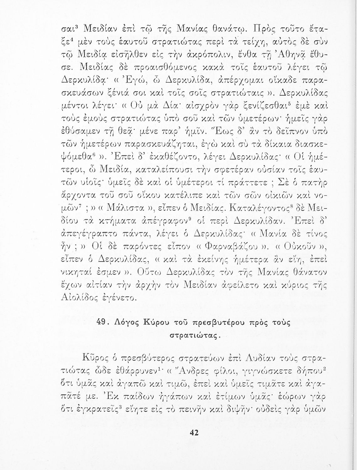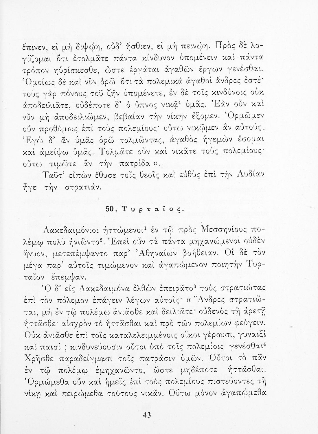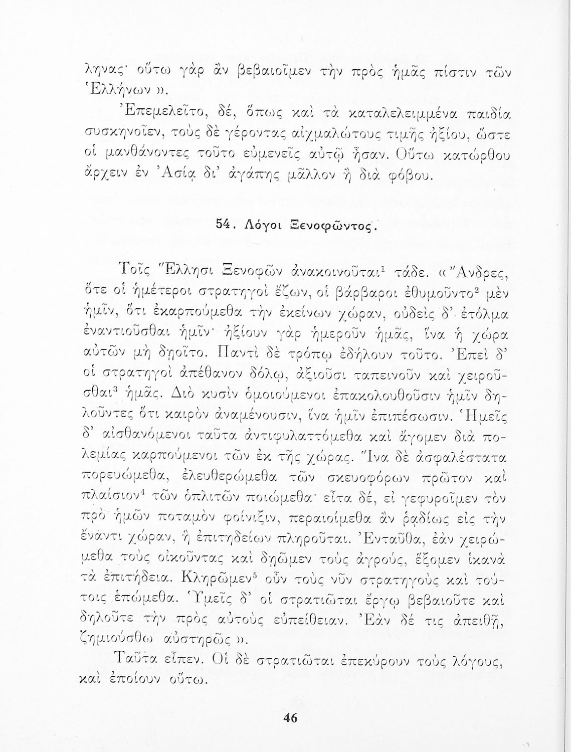 Σχολικό Εγχειρίδιο Αρχαίων Ελληνικών που περιλαμβάνει κείμενα προσαρμοσμένα στη διδασκαλία των γραμματικών και συντακτικών φαινομένων, και ερμηνευτικές και λεξιλογικές σημειώσεις. Φέρει το σύμβολο της δικτατορίας.
