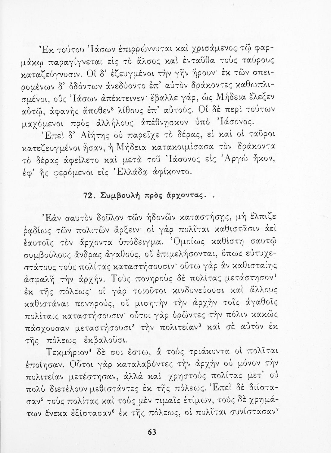 Σχολικό Εγχειρίδιο Αρχαίων Ελληνικών που περιλαμβάνει κείμενα προσαρμοσμένα στη διδασκαλία των γραμματικών και συντακτικών φαινομένων, και ερμηνευτικές και λεξιλογικές σημειώσεις. Φέρει το σύμβολο της δικτατορίας.