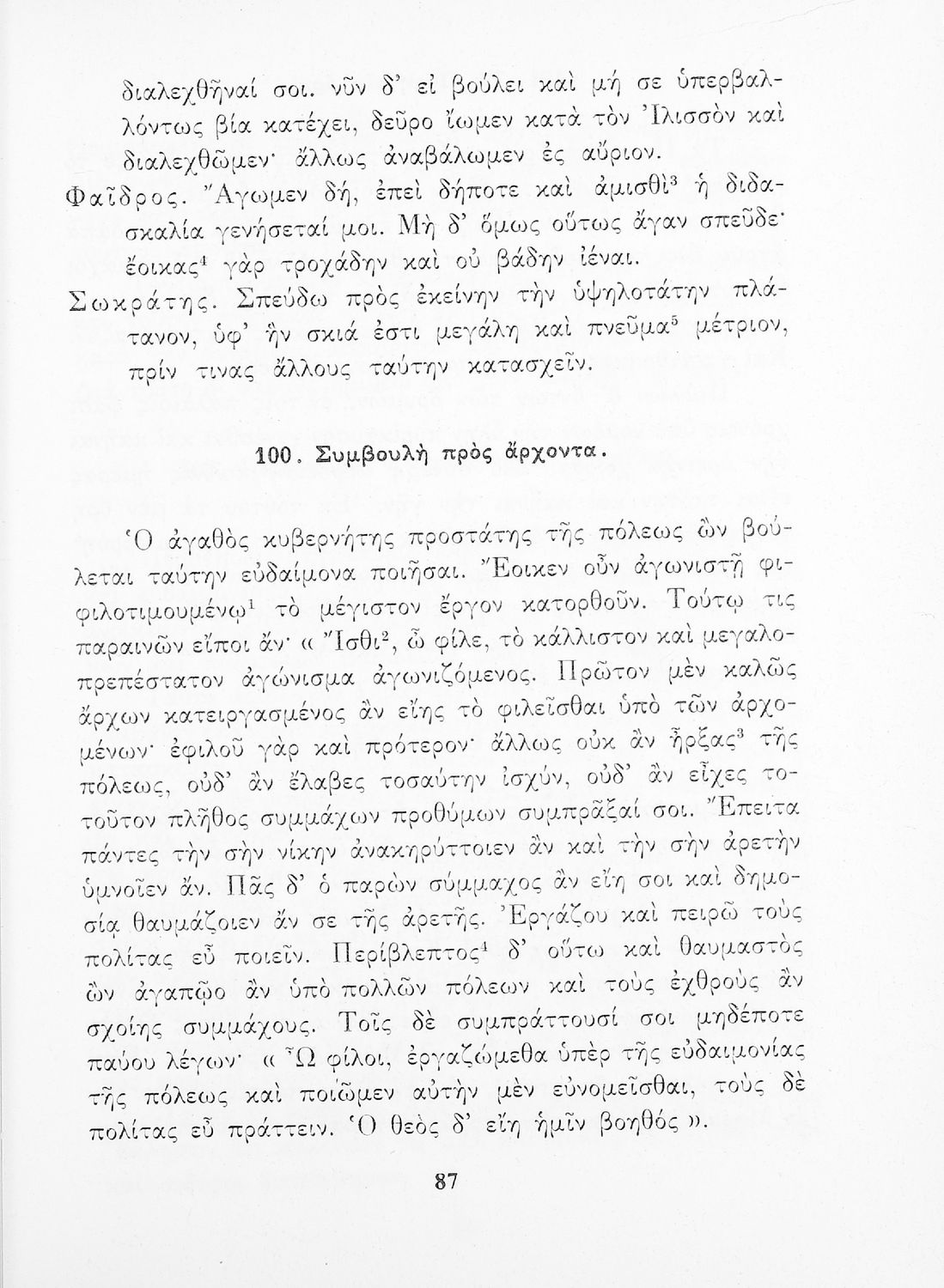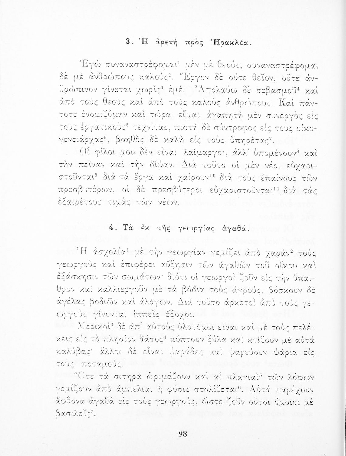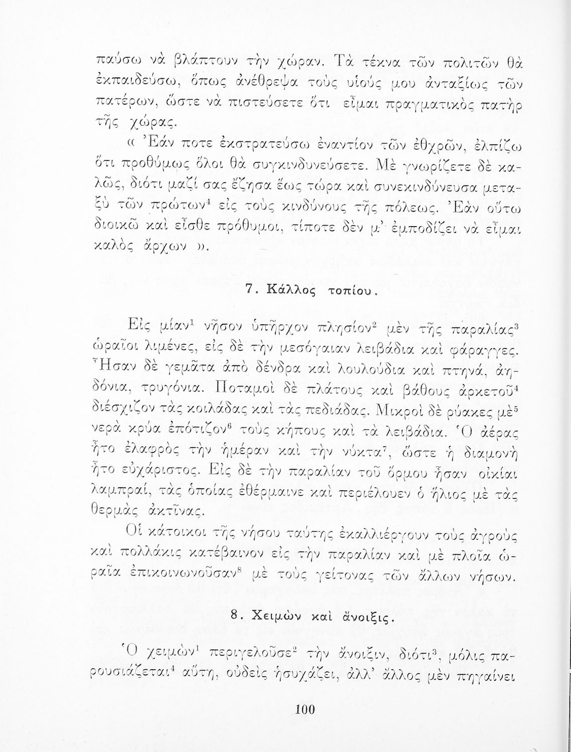 Σχολικό Εγχειρίδιο Αρχαίων Ελληνικών που περιλαμβάνει κείμενα προσαρμοσμένα στη διδασκαλία των γραμματικών και συντακτικών φαινομένων, και ερμηνευτικές και λεξιλογικές σημειώσεις. Φέρει το σύμβολο της δικτατορίας.