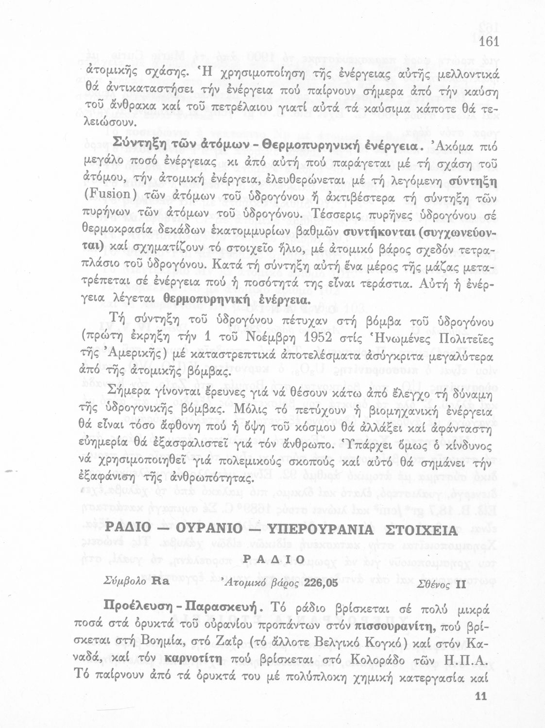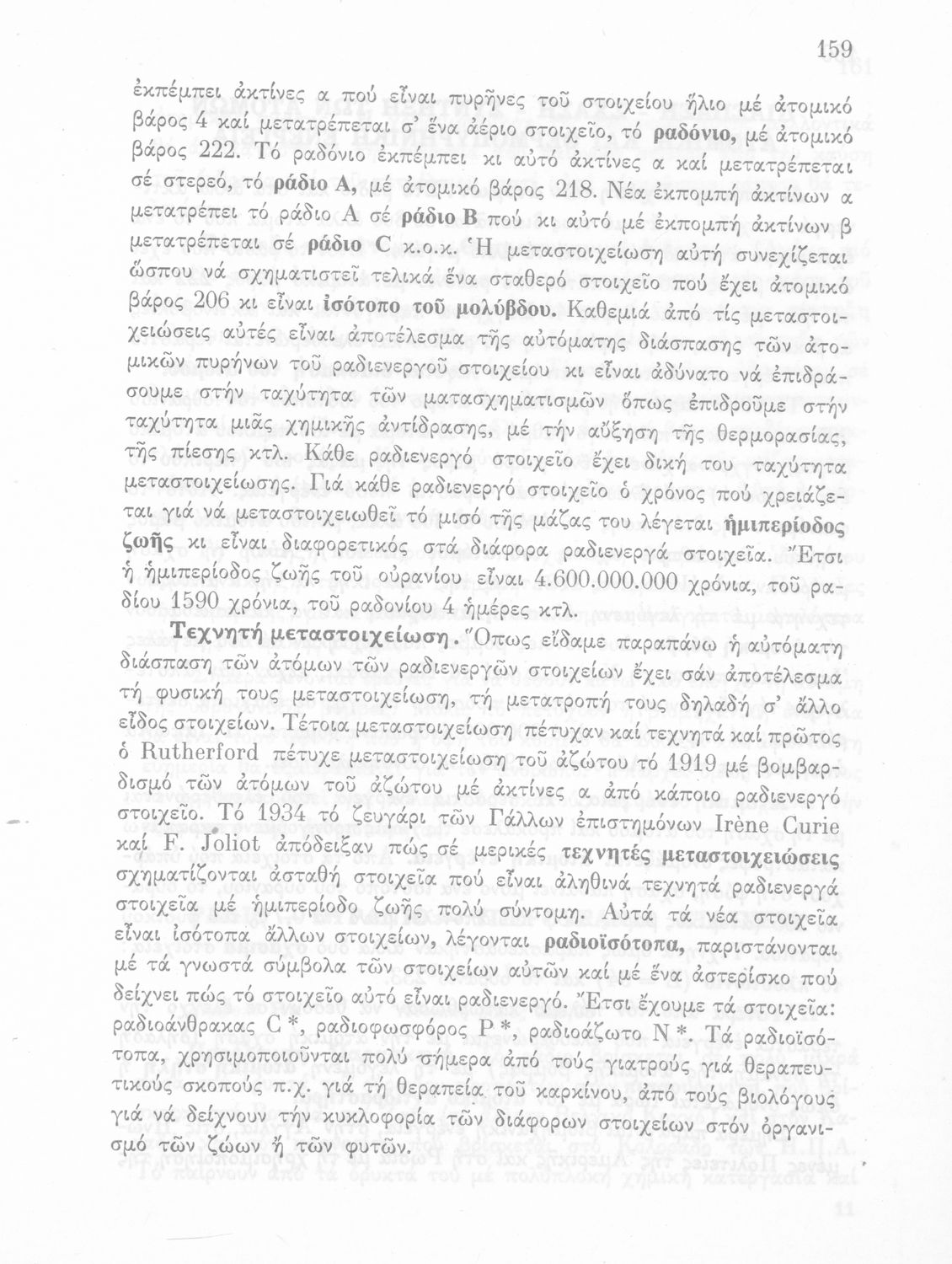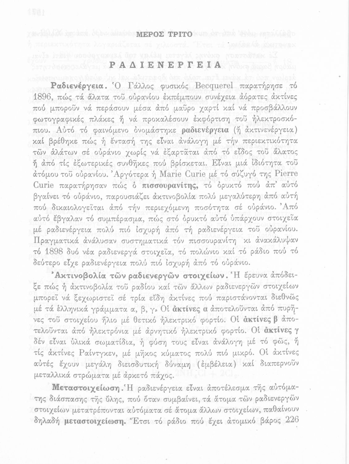 Σχολικό εγχειρίδιο Χημείας που απευθύνεται σε μαθητές Γυμνασίου με σκοπό τη περιγραφή εισαγωγικών εννοιών χημείας (ύλη, νόμοι χημείας, χημικές αντιδράσεις-εξισώσεις-ενώσεις). Στο βιβλίο γίνεται αναλυτική περιγραφή στοιχείων μετάλλων και αμέταλλων περιγράφοντας τις ιδιότητες και τις ενώσεις τους. Τέλος προσδιορίζεται η ακτινοβολία ραδιενεργών σωμάτων.