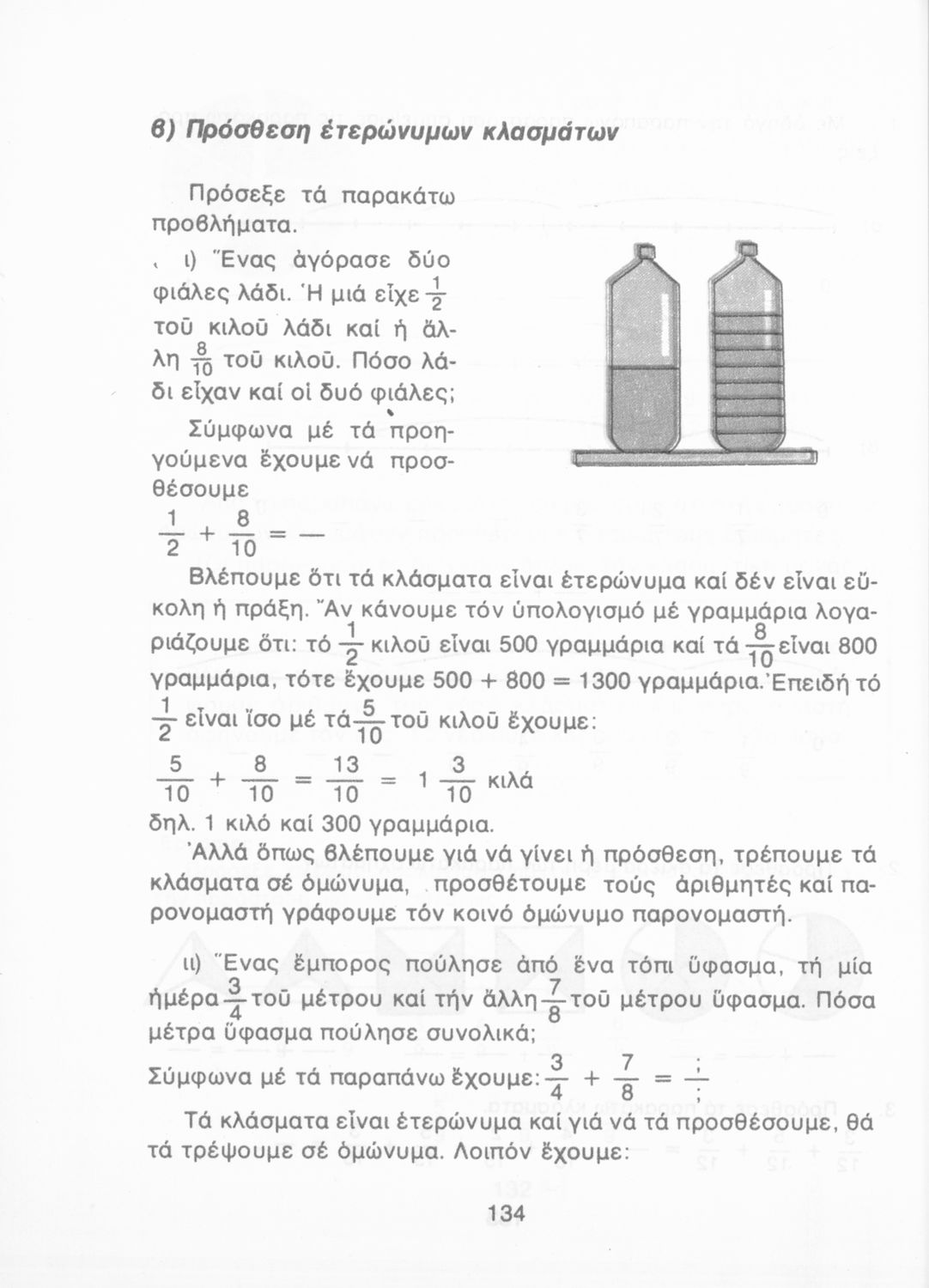 Σχολικό εγχειρίδιο Μαθηματικών Ε΄ Δημοτικού που εστιάζει στα προβλήματα αριθμητικής με κλάσματα και περιέχει ασκήσεις και προβλήματα γεωμετρίας.