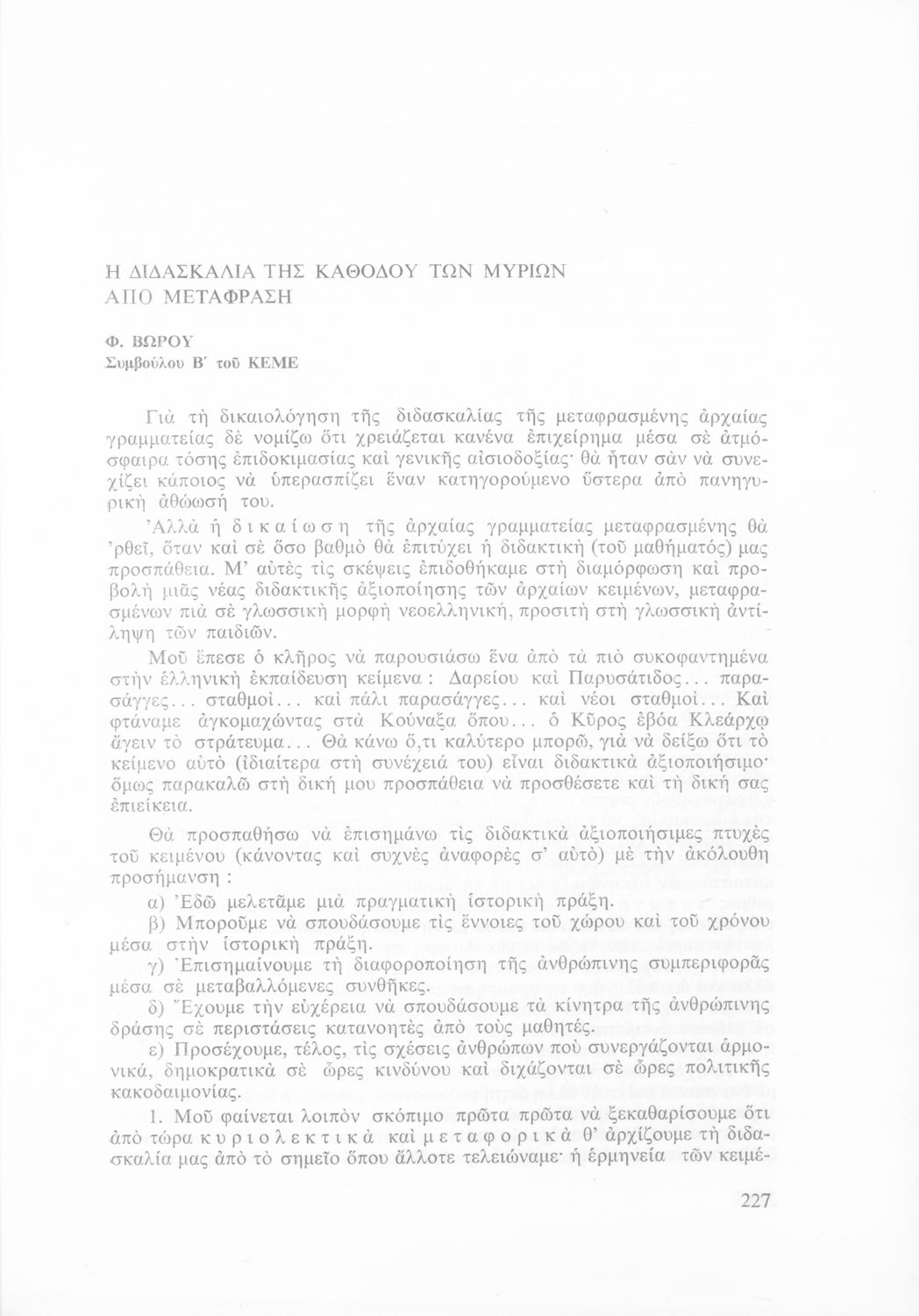 Βαθμίδα εκπαίδευσης: Δευτεροβάθμια Μάθημα: Αρχαία Ελληνικά Γλώσσα: Δημοτική Παρουσίαση περιεχομένου: Έκδοση του ΚΕΜΕ που αποσκοπεί στην "άμβλυνση των προβλημάτων που έχουν προκύψει από τη διδασκαλία των αρχαίων κειμένων από μεταφράσεις και τη διδασκαλία της νεοελληνικής γλώσσας και γραμματείας". |