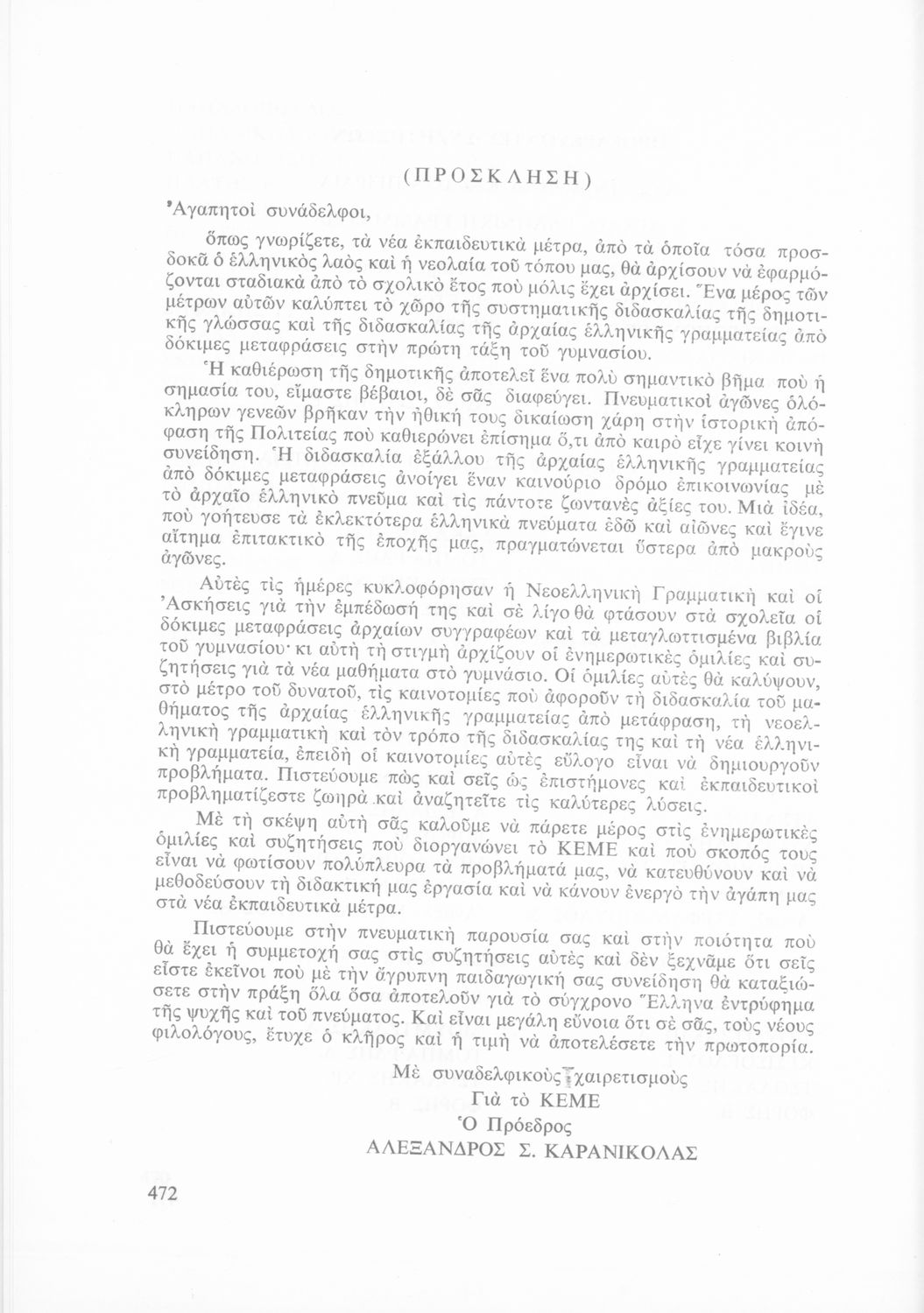 Παρουσίαση περιεχομένου: Έκδοση του ΚΕΜΕ που αποσκοπεί στην "άμβλυνση των προβλημάτων που έχουν προκύψει από τη διδασκαλία των αρχαίων κειμένων από μεταφράσεις και τη διδασκαλία της νεοελληνικής γλώσσας και γραμματείας".