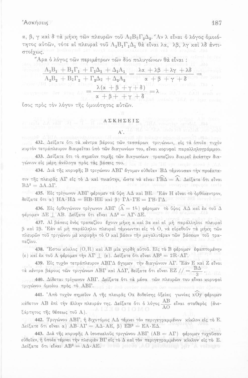Σχολικό εγχειρίδιο Γεωμετρίας για τις Γ΄, Δ΄, Ε΄, ΣΤ΄ Γυμνασίου που περιλαμβάνει θεωρία και ασκήσεις και είναι χωρισμένο σε Επιπεδομετρία και Στερεομετρία.