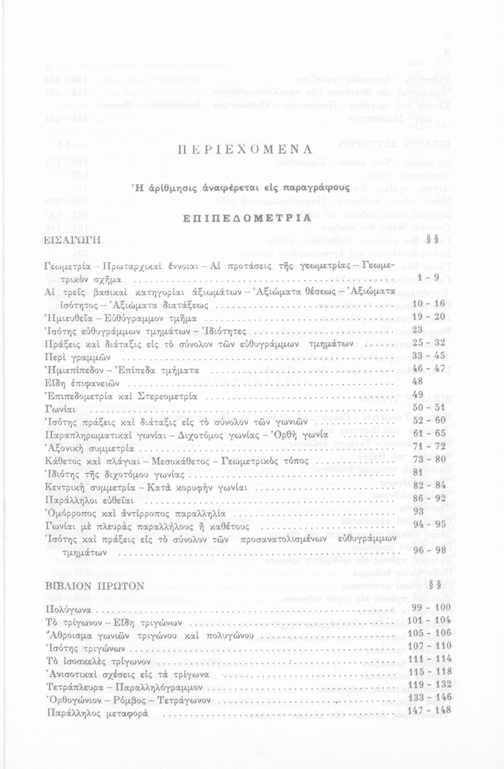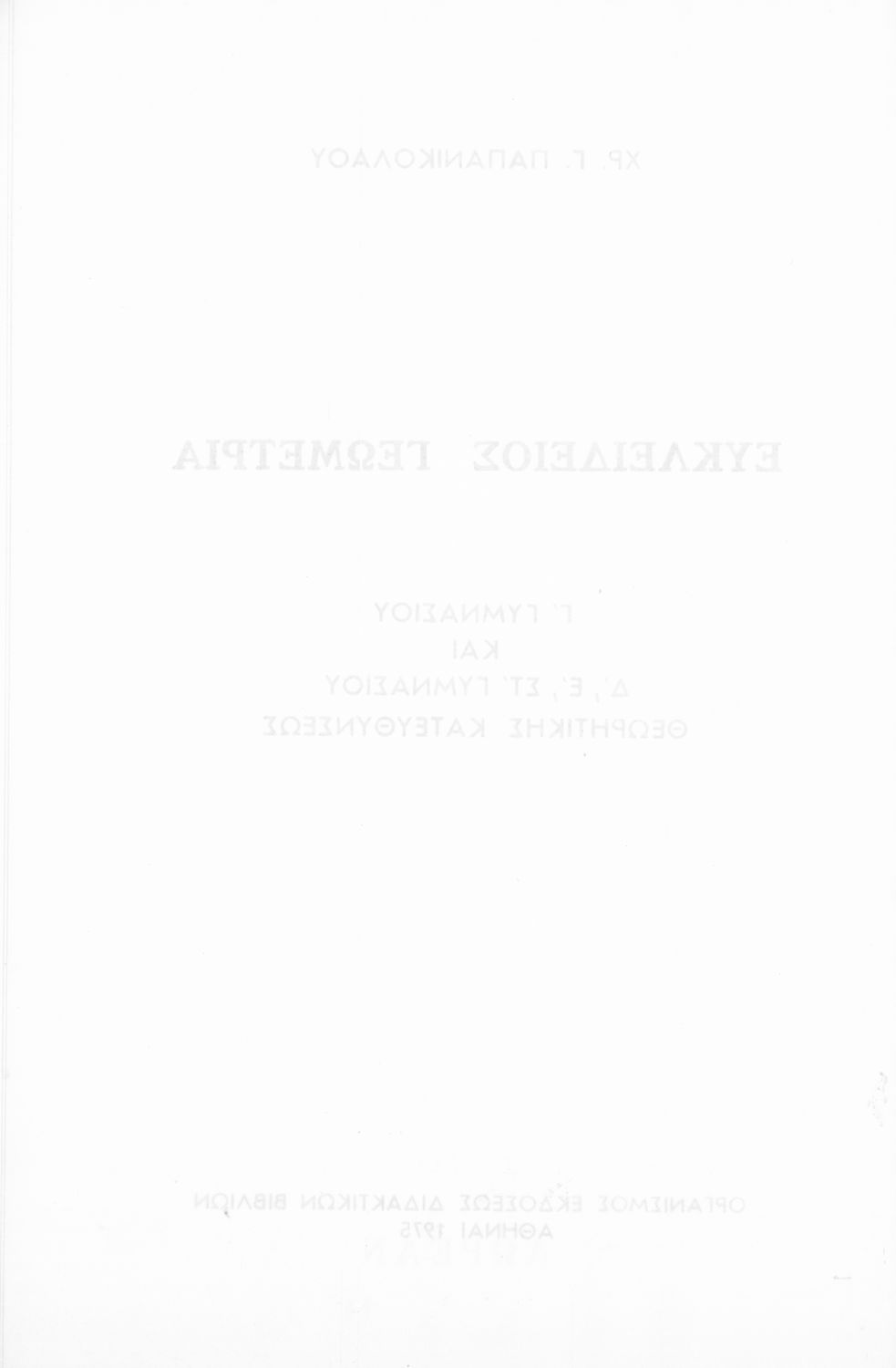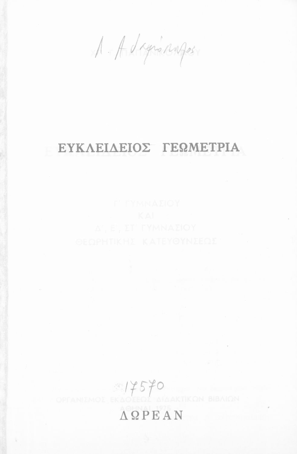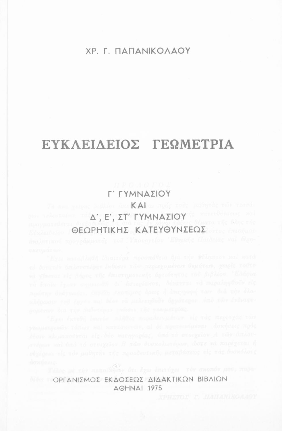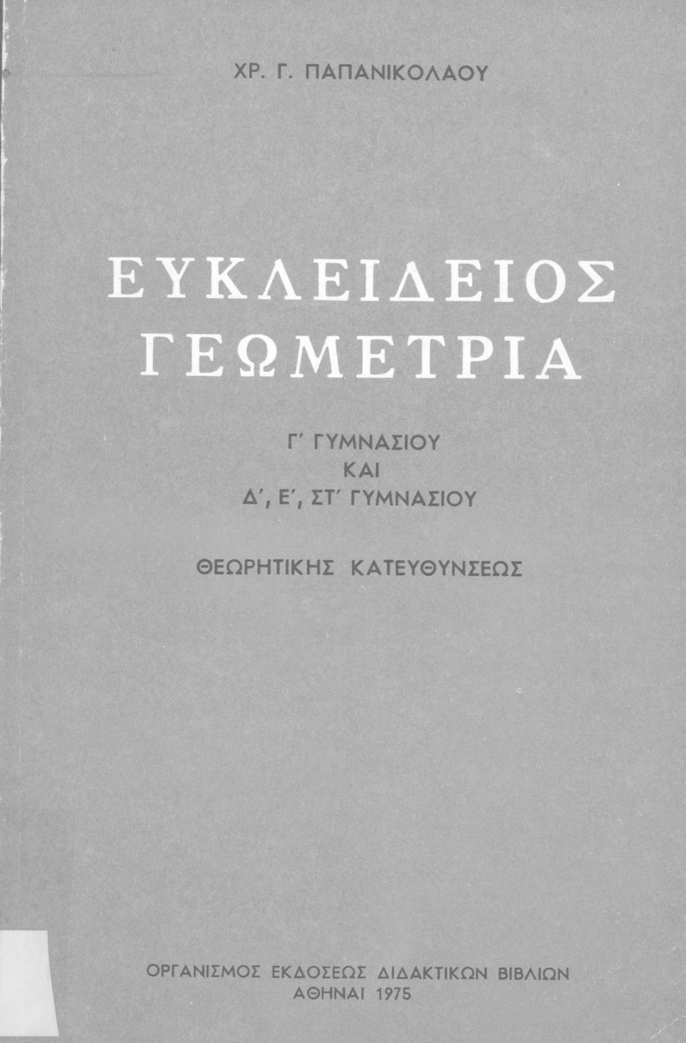 Σχολικό εγχειρίδιο Γεωμετρίας για τις Γ΄, Δ΄, Ε΄, ΣΤ΄ Γυμνασίου που περιλαμβάνει θεωρία και ασκήσεις και είναι χωρισμένο σε Επιπεδομετρία και Στερεομετρία.
