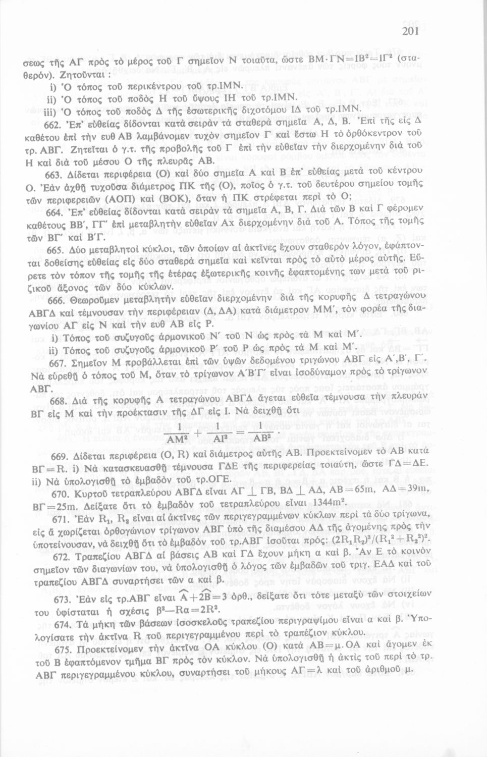 Σχολικό εγχειρίδιο Γεωμετρίας για τις Γ΄, Δ΄, Ε΄, ΣΤ΄ Γυμνασίου που περιλαμβάνει θεωρία και ασκήσεις και είναι χωρισμένο σε Επιπεδομετρία και Στερεομετρία. Φέρει το σύμβολο της δικτατορίας.
