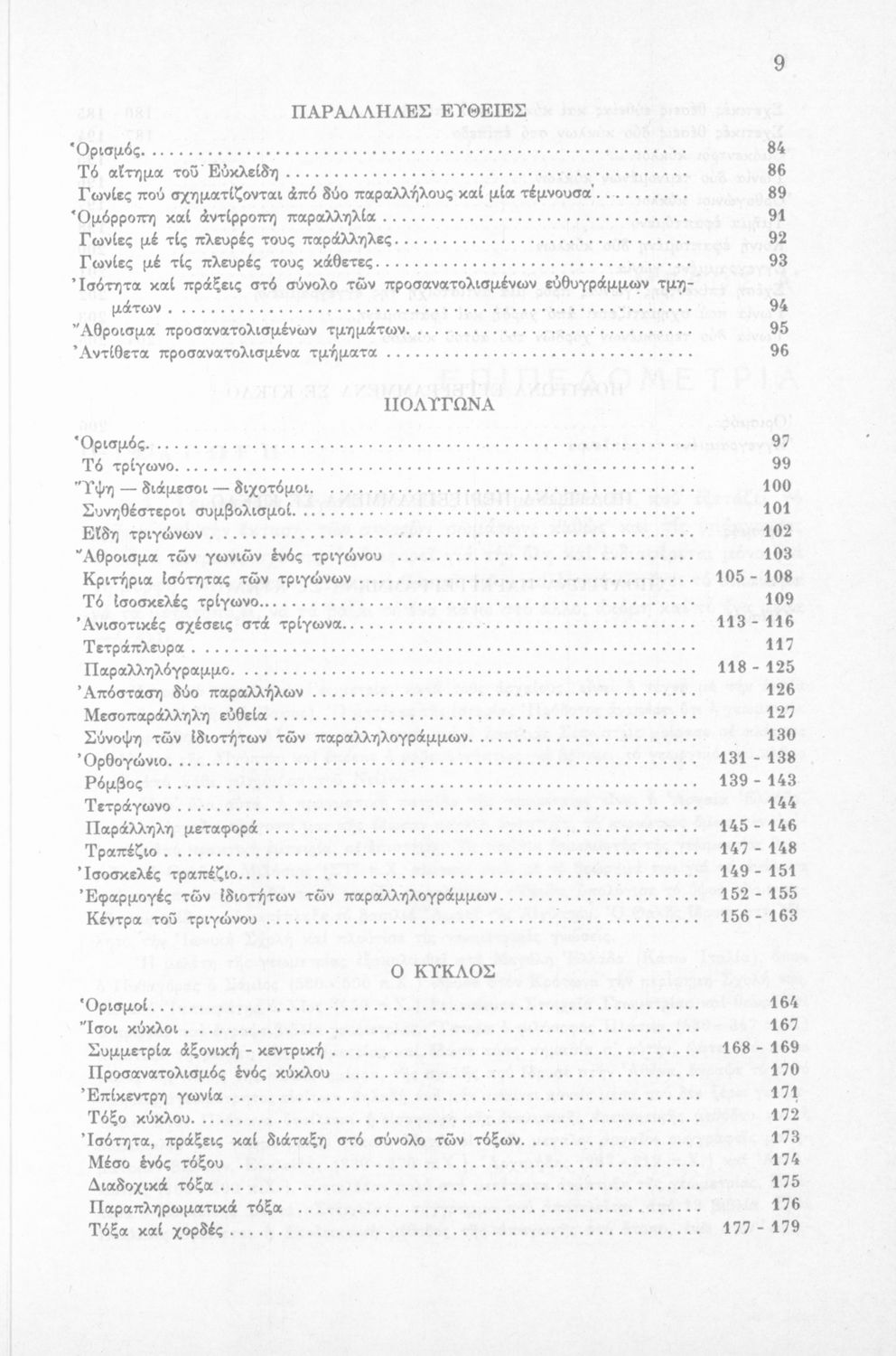 Σχολικό εγχειρίδιο Γεωμετρίας για τις Γ΄, Δ΄, Ε΄, ΣΤ΄ Γυμνασίου που περιλαμβάνει θεωρία και ασκήσεις και είναι χωρισμένο σε Επιπεδομετρία και Στερεομετρία.