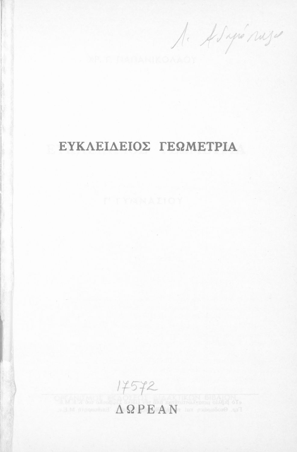 Σχολικό εγχειρίδιο Γεωμετρίας για τις Γ΄, Δ΄, Ε΄, ΣΤ΄ Γυμνασίου που περιλαμβάνει θεωρία και ασκήσεις και είναι χωρισμένο σε Επιπεδομετρία και Στερεομετρία. Φέρει το σύμβολο της δικτατορίας.